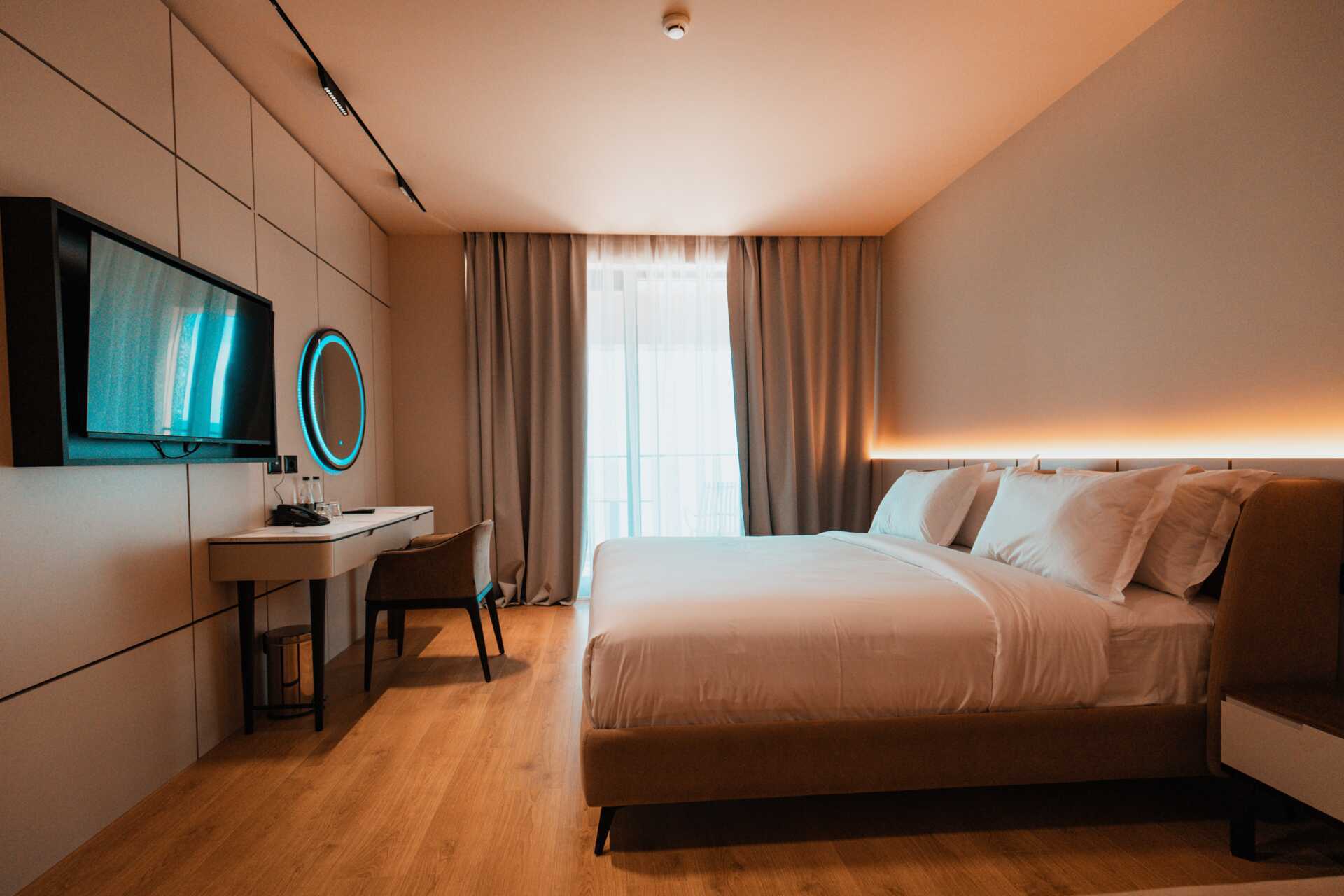 Dobbeltrom med balkong, noen med havutsikt. En dobbeltseng eller to enkeltsenger. Mulig med ekstraseng i oppredbar lenestol eller feltseng. Wifi, luftkondisjonering og safe inkludert. Kjøleskap. TV. Hårføner. Dusj og wc. Rengjøring 7 ggr/uke.