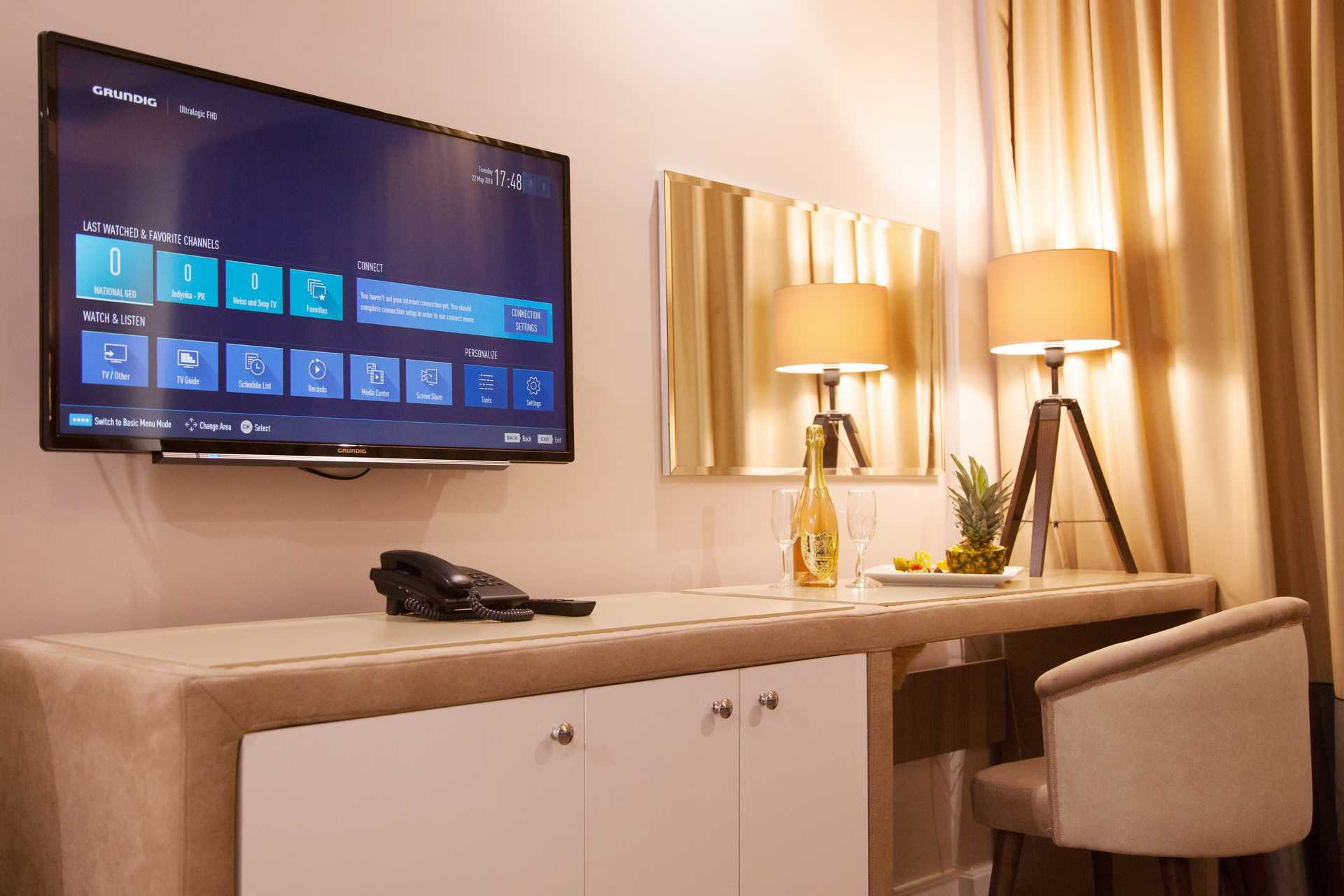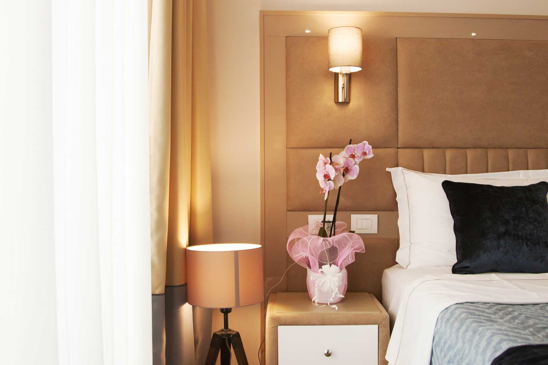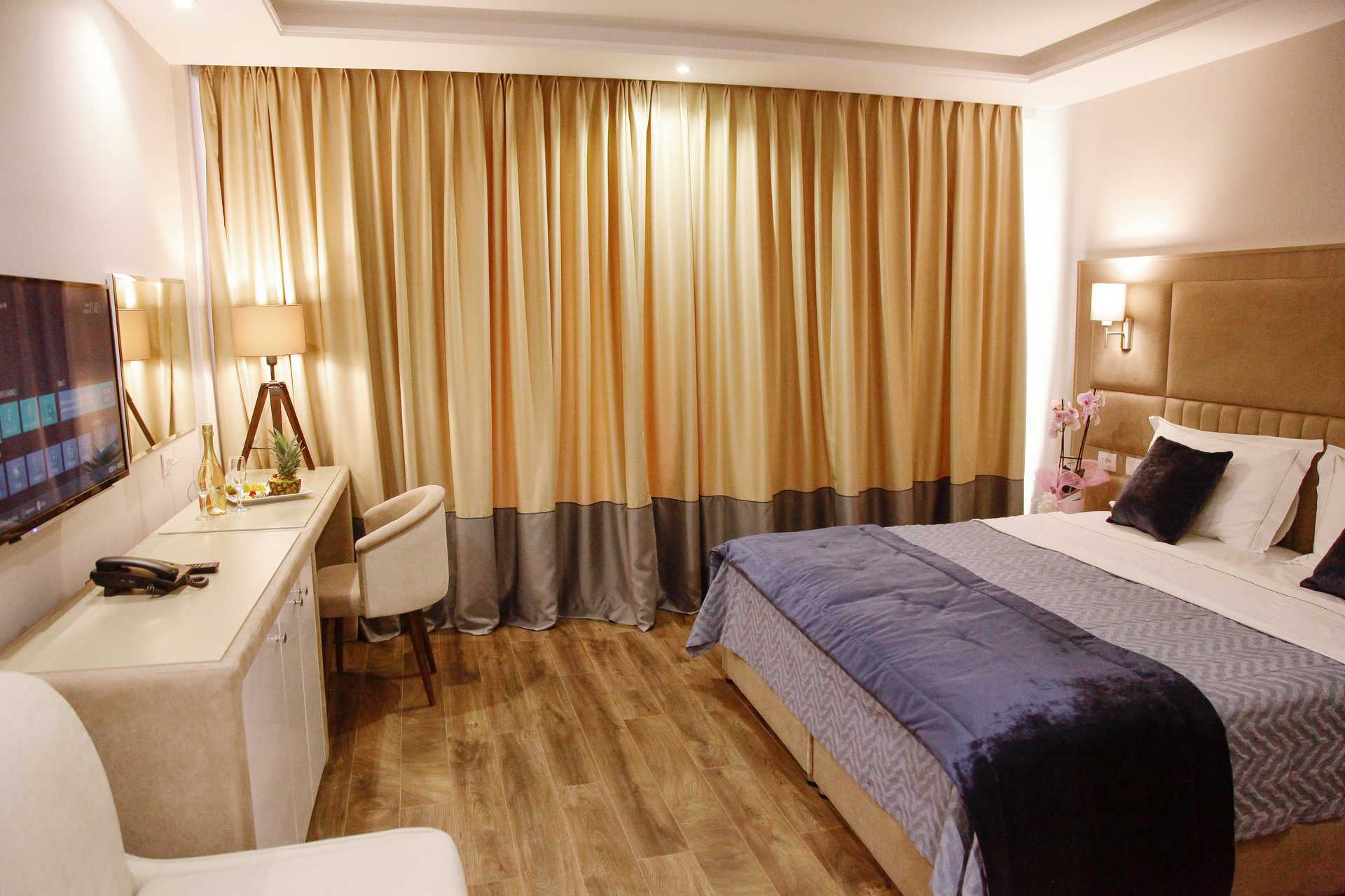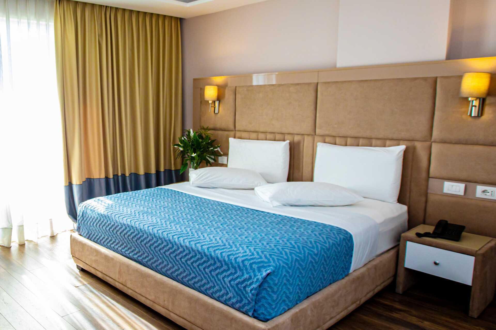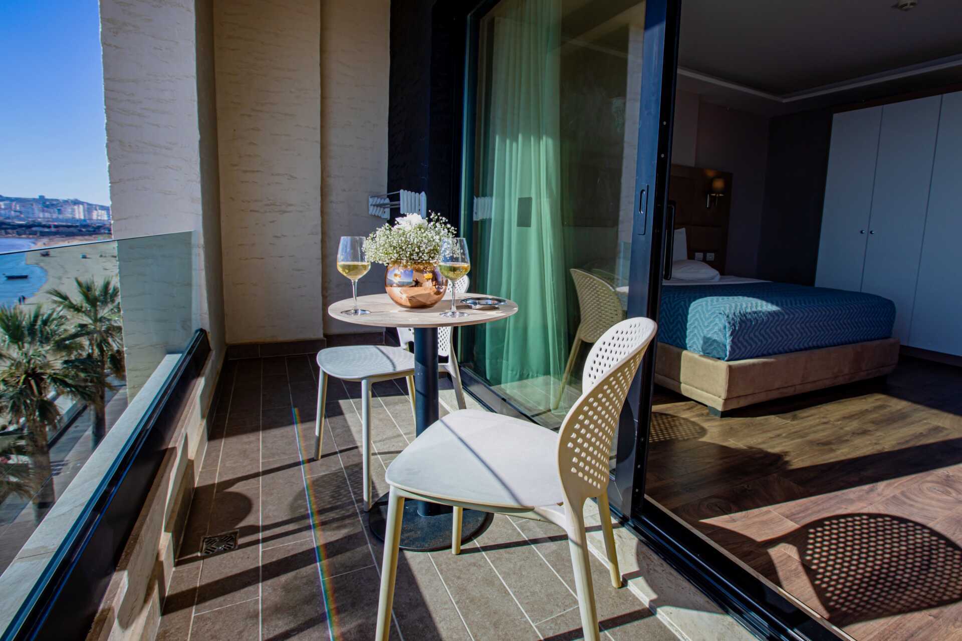 Dobbeltrom med balkong og begrenset havutsikt eller havutsikt eller dobbeltrom uten uteplass. En dobbeltseng eller to enkeltsenger. Mulig med ekstraseng i oppredbar lenestol eller feltseng. Wifi, luftkondisjonering og safe inkludert. Kjøleskap. TV. Hårføner. Dusj og wc. Rengjøring 7 ggr/uke.