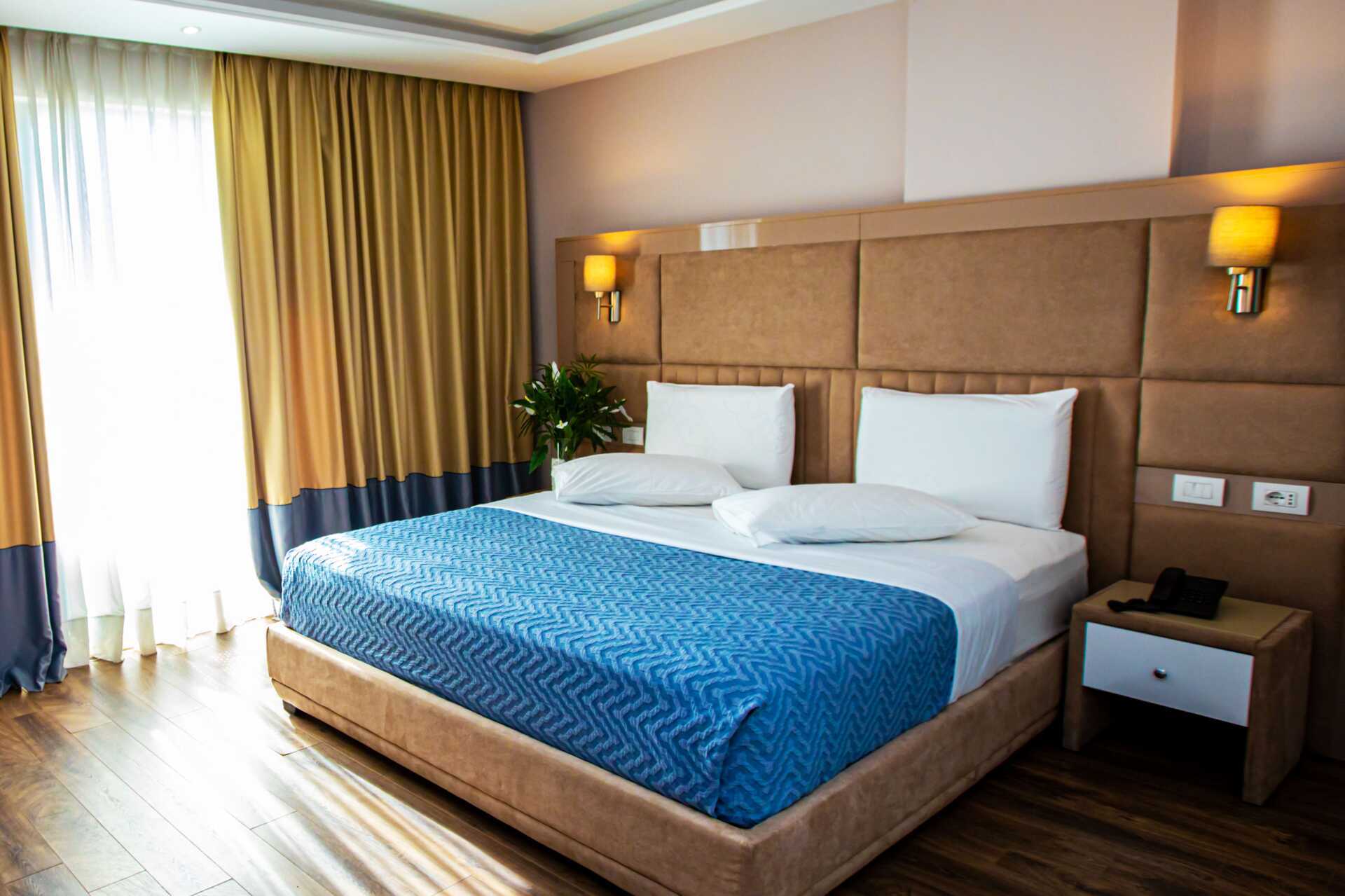 Dobbeltrom med balkong og begrenset havutsikt, alternativt dobbeltrom uten terrasse. En dobbeltseng eller to enkeltsenger. Mulig med ekstraseng i sovesofa eller feltseng. Wifi, luftkondisjonering og safe inkludert. Kjøleskap. TV. Hårføner. Dusj og wc. Rengjøring 7 ggr/uke.