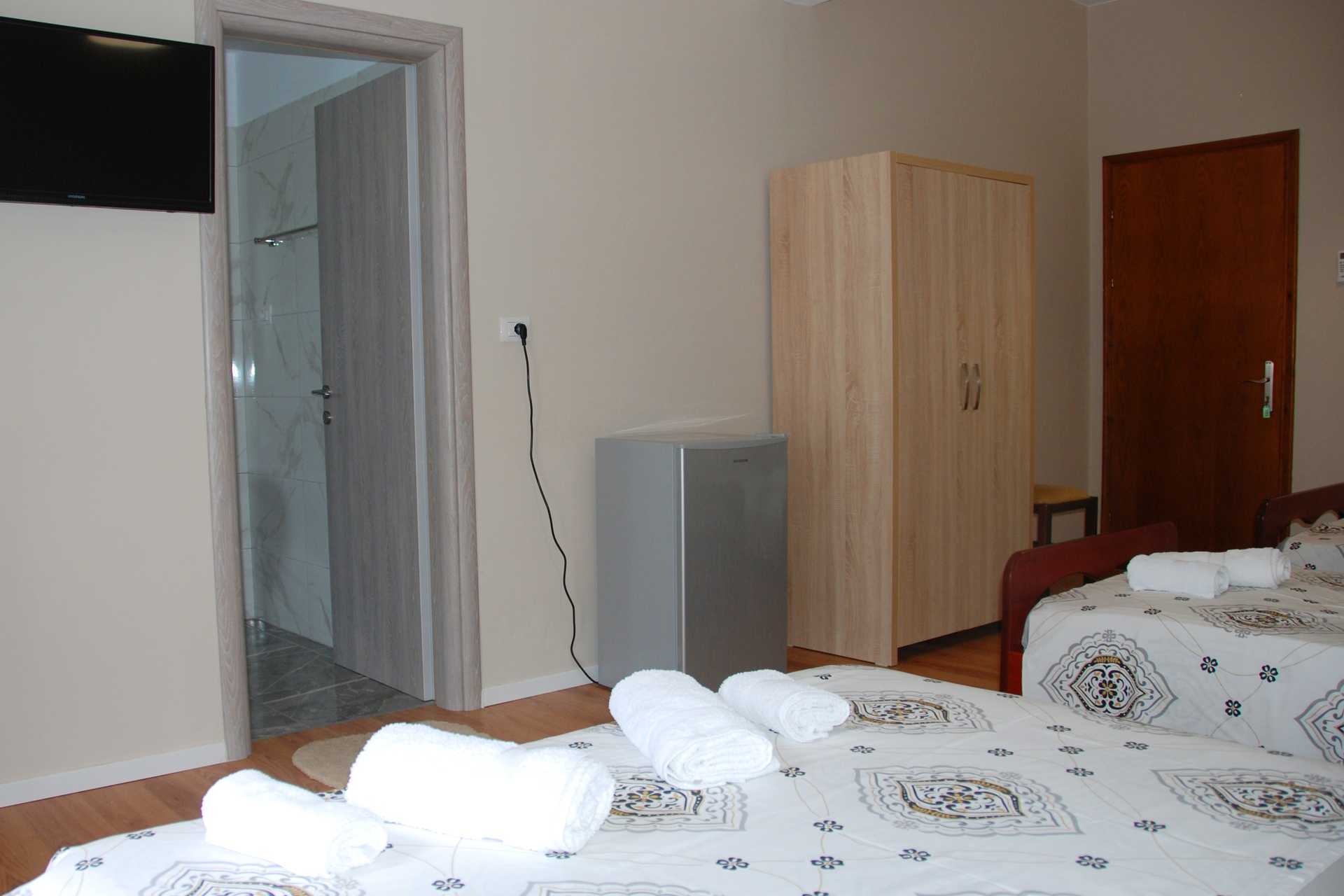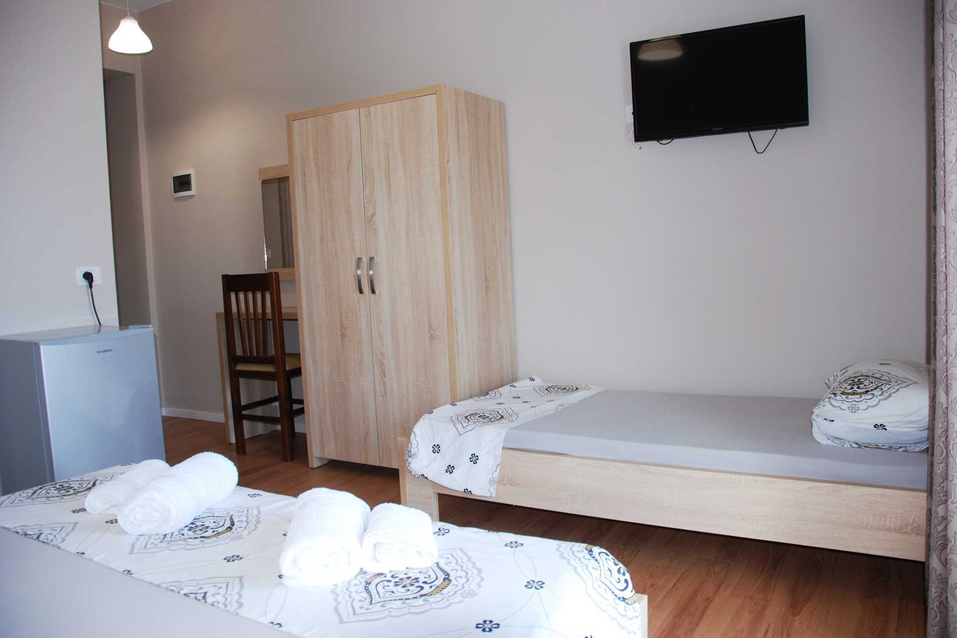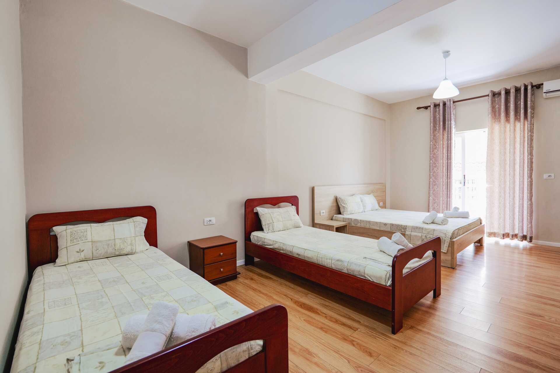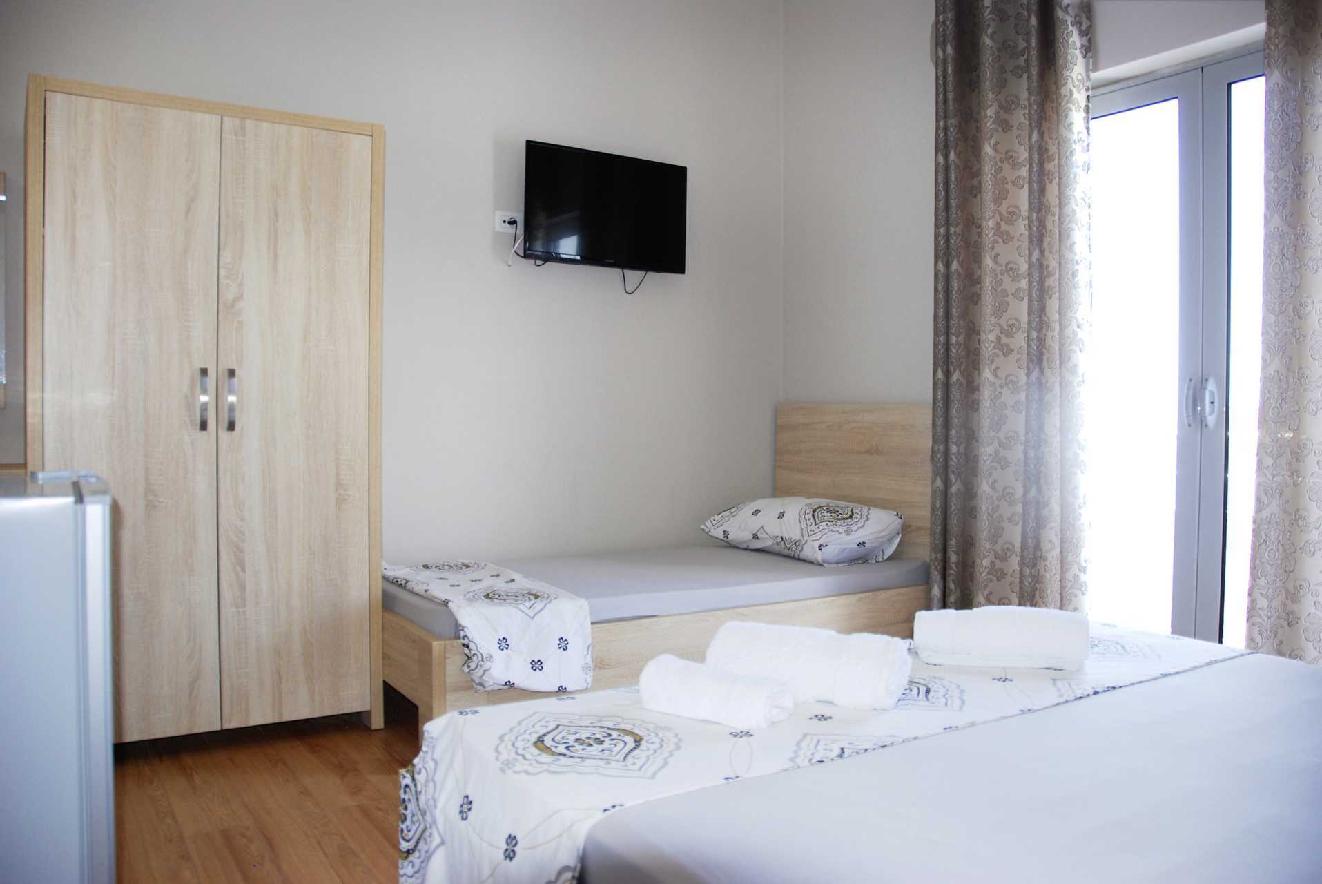 Familierom med tre ordinære senger og balkong. Wifi, luftkondisjonering og safe inkludert. Kjøleskap. TV. Hårføner. Badekar eller dusj samt wc. Rengjøring 7 ggr/uke.
