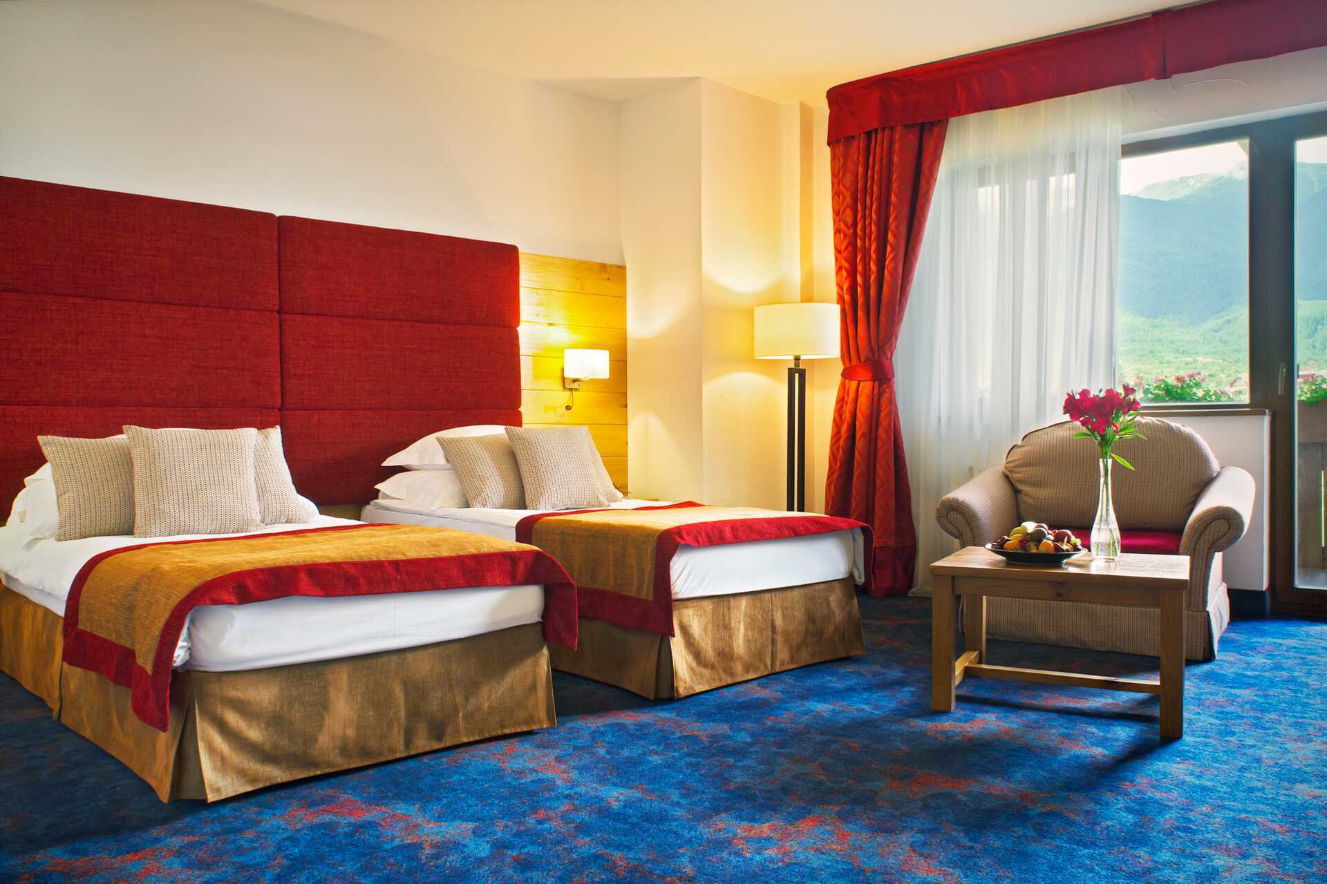 Deluxerom med balkong og utsikt mot byen. En dobbeltseng eller to enkeltsenger. Mulig med en ekstraseng i oppredbar lenestol. Wifi, luftkondisjonering og safe inkludert. Kjøleskap. Vannkoker samt kaffe og te. Vegg-til-vegg-teppe Hårføner. Badekåper og tøfler Badekar, dusj og wc. Rengjøring 7 ggr/uke.