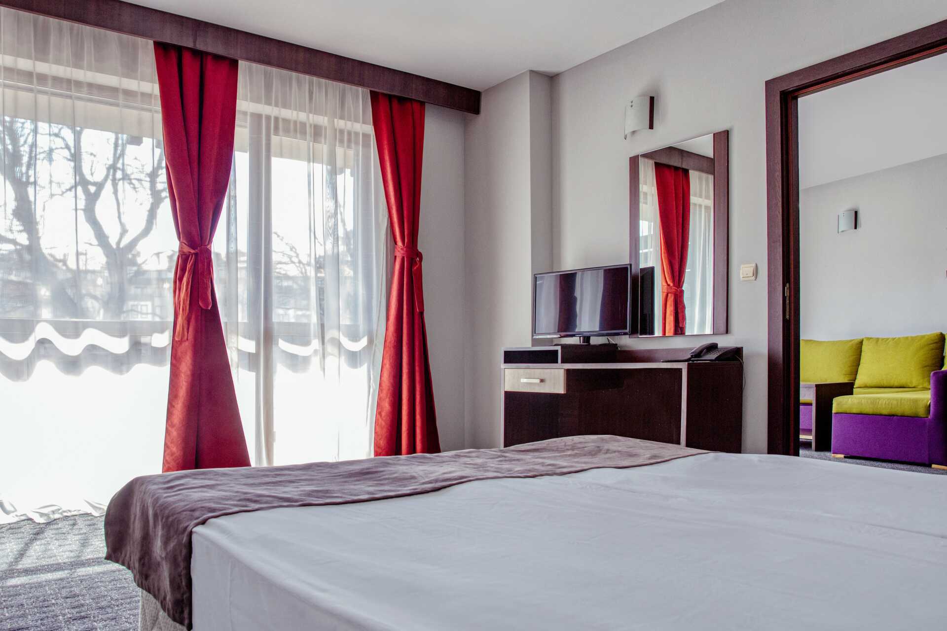 Familierom med balkong med utsikt over byen eller fjellene. Familierommet består av et soverom og en stue. To enkeltsenger. Mulig med ekstrasenger i to sovesofaer. Wifi, luftkondisjonering og safe inkludert. Kjøleskap. TV. Vegg-til-vegg-teppe Hårføner. Dusj og wc. Rengjøring 7 ggr/uke.