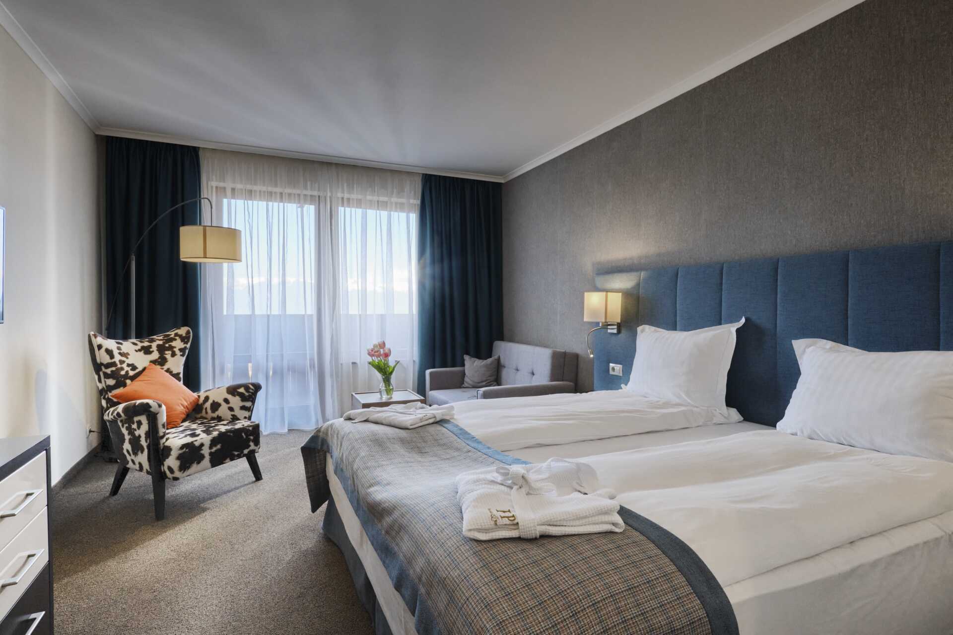 Dobbeltrom med balkong. En dobbeltseng eller to enkeltsenger. Mulig med ekstraseng i oppredbar lenestol/sofa. Wifi, luftkondisjonering og safe inkludert. Kjøleskap. TV. Vegg-til-vegg-teppe. Hårføner. Dusj og wc. Rengjøring 7 ggr/uke. Barn under 2 år regnes inn i maksantallet i rommet.