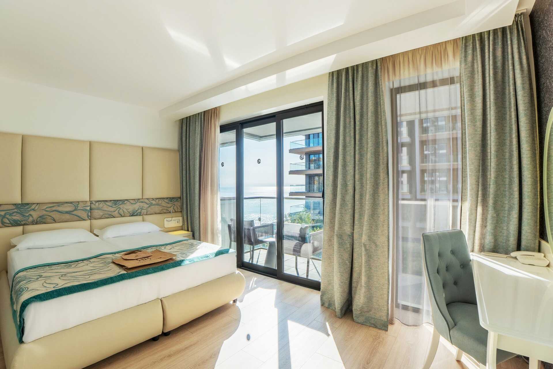 Dobbeltrom med balkong og begrenset havutsikt. En dobbeltseng eller to enkeltsenger. Wifi, luftkondisjonering og safe inkludert. Minibar med vann, brus og snacks, med daglig påfyll. Kaffemaskin med kapsler og vannkoker. TV. Putemeny. Hårføner. Bad med badekar og wc. Rengjøring 7 ggr/uke.