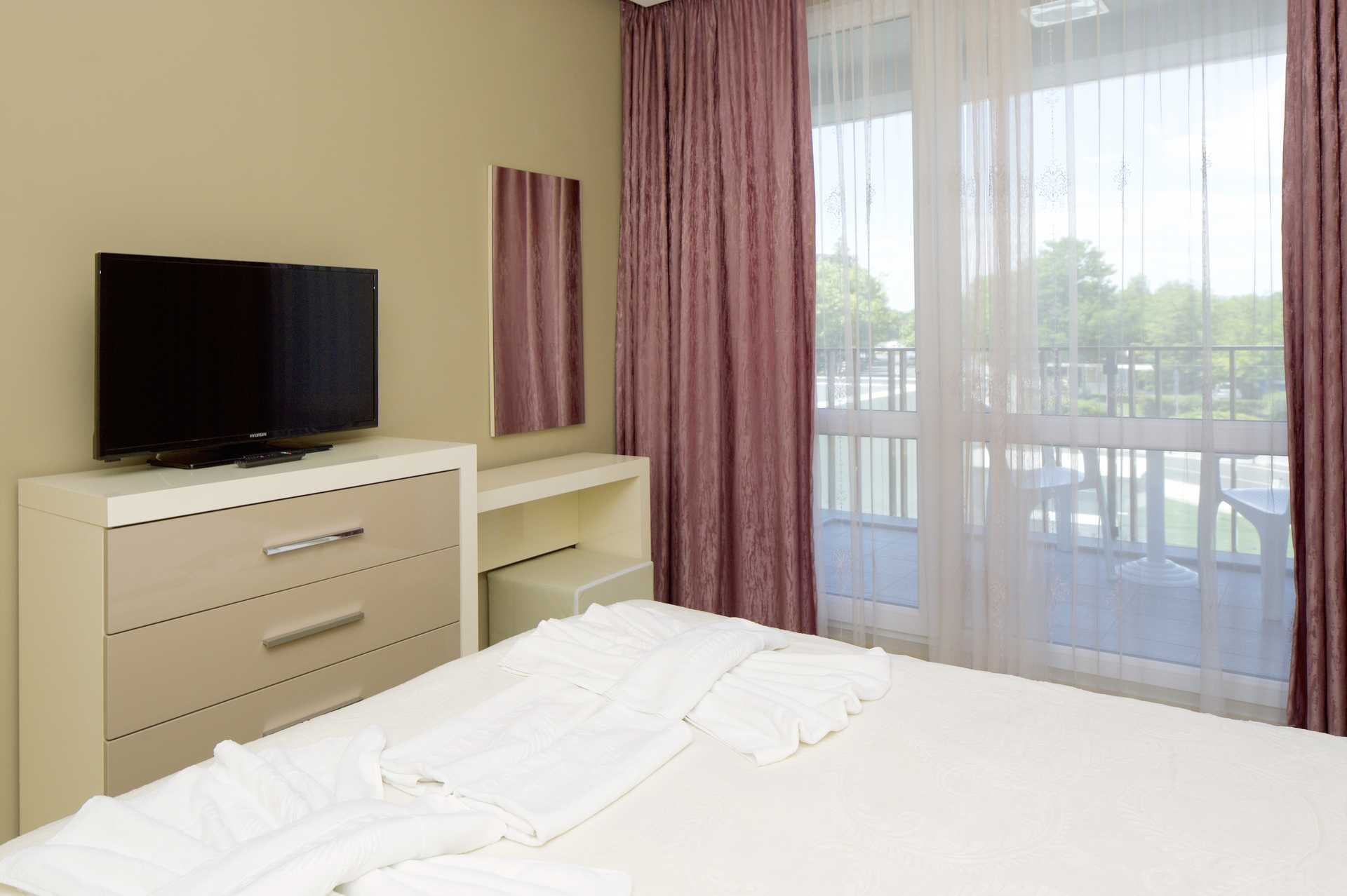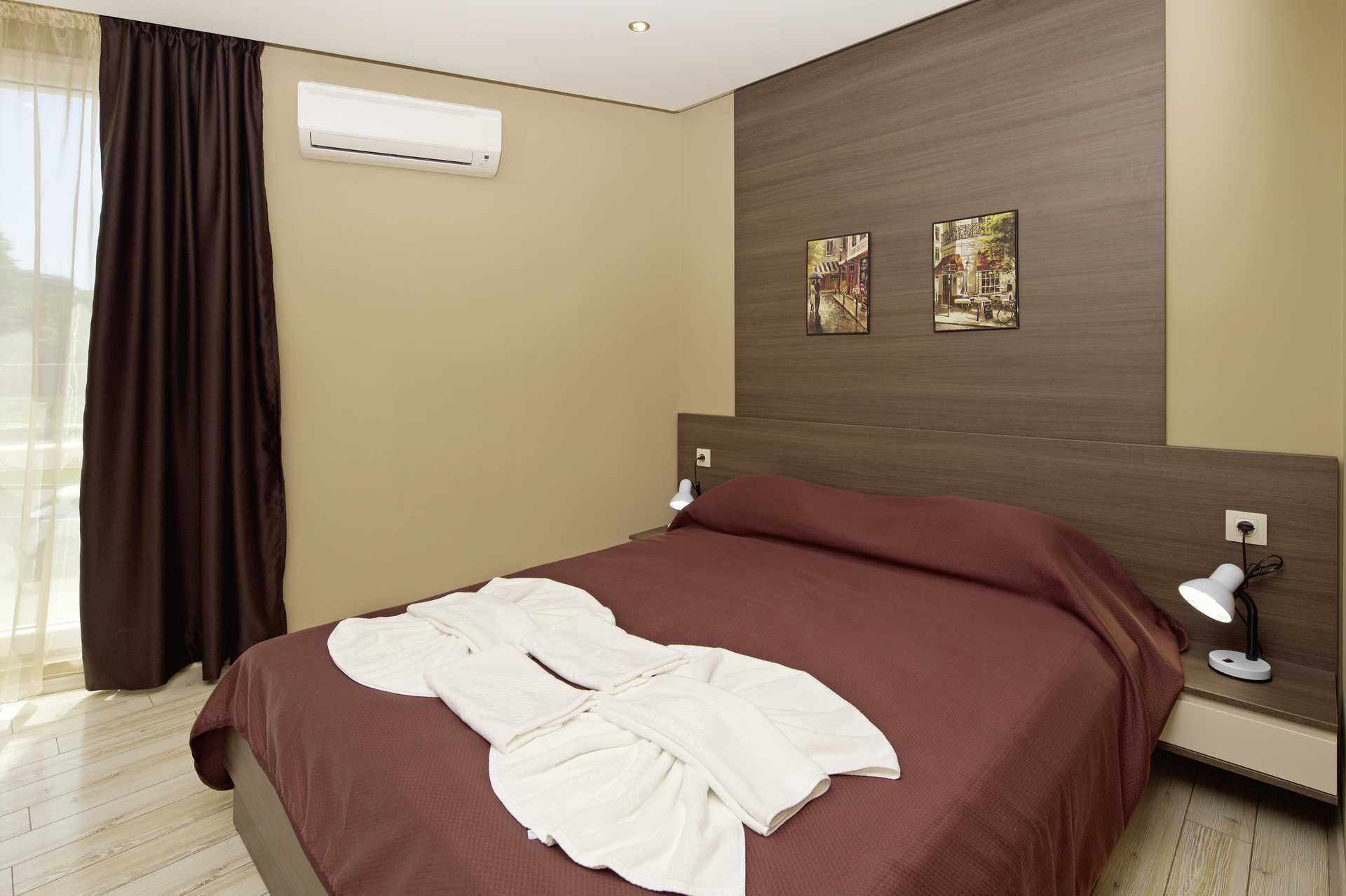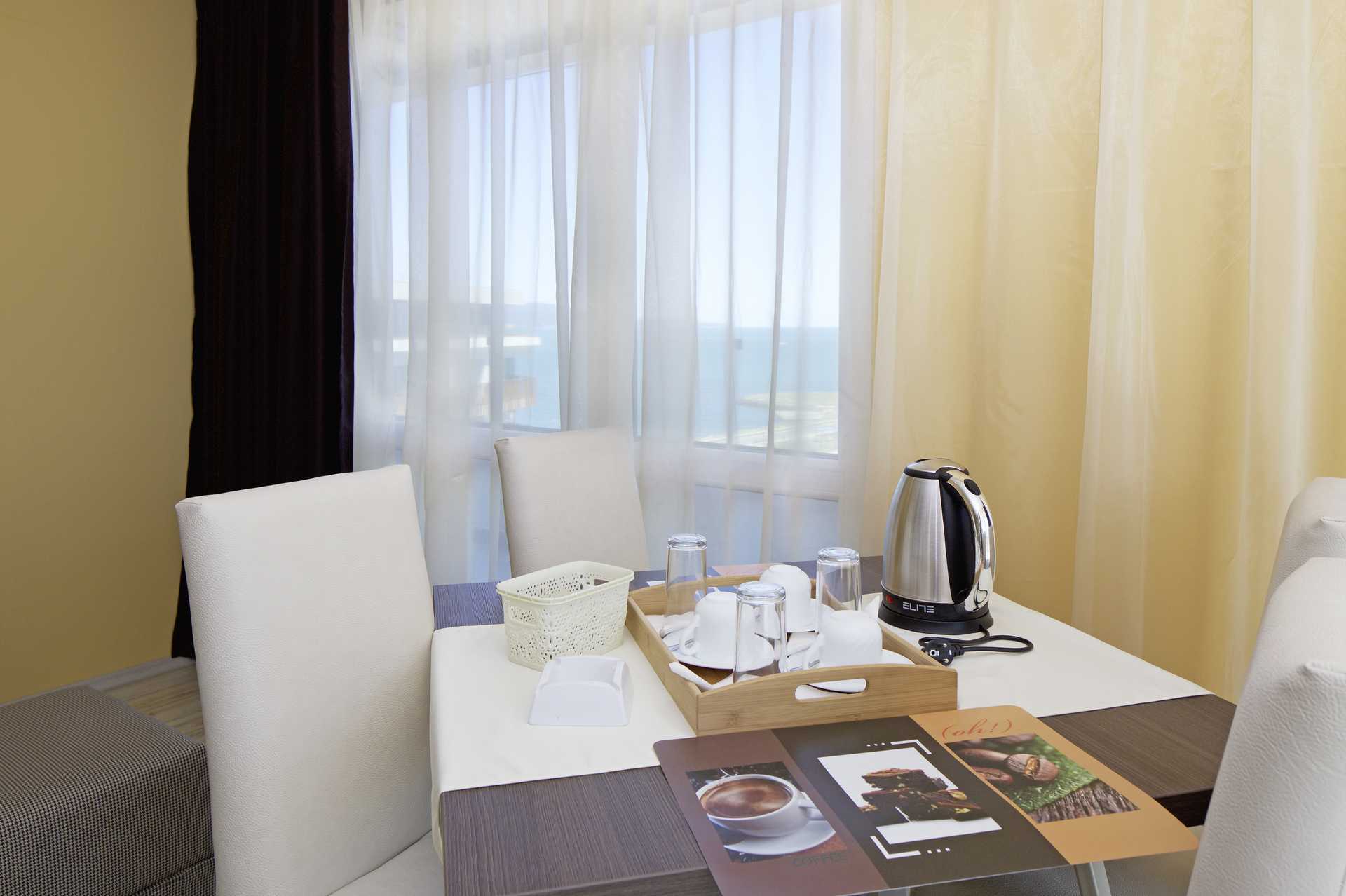 Familierom med balkong, noen med begrenset havutsikt. Soverom og stue. En dobbeltseng. Mulighet for ekstrasenger i sovesofa. Vannkoker samt kaffe og te. Wifi, luftkondisjonering og safe inkludert. TV i begge rom. Hårføner. Baderom med dusj og wc. Rengjøring 7 ggr/uke.