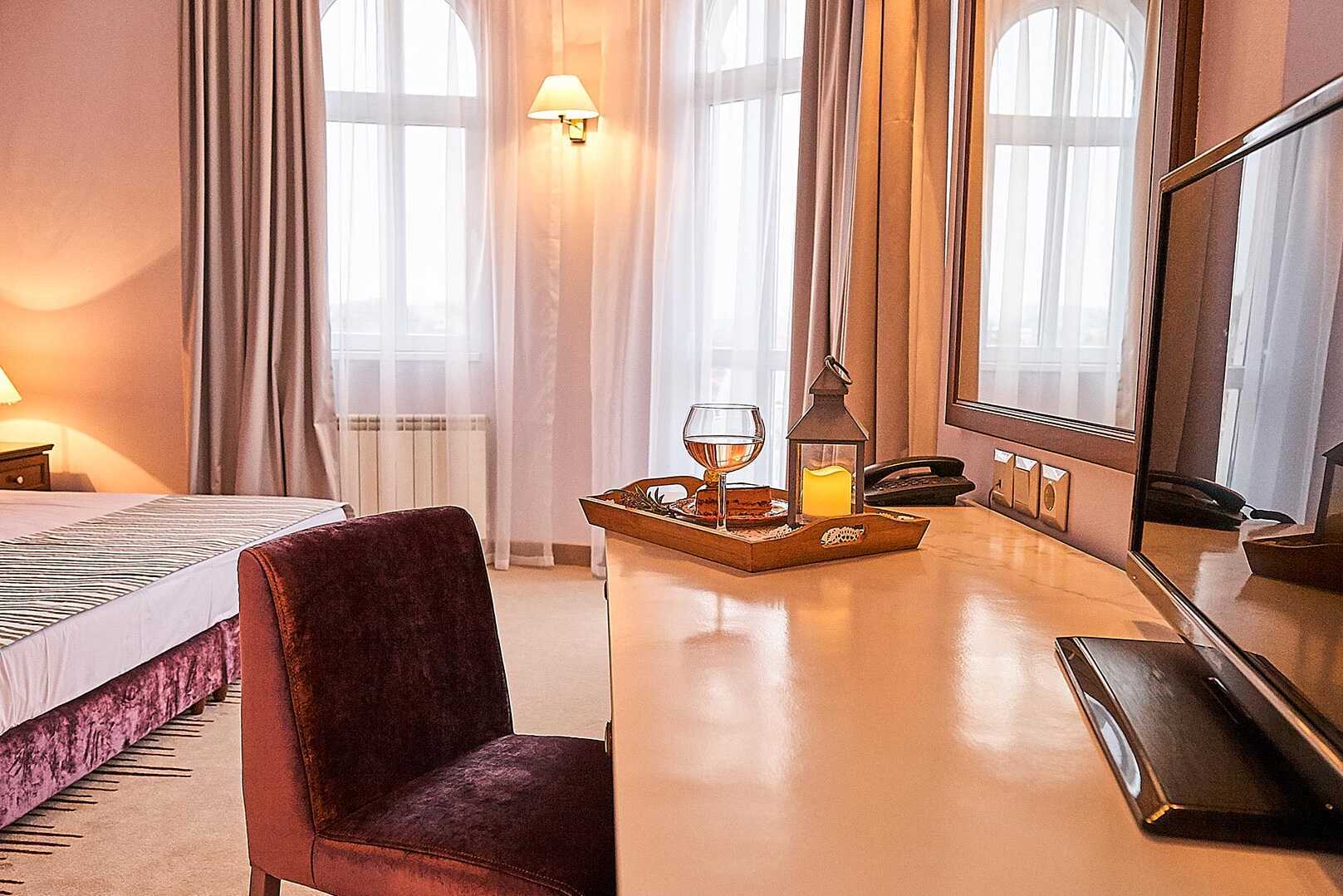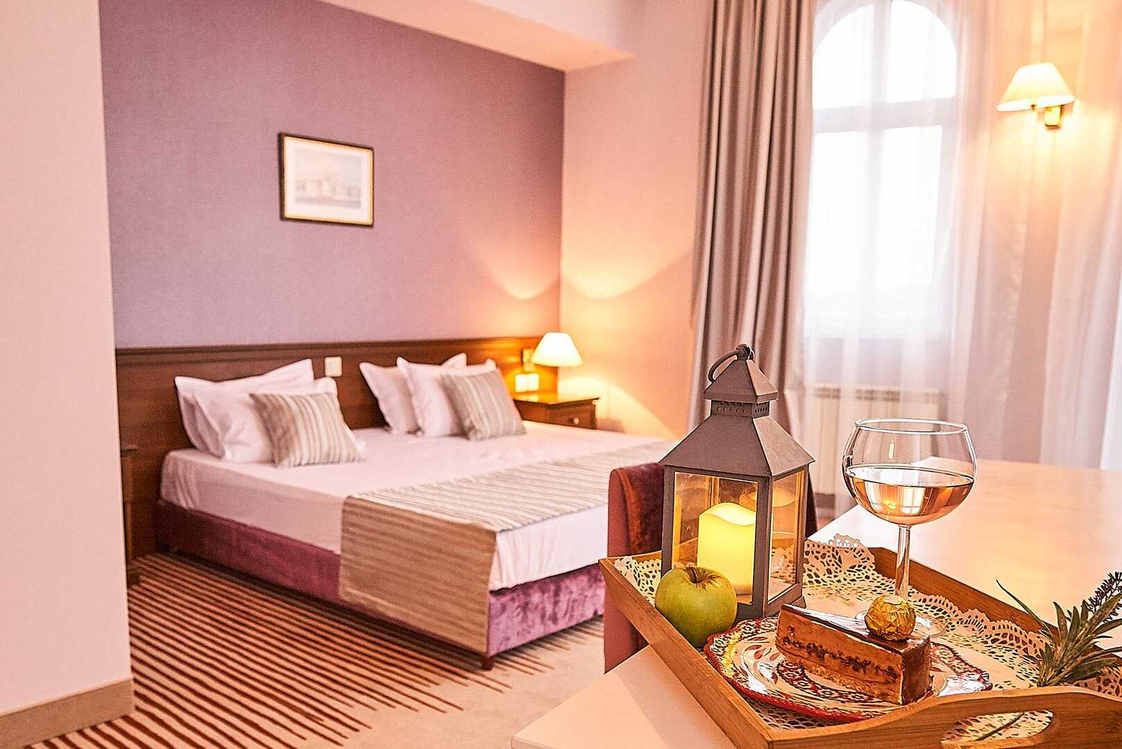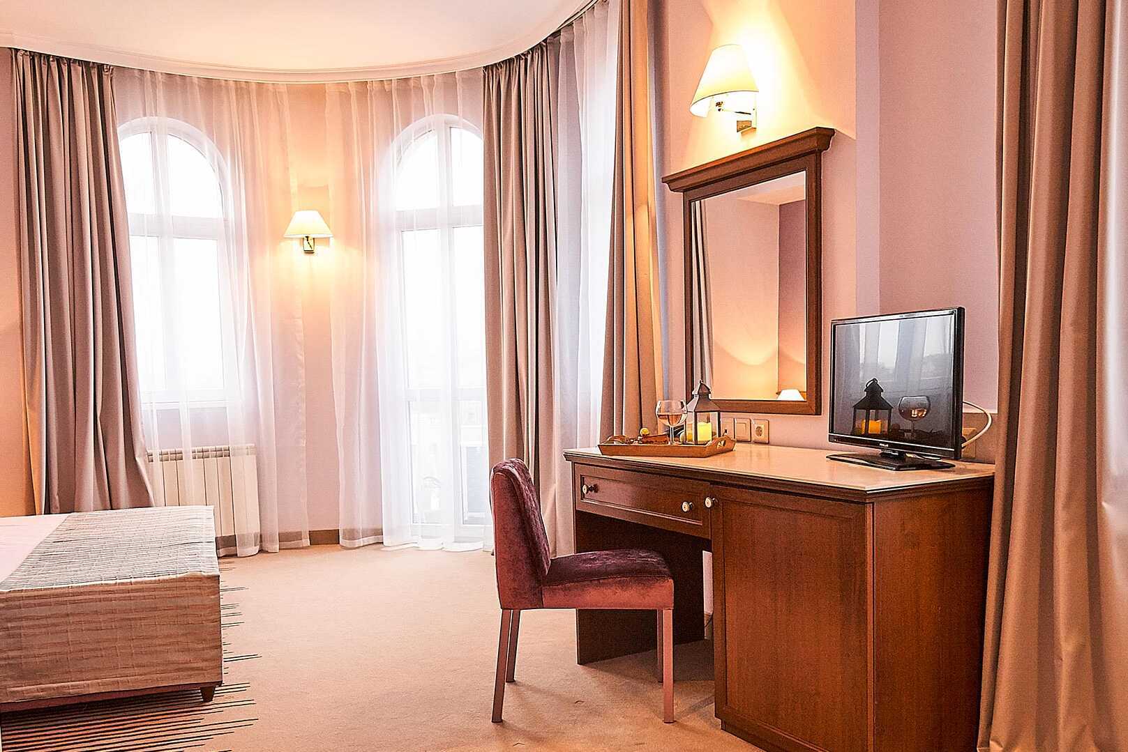 Deluxerom uten uteplass. En dobbeltseng. Mulig med en ekstraseng i sovesofa. Wifi og luftkondisjonering til oppvarming er inkludert. Kjøleskap. TV. Vegg-til-vegg-teppe. Hårføner. Badekar eller dusj samt wc. Rengjøring 6 ggr/uke.