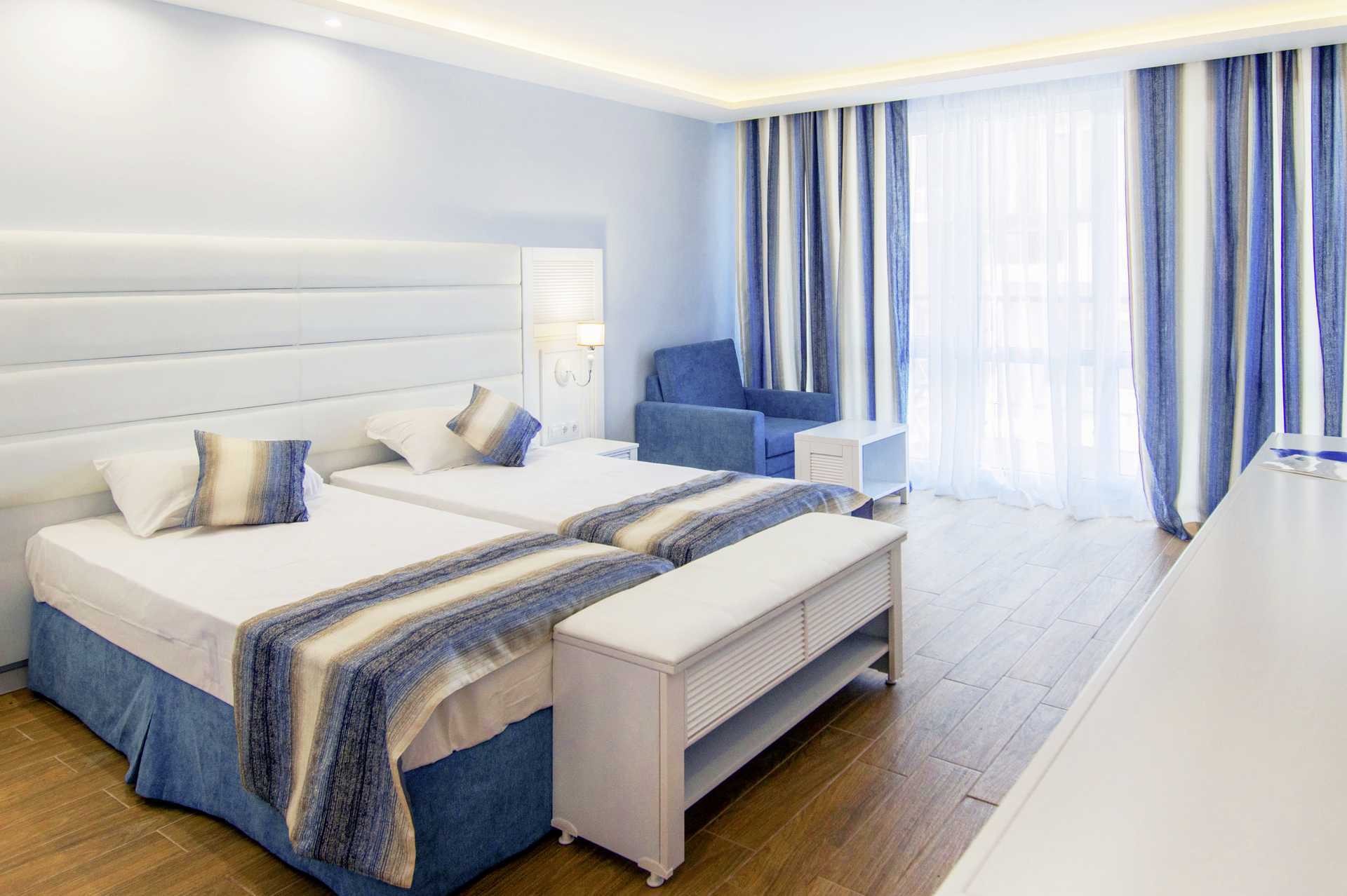 Superiorrom med balkong, noen med havutsikt. To enkeltsenger. Mulig med ekstraseng i sovesofa, oppredbar lenestol eller vanlig seng. Wifi og luftkondisjonering inkludert. Safe mot avgift. Kjøleskap. TV. Hårføner. Baderom med dusj og wc. Rengjøring 7 ggr/uke.