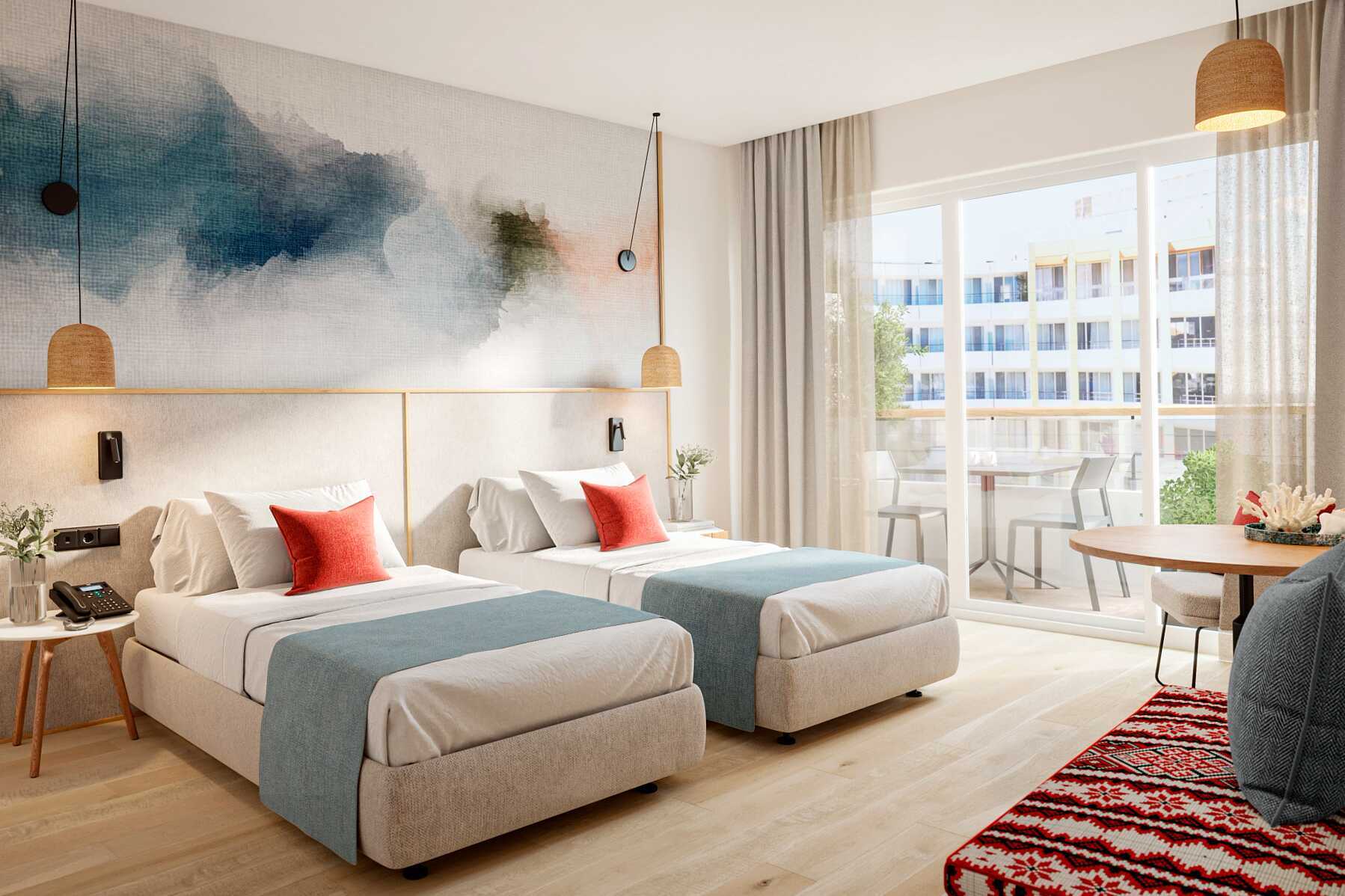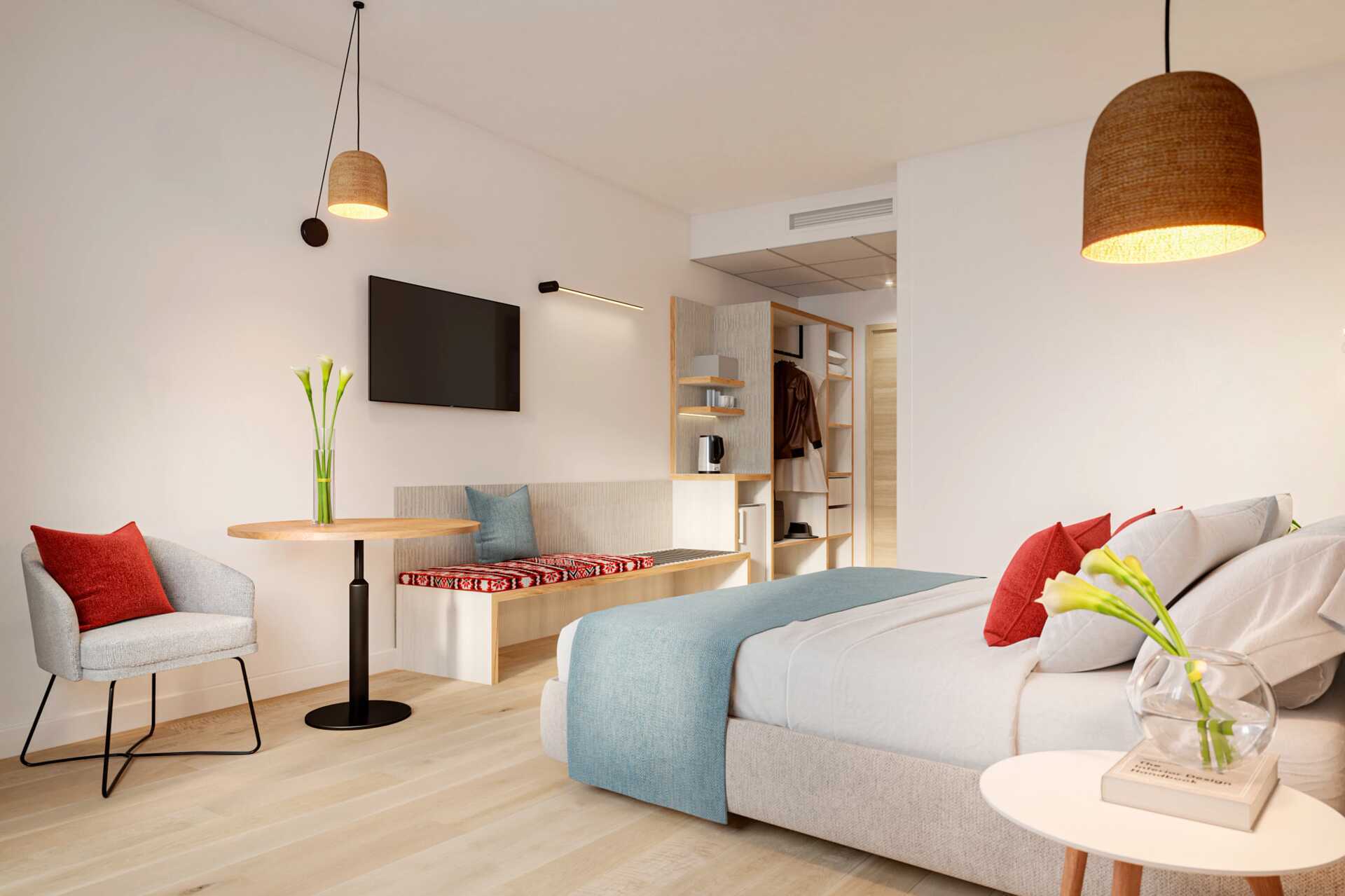 Superiorrom med balkong, noen med havutsikt og noen med bassengutsikt. En dobbeltseng eller to enkeltsenger. Wifi, luftkondisjonering og safe inkludert. Kjøleskap. Vannkoker. TV. Hårføner. Baderom med dusj og wc. Rengjøring 7 ggr/uke.
