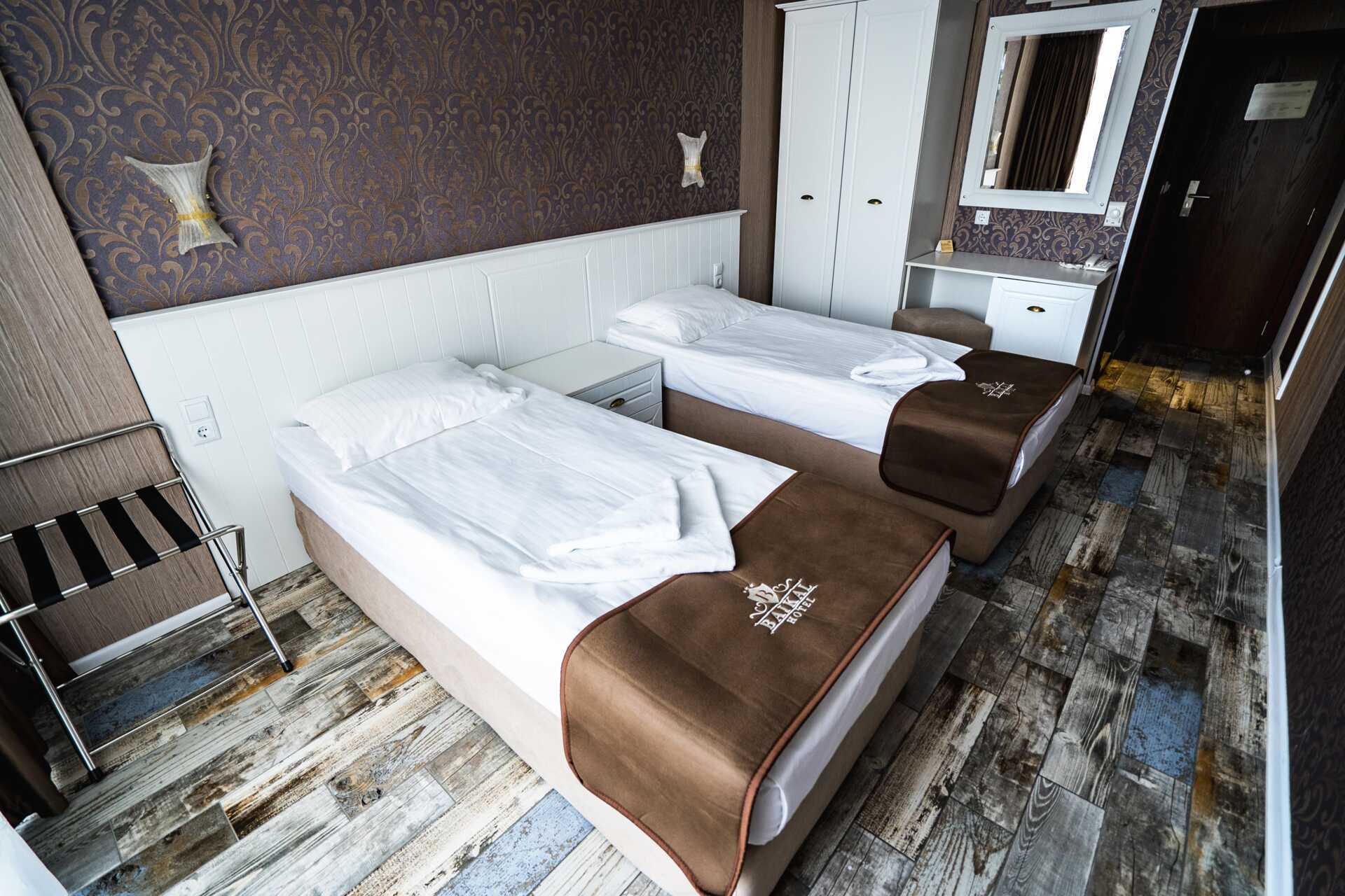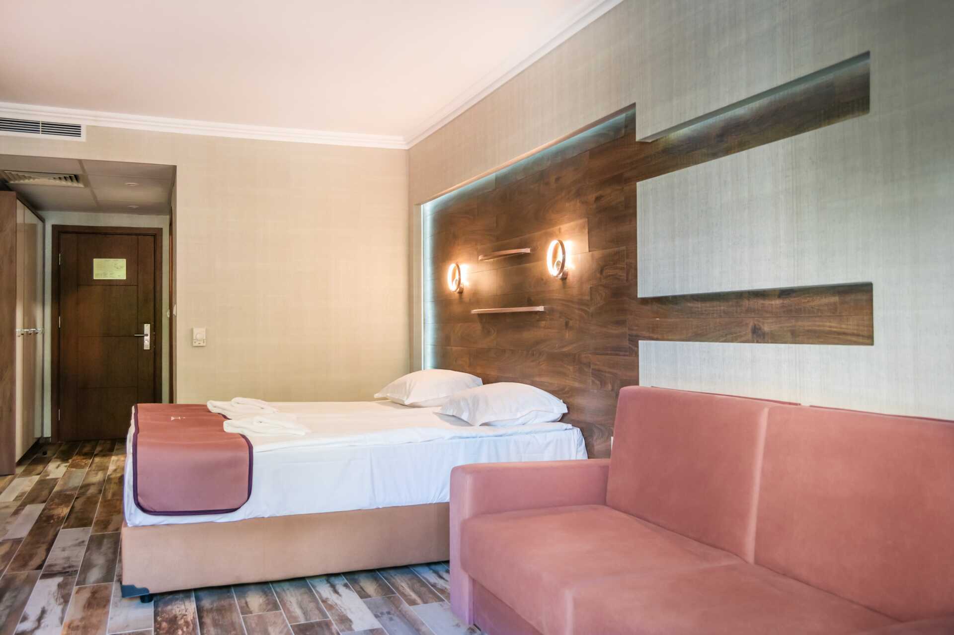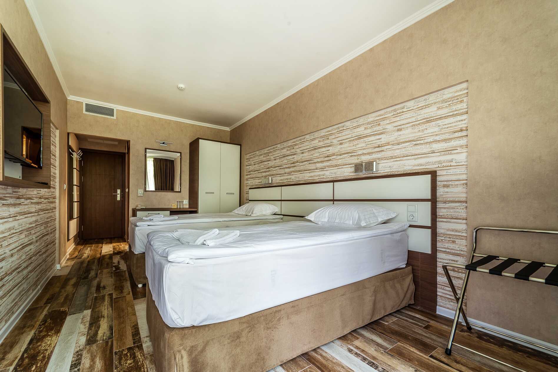 Superiorrom med balkong. To enkeltsenger. Mulig med ekstraseng i enkeltseng, oppredbar lenestol og/eller sovesofa. Wifi og luftkondisjonering inkludert. Kjøleskap. TV. Hårføner. Baderom med dusj og wc. Rengjøring 7 ggr/uke.