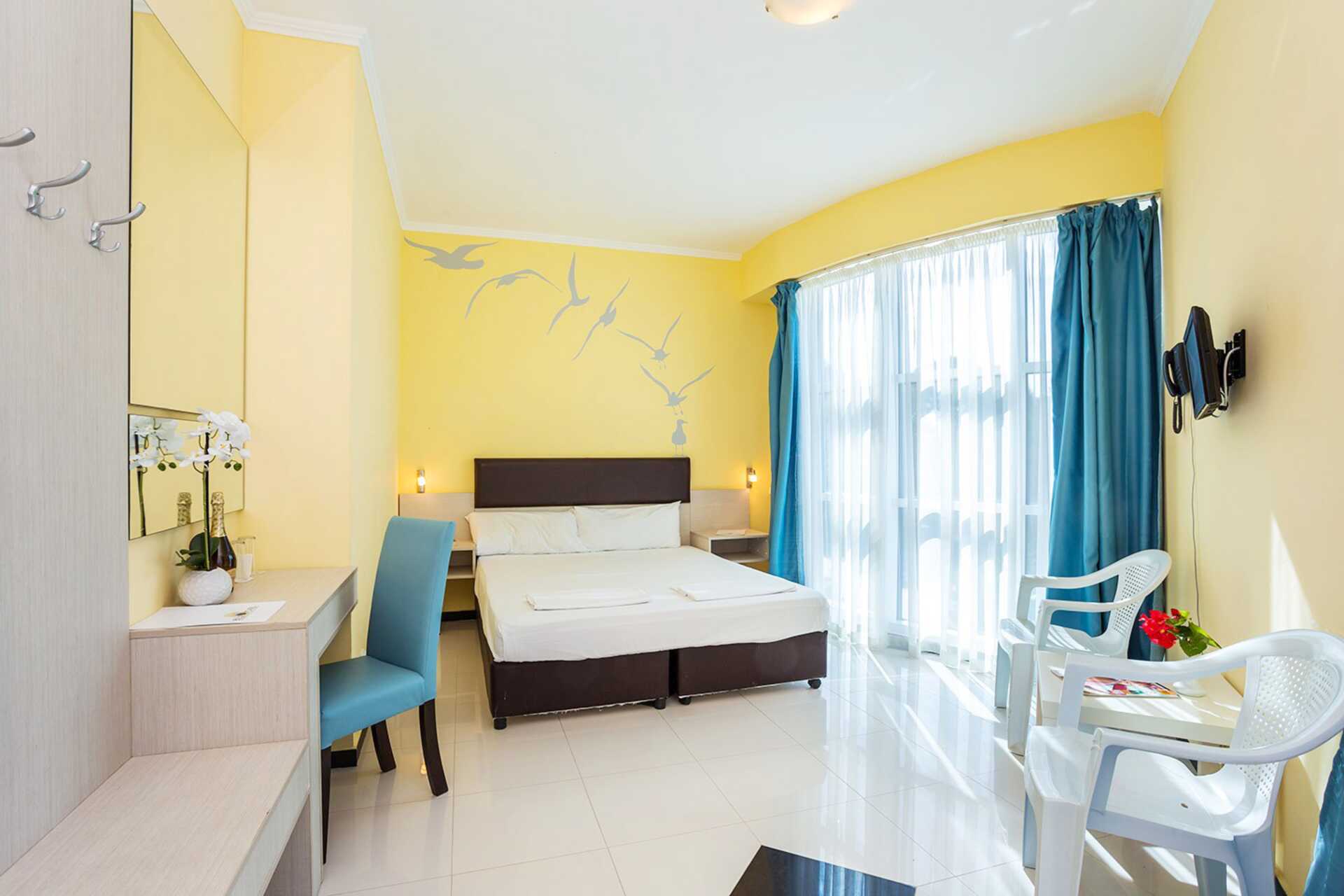 Dobbeltrom med balkong som vender mot gaten. En dobbeltseng eller to enkeltsenger. Mulig med ekstraseng i sovesofa. Wifi og luftkondisjonering inkludert. Kjøleskap, en flaske vann er inkludert og etterfylles hver dag. Kaffemaskin – kapsler ikke inkludert. TV. Vegg-til-vegg-teppe. Hårføner. Baderom med dusj og wc. Rengjøring 7 ggr/uke.