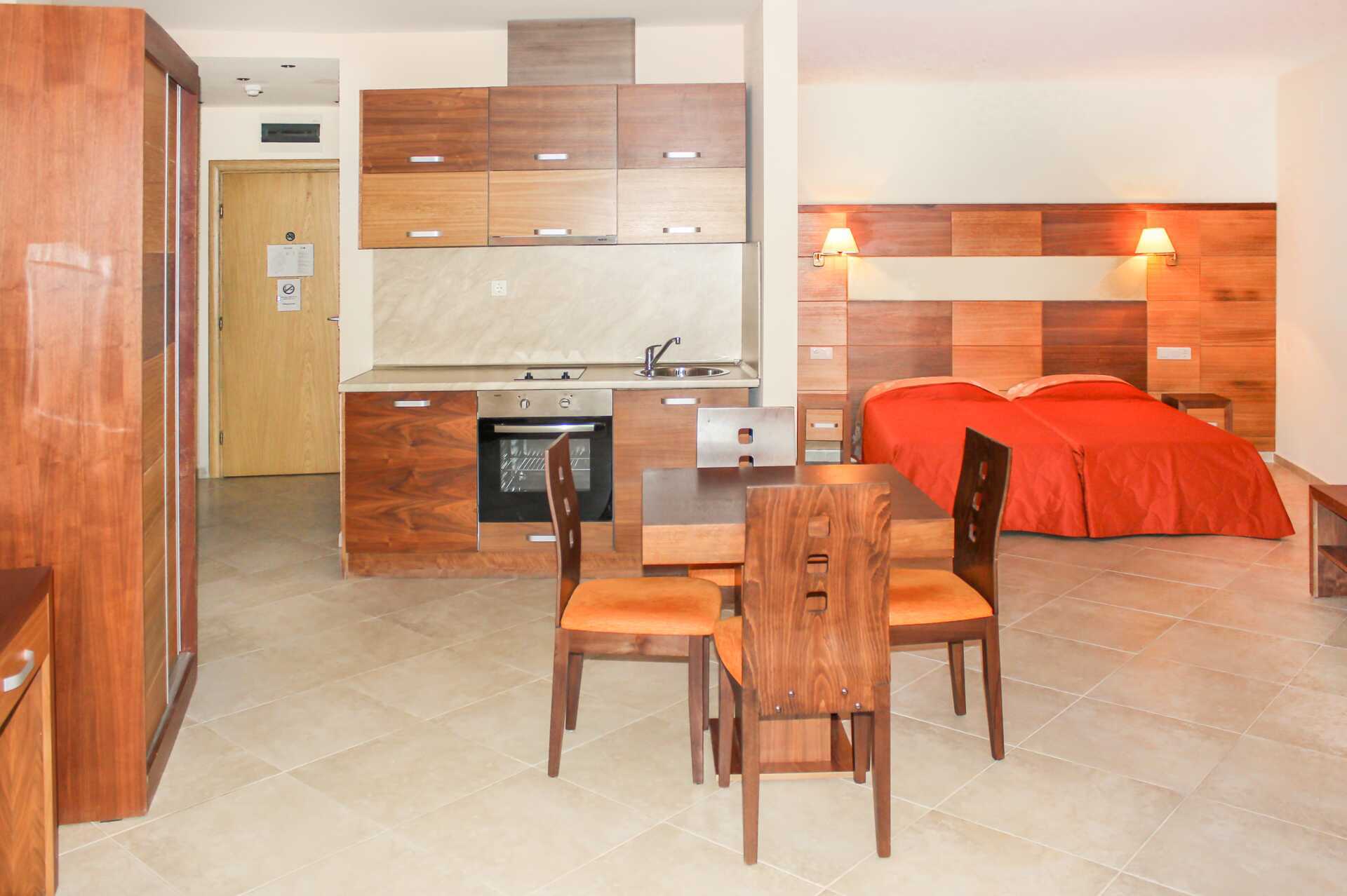 Større ettromsleilighet med balkong. Kombinert soverom og minikjøkken. En dobbeltseng eller to enkeltsenger. Mulig med en ekstraseng i sovesofa. Minikjøkken med kjøleskap, kokeplater, vannkoker, brødrister og enkelt kjøkkenutstyr. Wifi, luftkondisjonering og safe inkludert. TV. Hårføner. Baderom med dusj og wc. Rengjøring 7 ggr/uke.