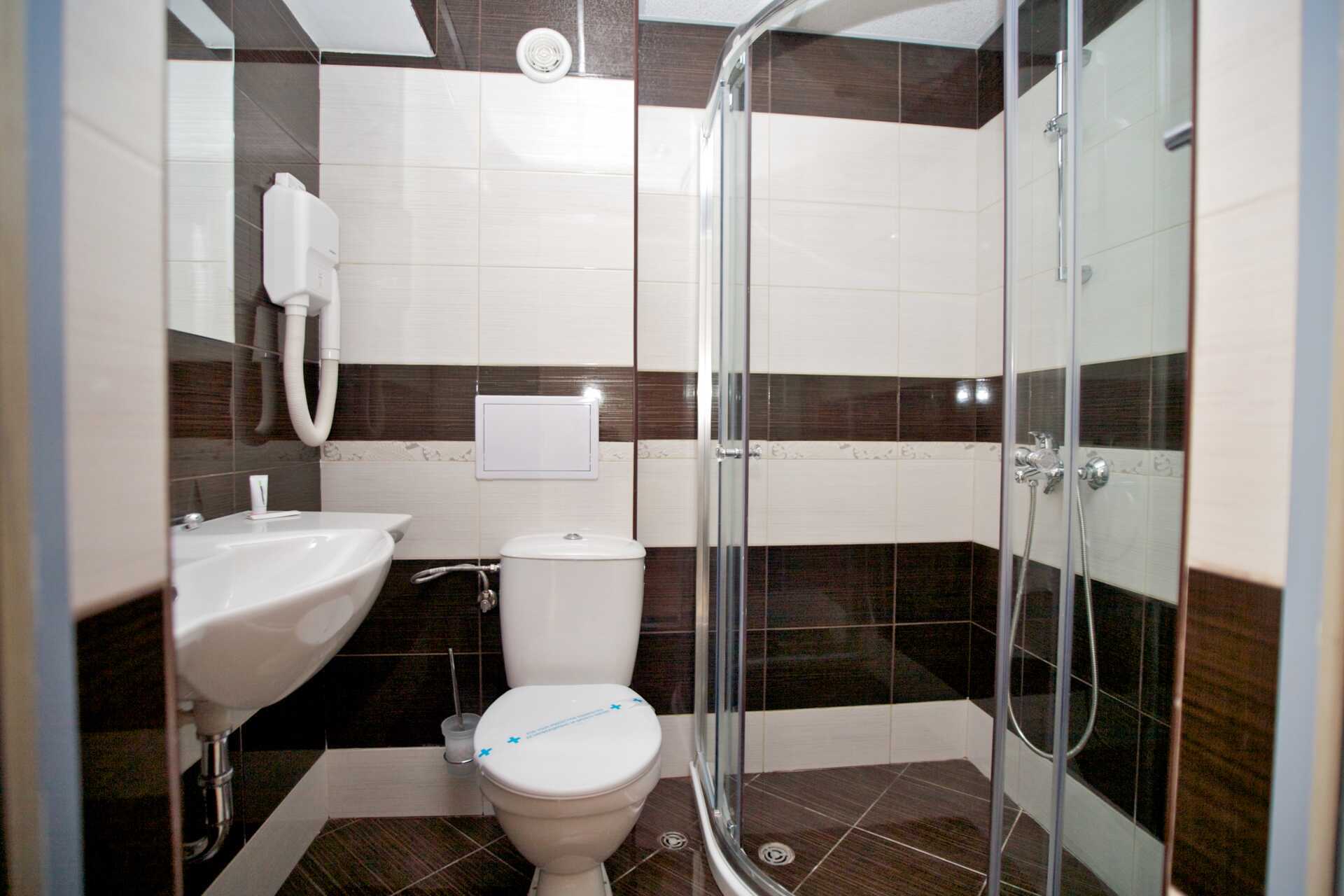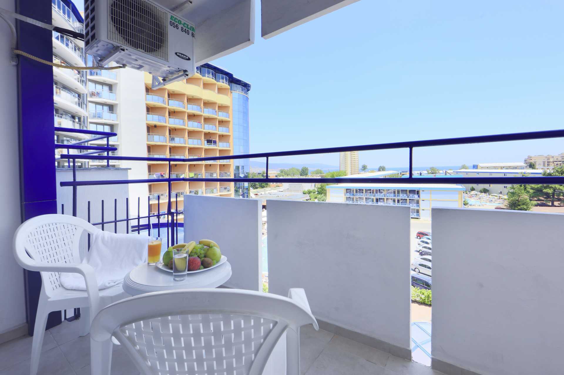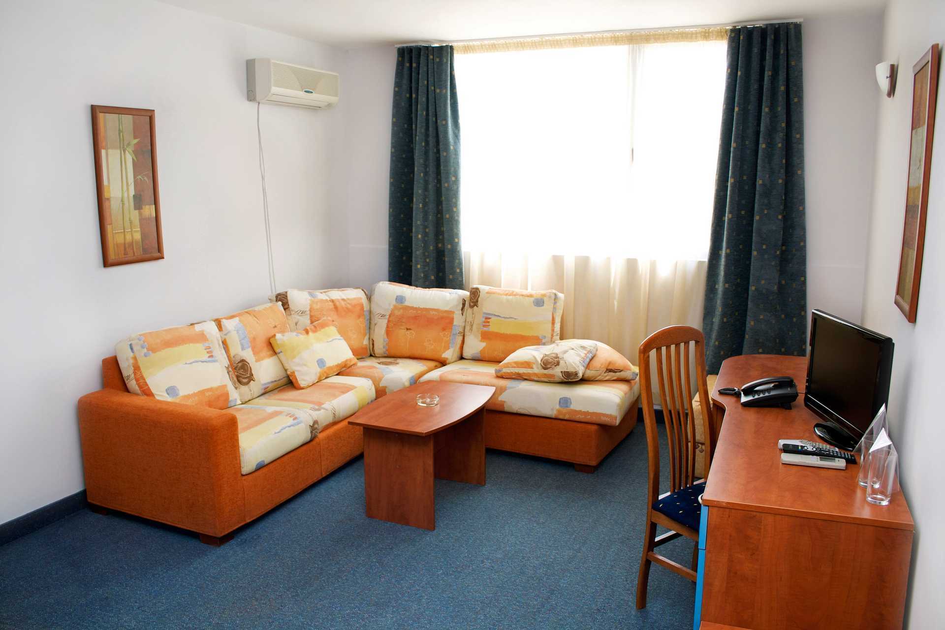 Familierom med balkong. Tre enkeltsenger og mulig med en ekstraseng. Luftkondisjonering og wifi inkludert. Vegg-til-vegg-teppe i noen av familierommene. Kjøleskap. TV. Baderom med dusj og wc. Rengjøring 7 ggr/uke.