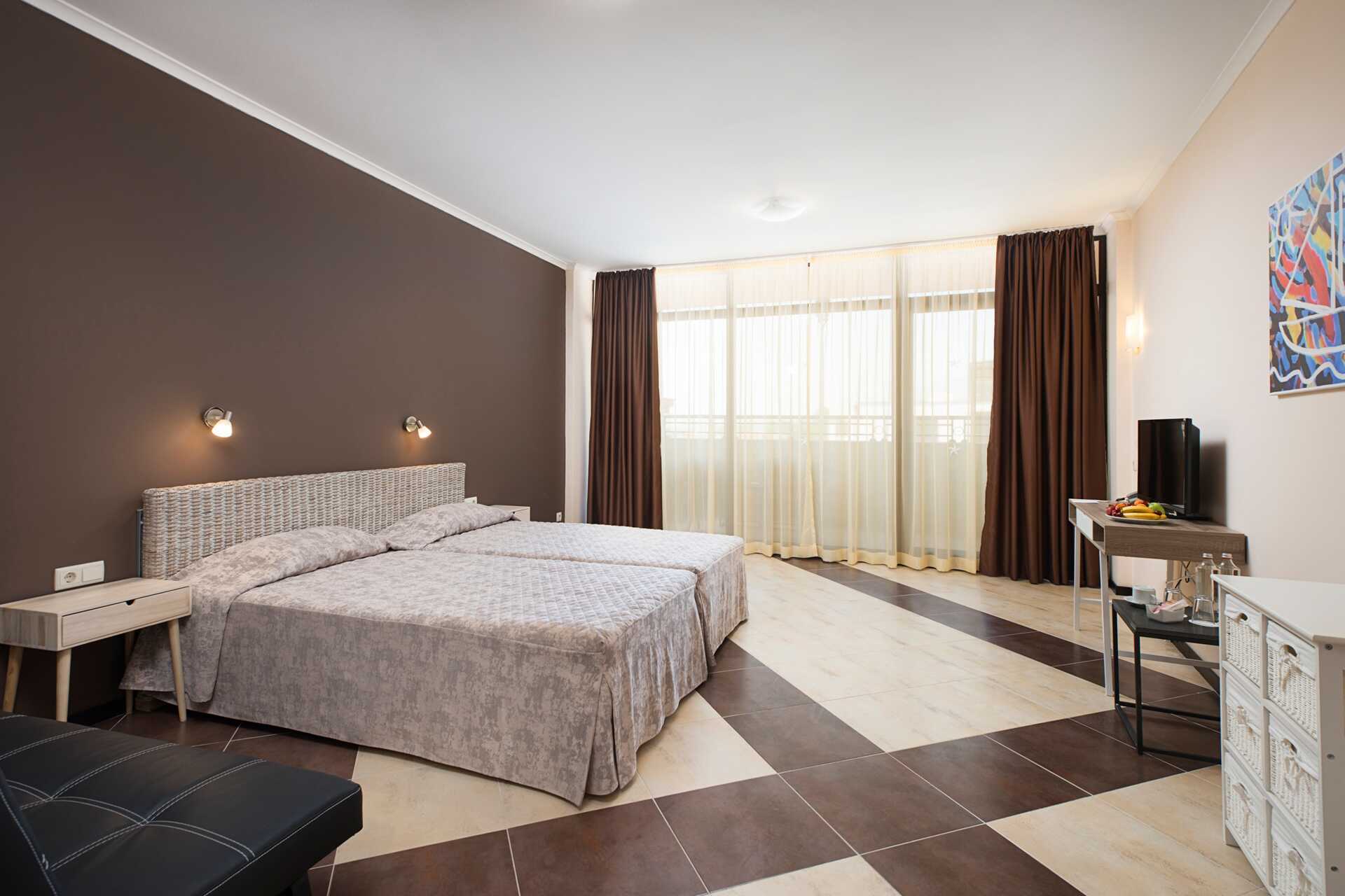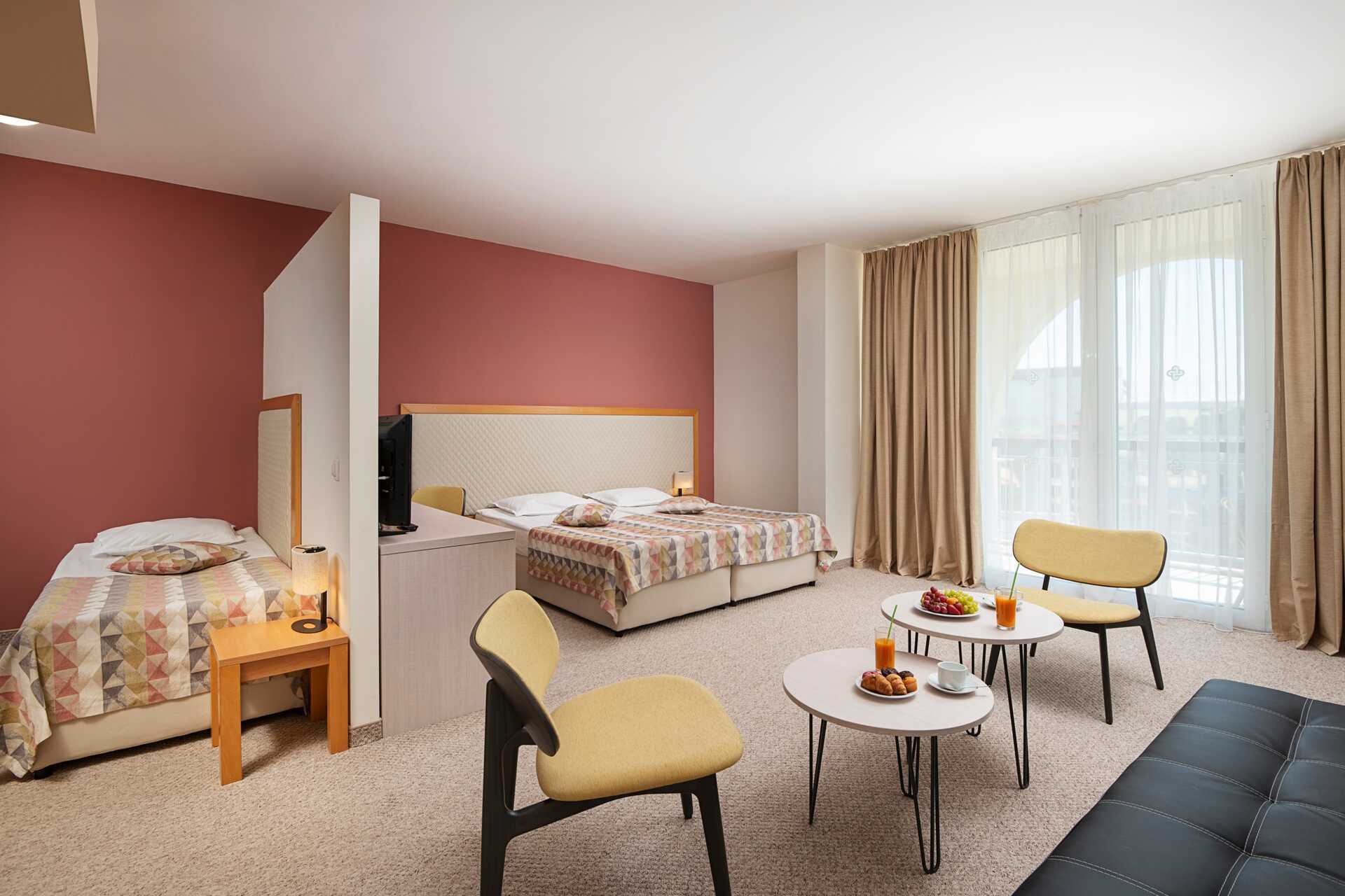 Juniorsuite med balkong. En dobbeltseng og to enkeltsenger og mulighet for ekstraseng på sovesofa. Wifi, luftkondisjonering og safe inkludert. Vegg-til-vegg-teppe. Kjøleskap. TV. Hårføner. Bad med dusj og wc. Rengjøring 7 ggr/uke. Juniorsuitene ligger i bygning A eller B.