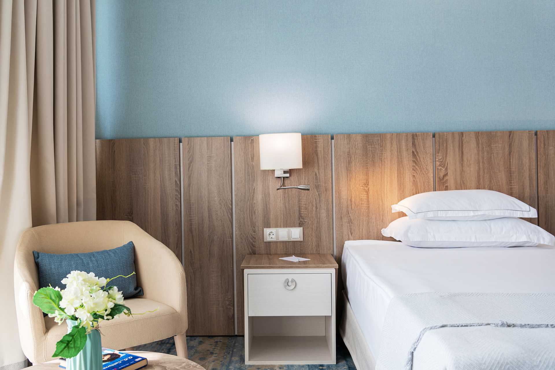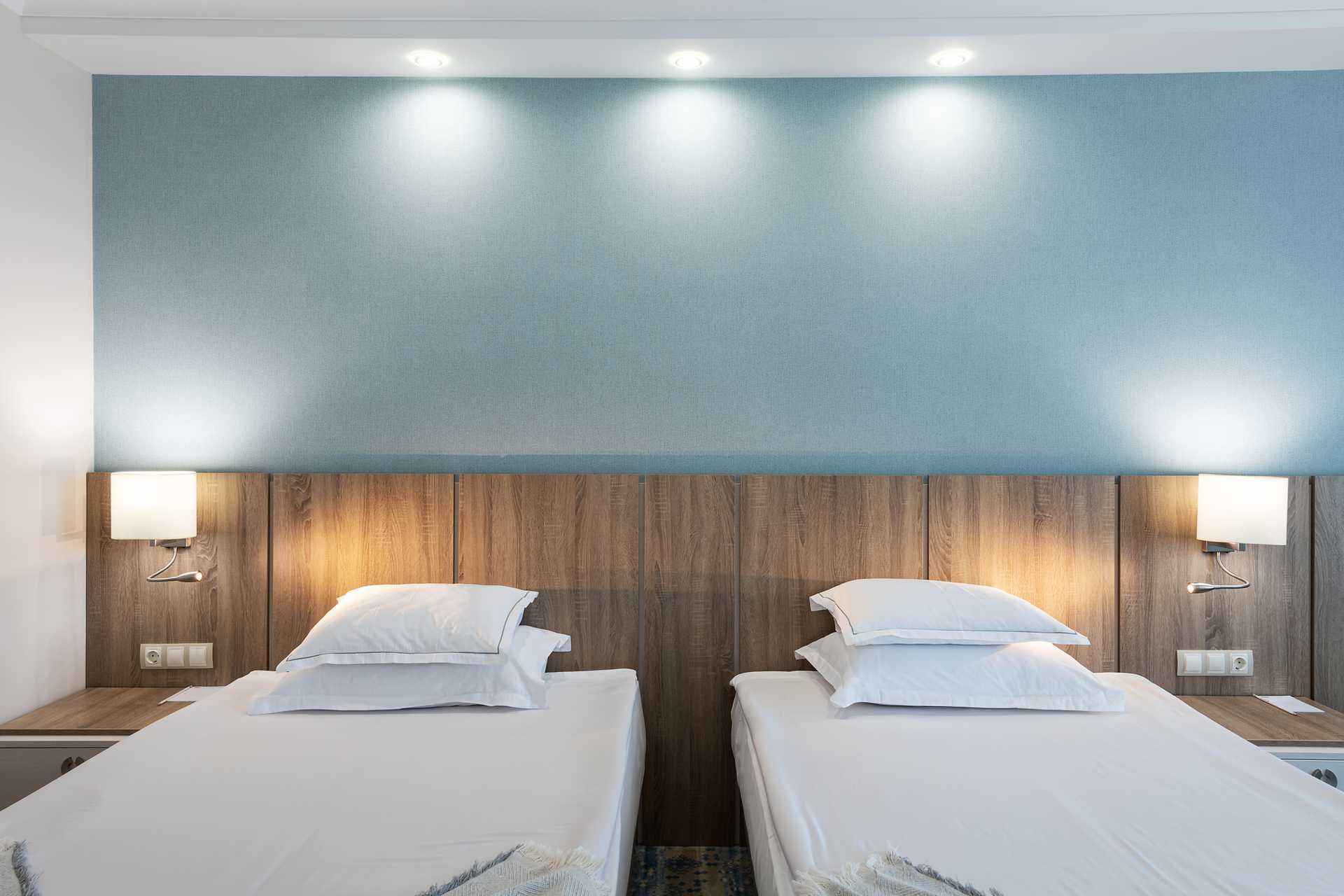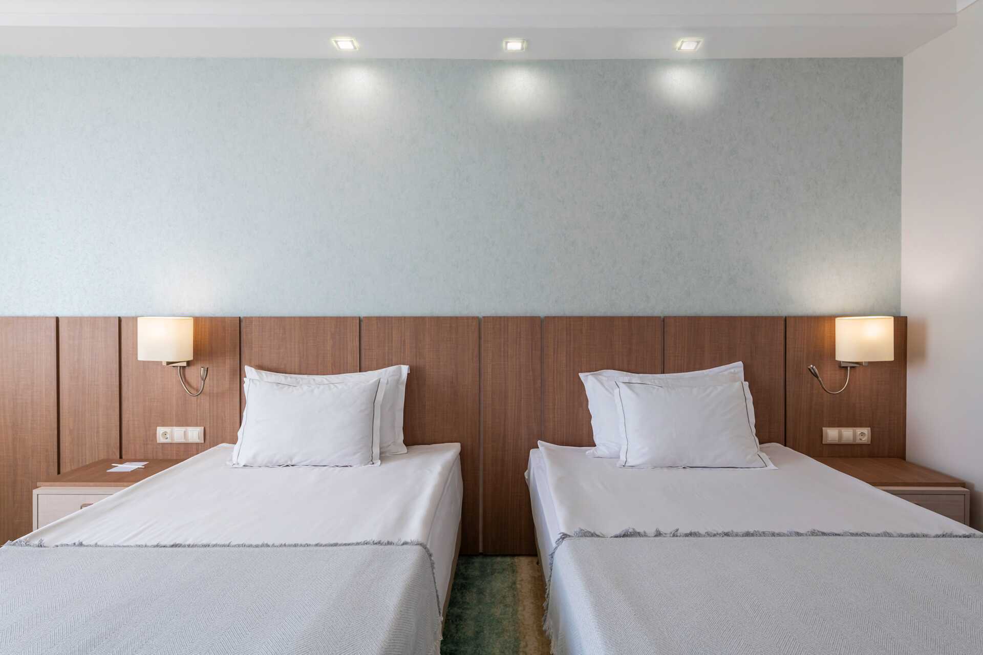 Standardrom med balkong. Rommene ligger i hotellets sidebygning. To enkeltsenger. Wifi, luftkondisjonering og safe inkludert. Vegg-til-vegg-teppe. Minibar mot avgift. Kaffemaskin – kapsler er inkludert og etterfylles i løpet av uken. TV. Hårføner. Dusj og wc. Rengjøring 7 ggr/uke.