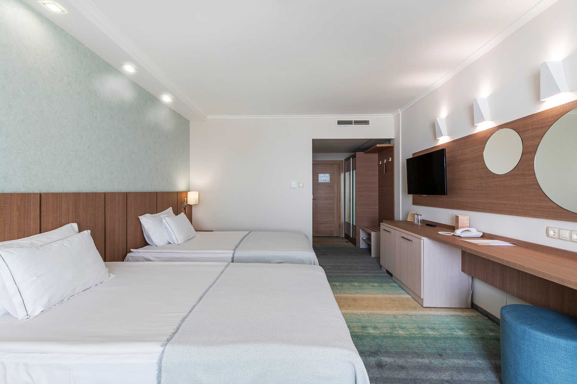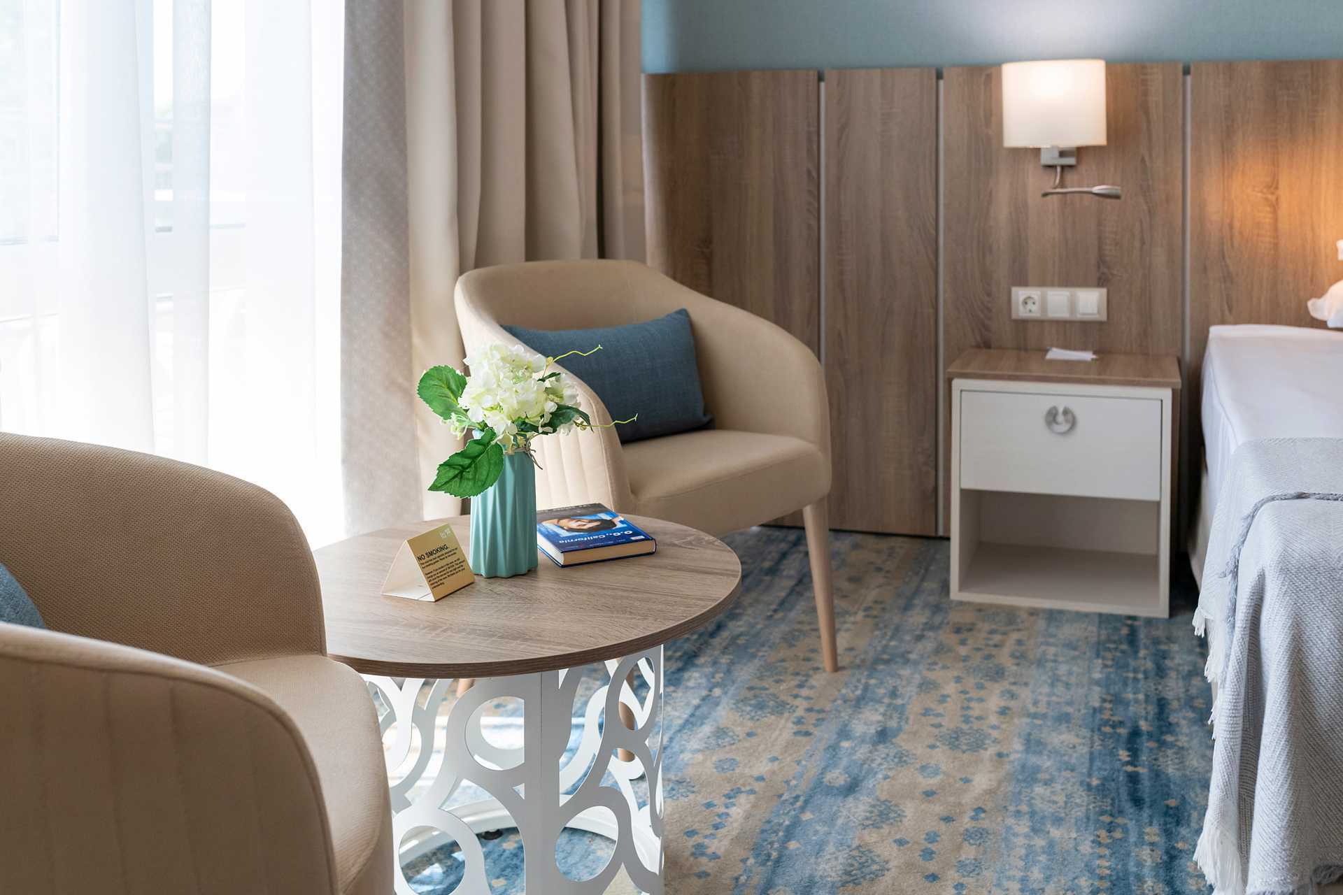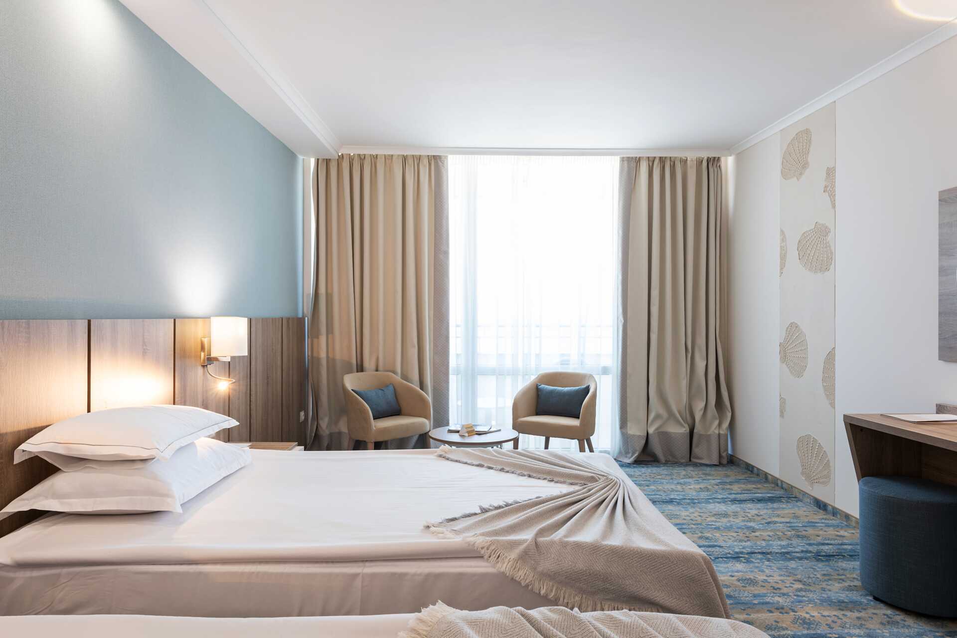 Superiorrom med balkong, noen med havutsikt. Rommene ligger i hotellets hovedbygning. To enkeltsenger. Mulig med ekstraseng i enkeltseng eller i sovesofa/opredbar lenestol. Wifi, luftkondisjonering og safe inkludert. Vegg-til-vegg-teppe. Minibar. Kaffemaskin – kapsler er inkludert og etterfylles i løpet av uken. TV. Hårføner. Baderom med dusj og wc. Rengjøring 7 ggr/uke.