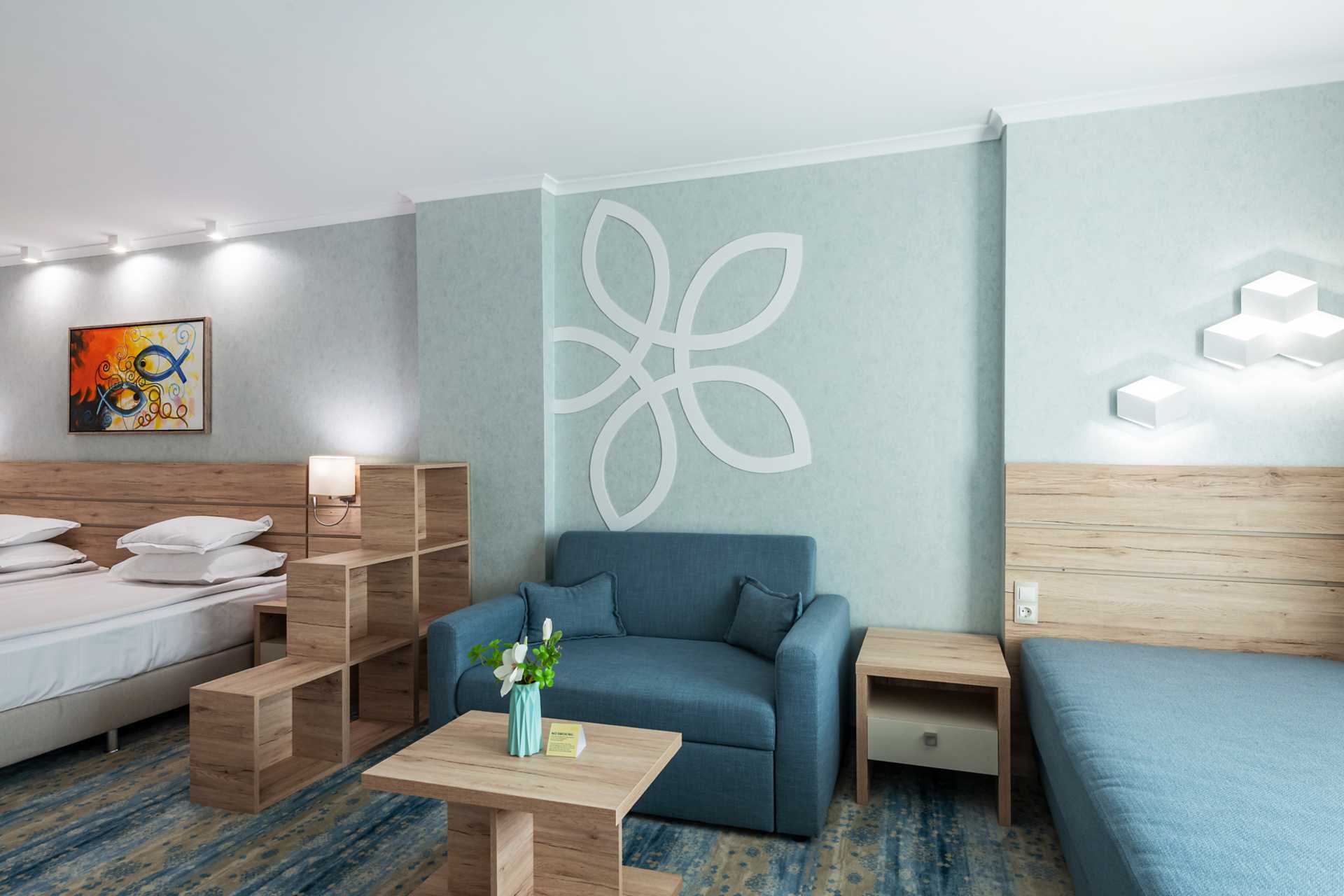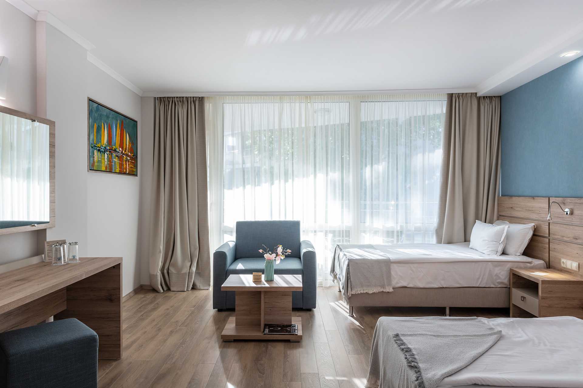 Familierom med balkong, noen med havutsikt. Rommene ligger i hotellets hovedbygning. Tre enkeltsenger eller én dobbeltseng og én enkeltseng. Mulig med ekstraseng i eksisterende senger og i en sovesofa/lenestol. Vegg-til-vegg-teppe. Wifi, luftkondisjonering og safe inkludert. Minibar, mot avgift. Kaffemaskin – kapsler er inkludert og etterfylles i løpet av uken. TV. Hårføner. Baderom med dusj og wc. Rengjøring 7 ggr/uke.