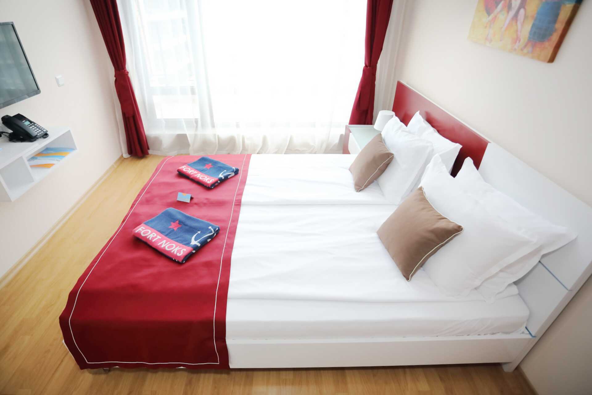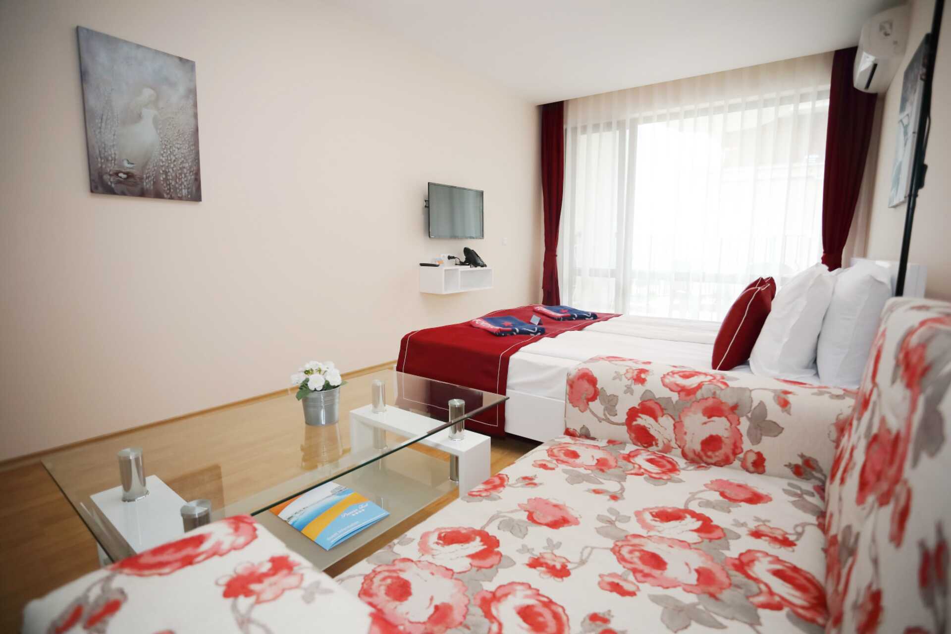 Større dobbeltrom med balkong. En dobbeltseng eller to enkeltsenger. Mulig med ekstraseng i en sovesofa eller i en feltseng. Wifi, luftkondisjonering og safe inkludert. Kjøleskap. Mikrobølgeovn. Vannkoker. TV. Strykejern og strykebrett. Hårføner. Baderom med dusj og wc. Rengjøring 7 ggr/uke.