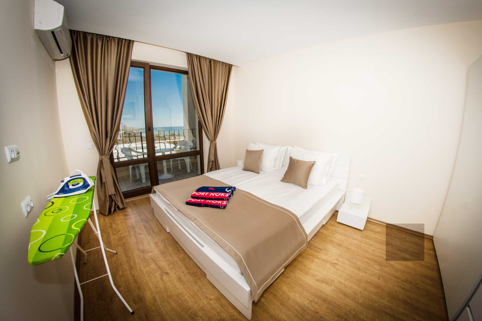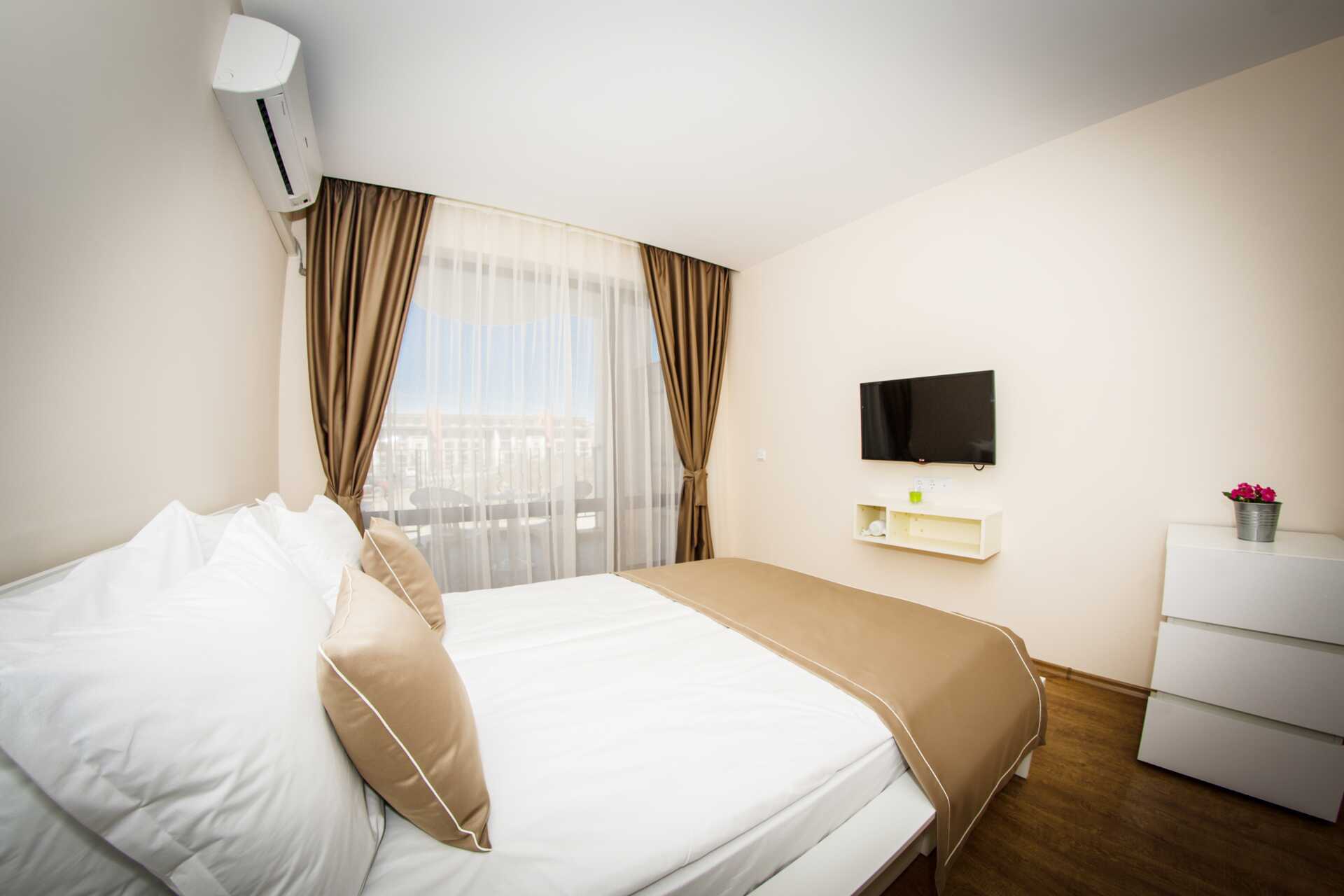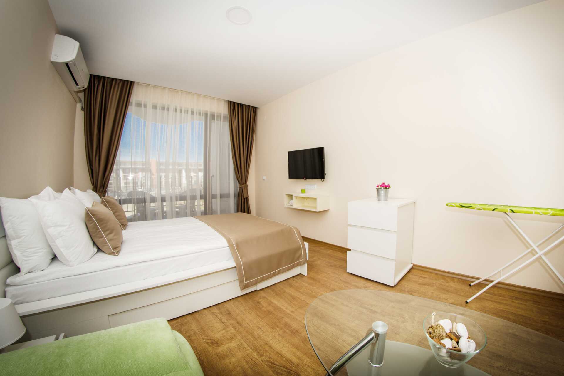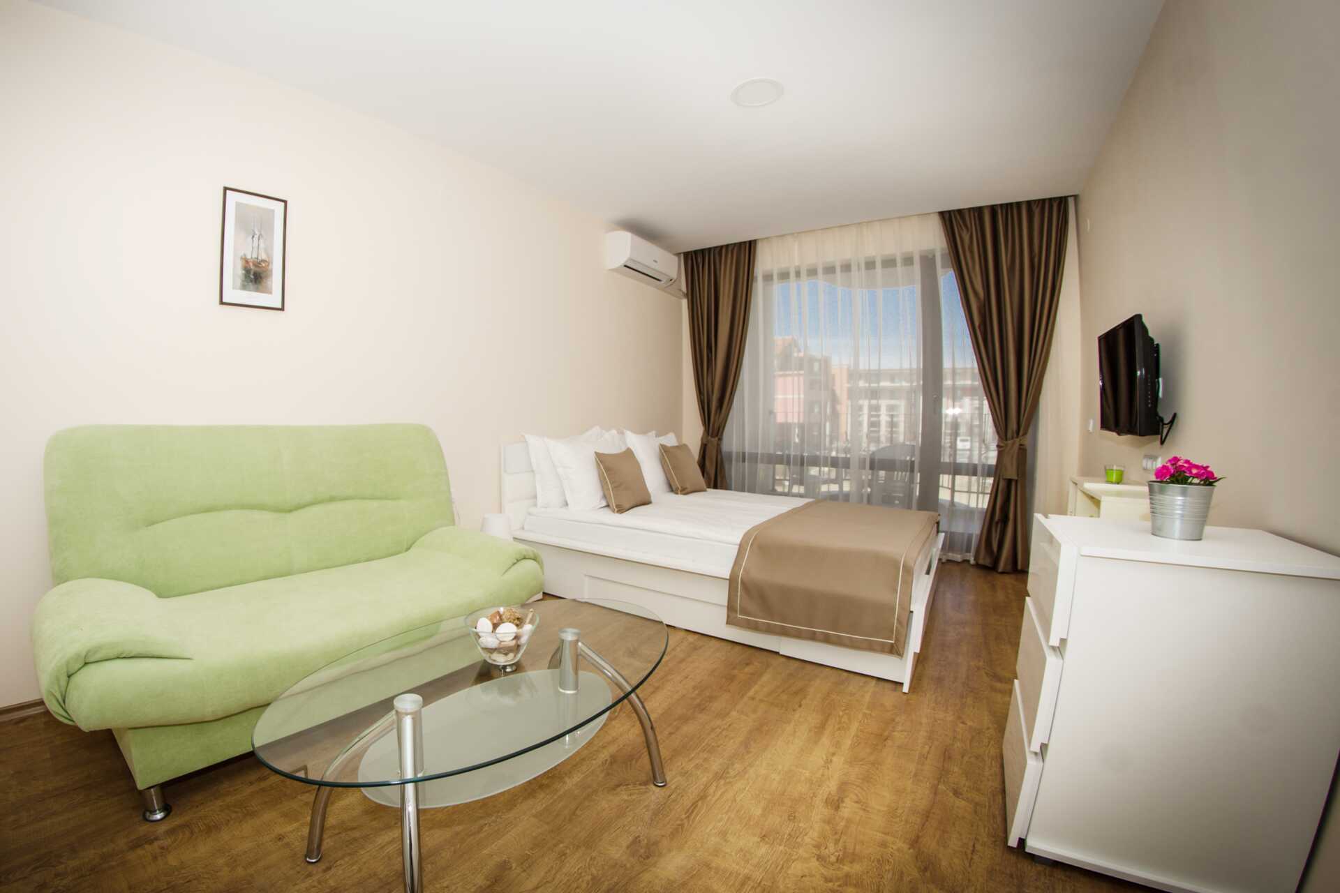 Toromsleilighet med balkong. Et soverom og en stue med minikjøkken. En dobbeltseng. Mulig med ekstraseng i sovesofa. Minikjøkken med kokeplater, vifte, kjøleskap, vannkoker, brødrister, mikrobølgeovn og enkel kjøkkenutstyr. Noen av leilighetene har også stekeovn. Wifi, luftkondisjonering og safe inkludert. TV. Vaskemaskin. Strykejern og strykebrett. Hårføner. Baderom med dusj og wc. Rengjøring 7 ggr/uke.