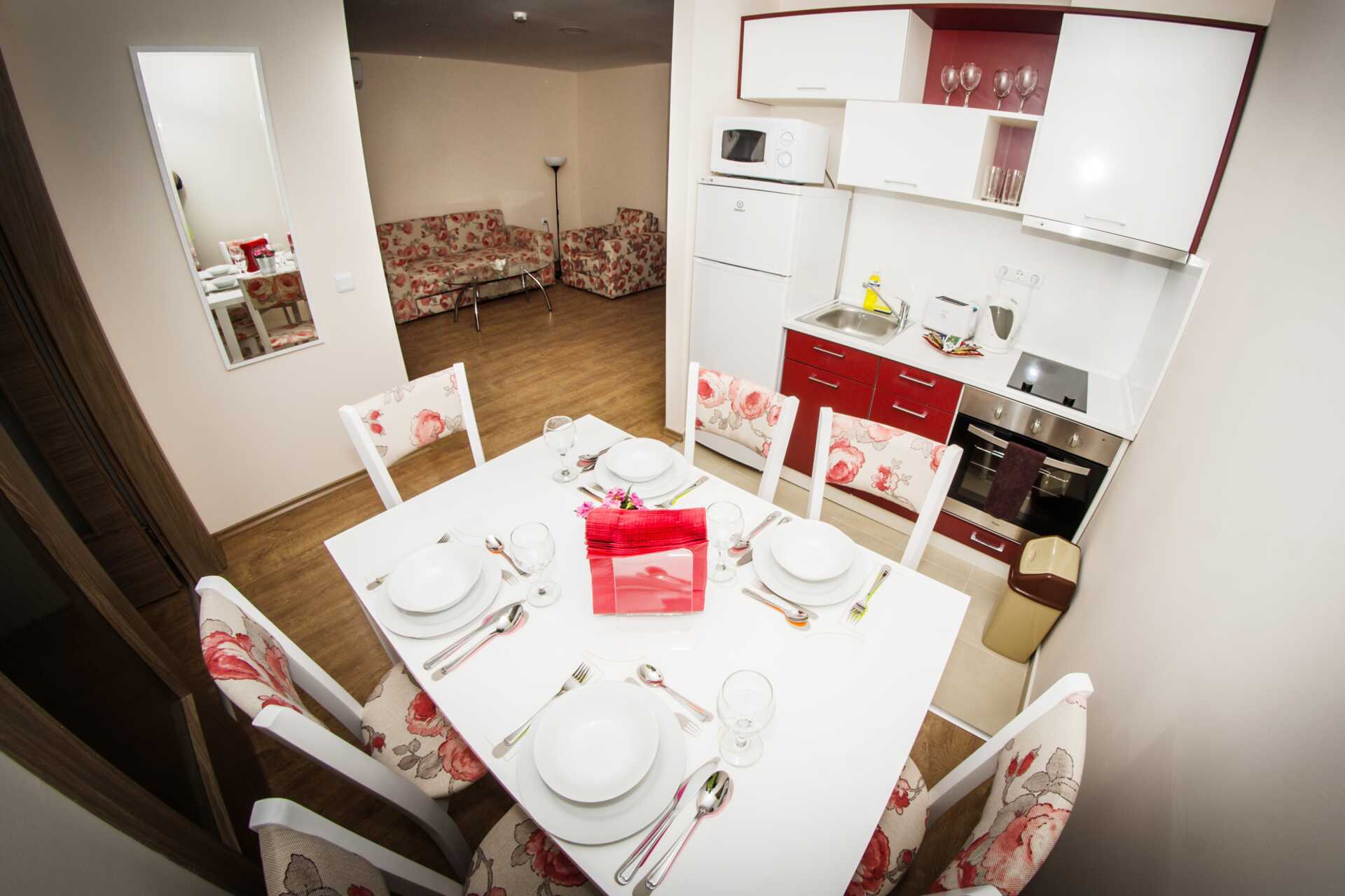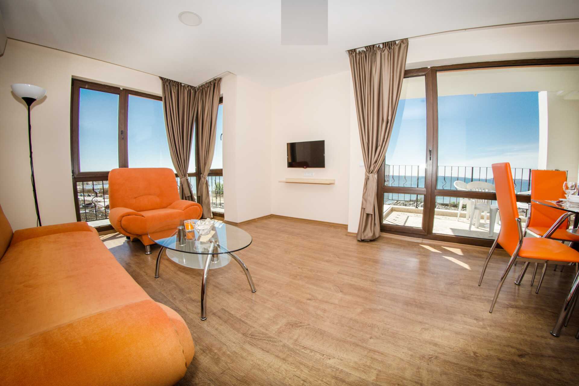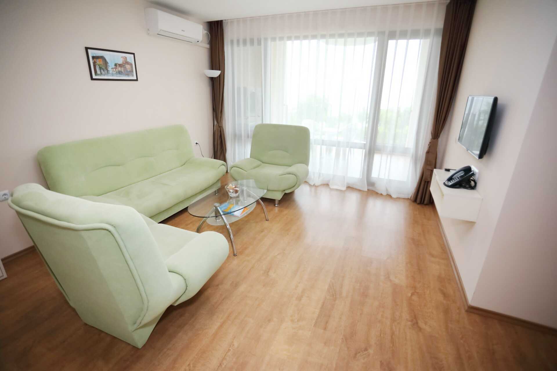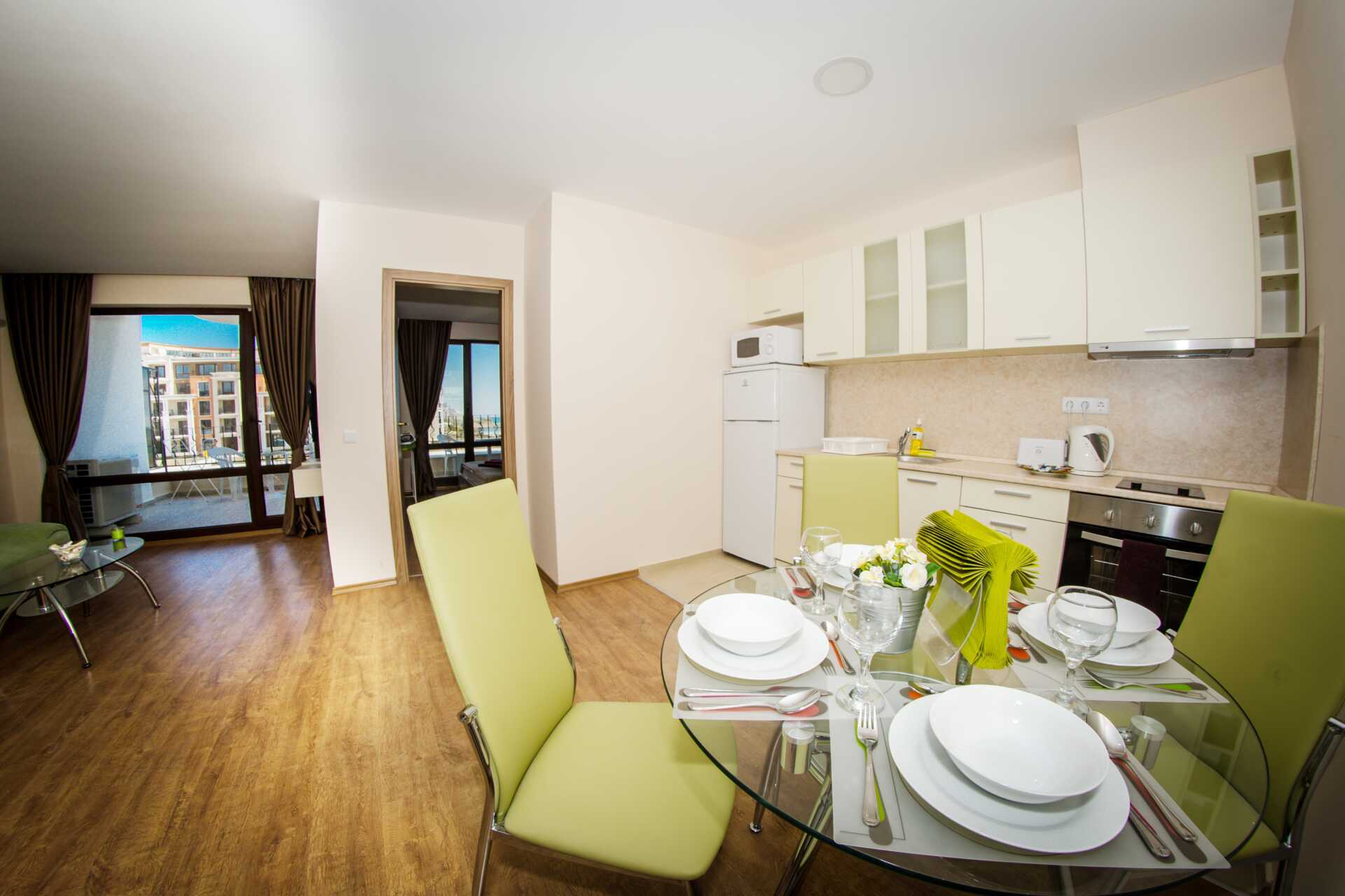 Toromsleilighet med balkong. Et soverom og en stue med minikjøkken. En dobbeltseng. Mulig med ekstraseng i sovesofa. Minikjøkken med kokeplater, vifte, kjøleskap, vannkoker, brødrister, mikrobølgeovn og enkel kjøkkenutstyr. Noen av leilighetene har også stekeovn. Wifi, luftkondisjonering og safe inkludert. TV. Vaskemaskin. Strykejern og strykebrett. Hårføner. Baderom med dusj og wc. Rengjøring 7 ggr/uke.