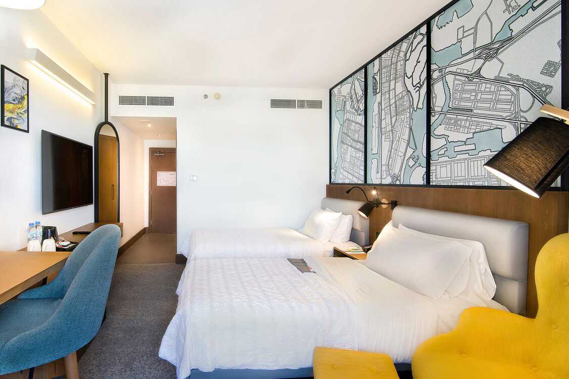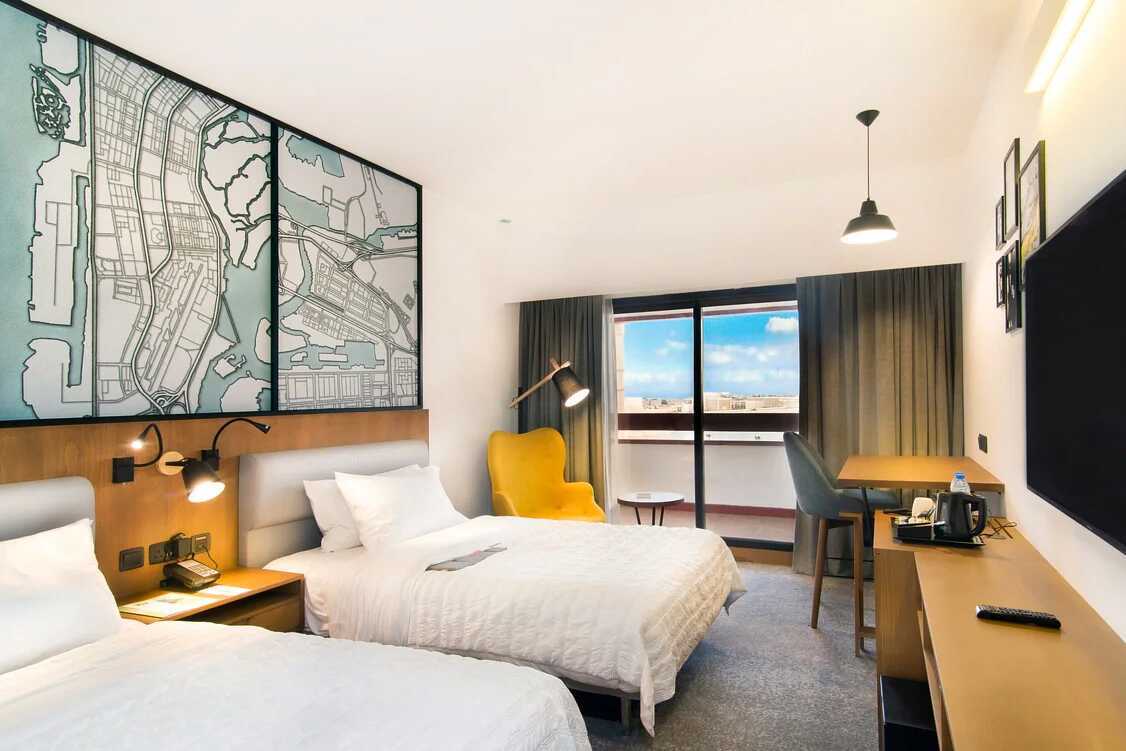 Deluxerom, noen med balkong og andre uten uteplass. En dobbeltseng eller to enkeltsenger. Wifi, luftkondisjonering og safe inkludert. Minibar. Vannkoker samt kaffe og te. TV. Strykebrett og strykejern. Badekåper og tøfler. Dusj og wc, hårføner. Rengjøring 7 ggr/uke.