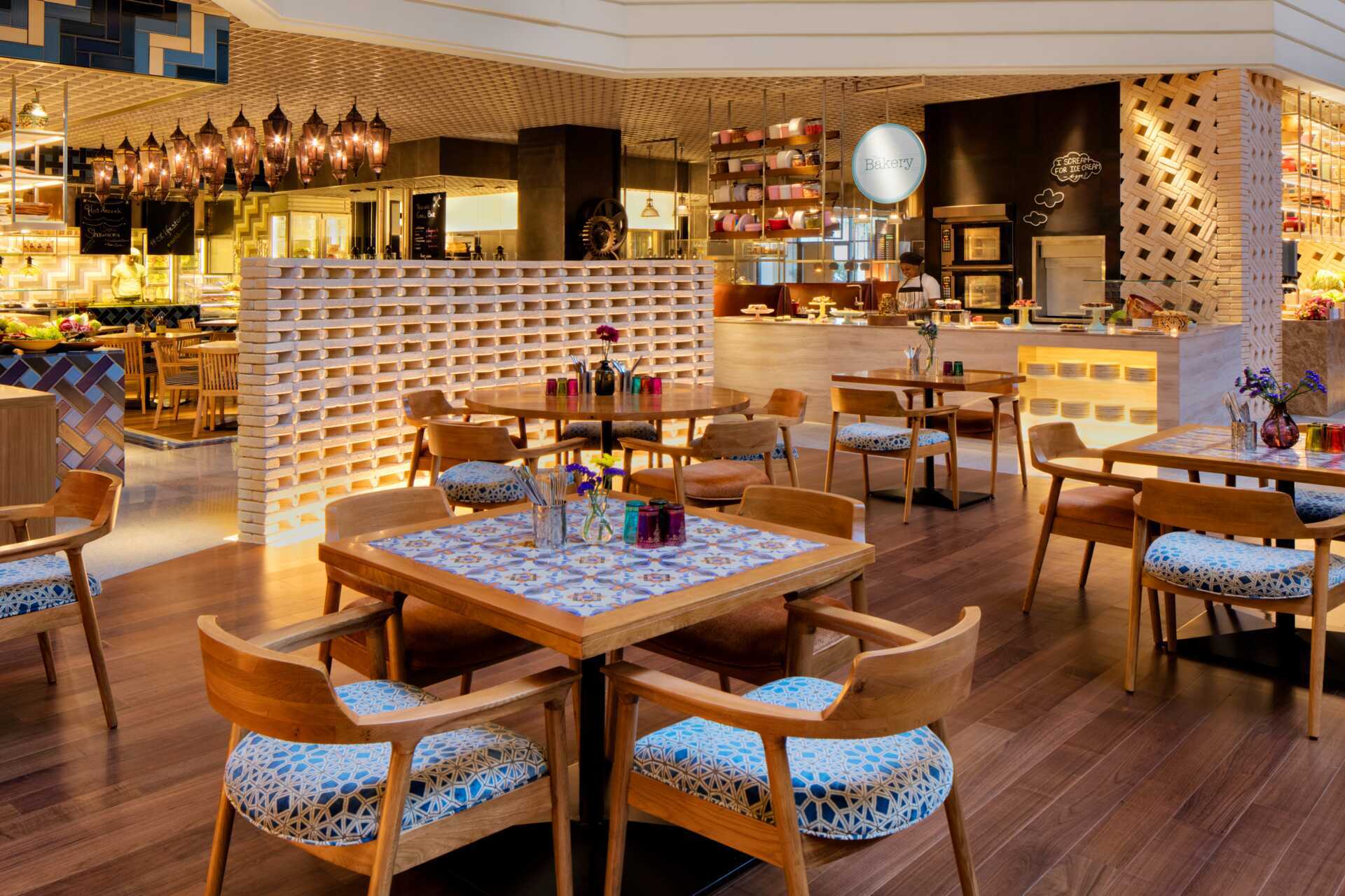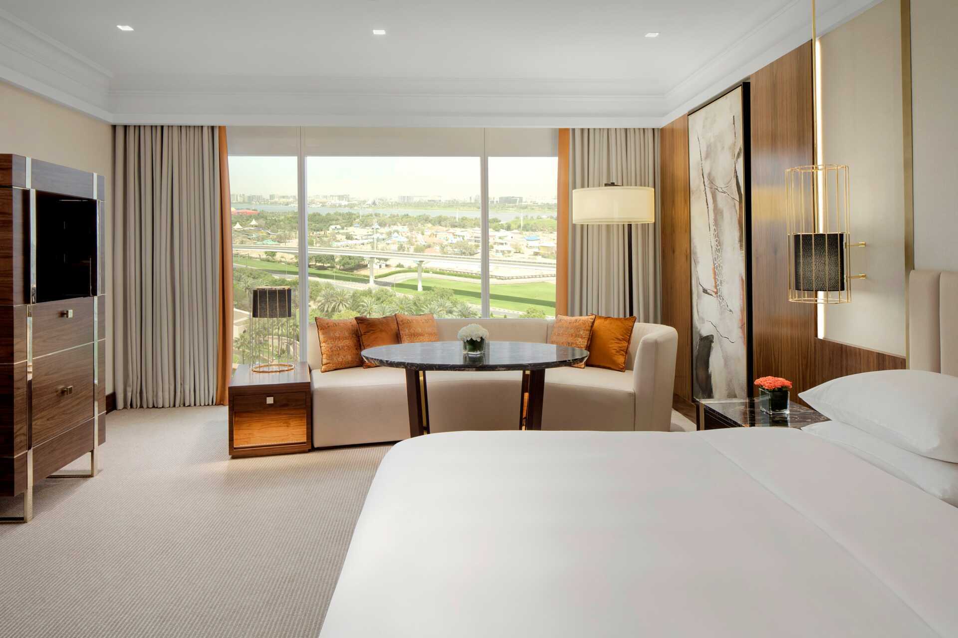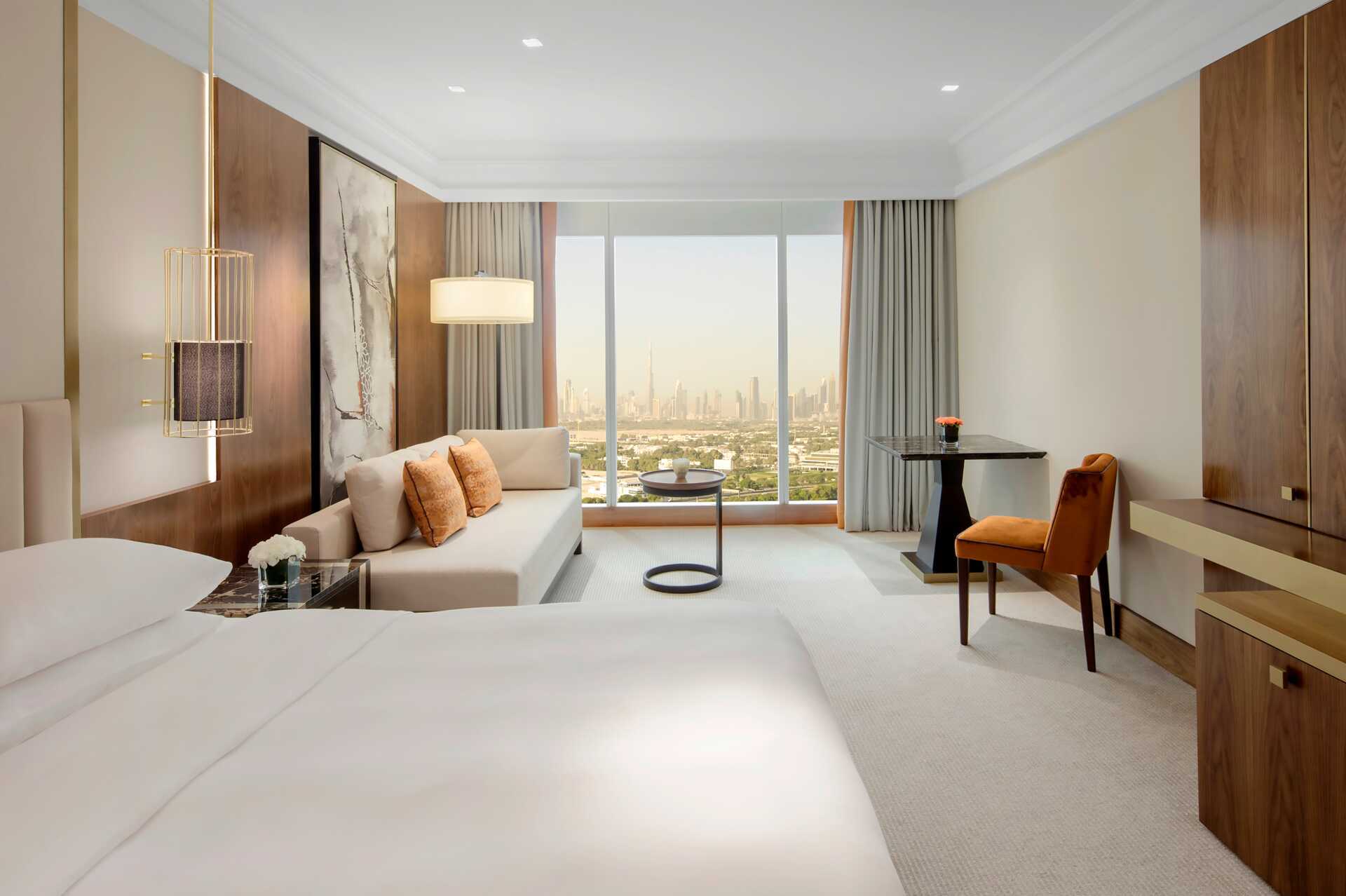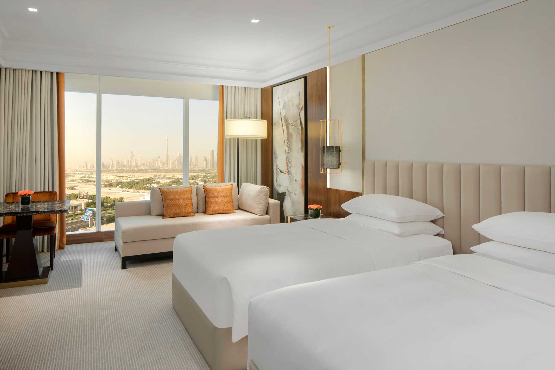 Deluxerom, noen med utsikt mot Dubais skyline. Rommene har ikke uteplass. En dobbeltseng eller to enkeltsenger. Mulig med en ekstraseng i sovesofa. Wifi, luftkondisjonering og safe inkludert. Vegg-til-vegg-teppe. Minibar. Kaffemaskin. TV. Strykejern og strykebrett. Hårføner. Badekåper og tøfler Baderom med badekar eller dusj samt wc. Rengjøring 7 ggr/uke. Barn under 2 år regnes inn i maksantallet i rommet.
