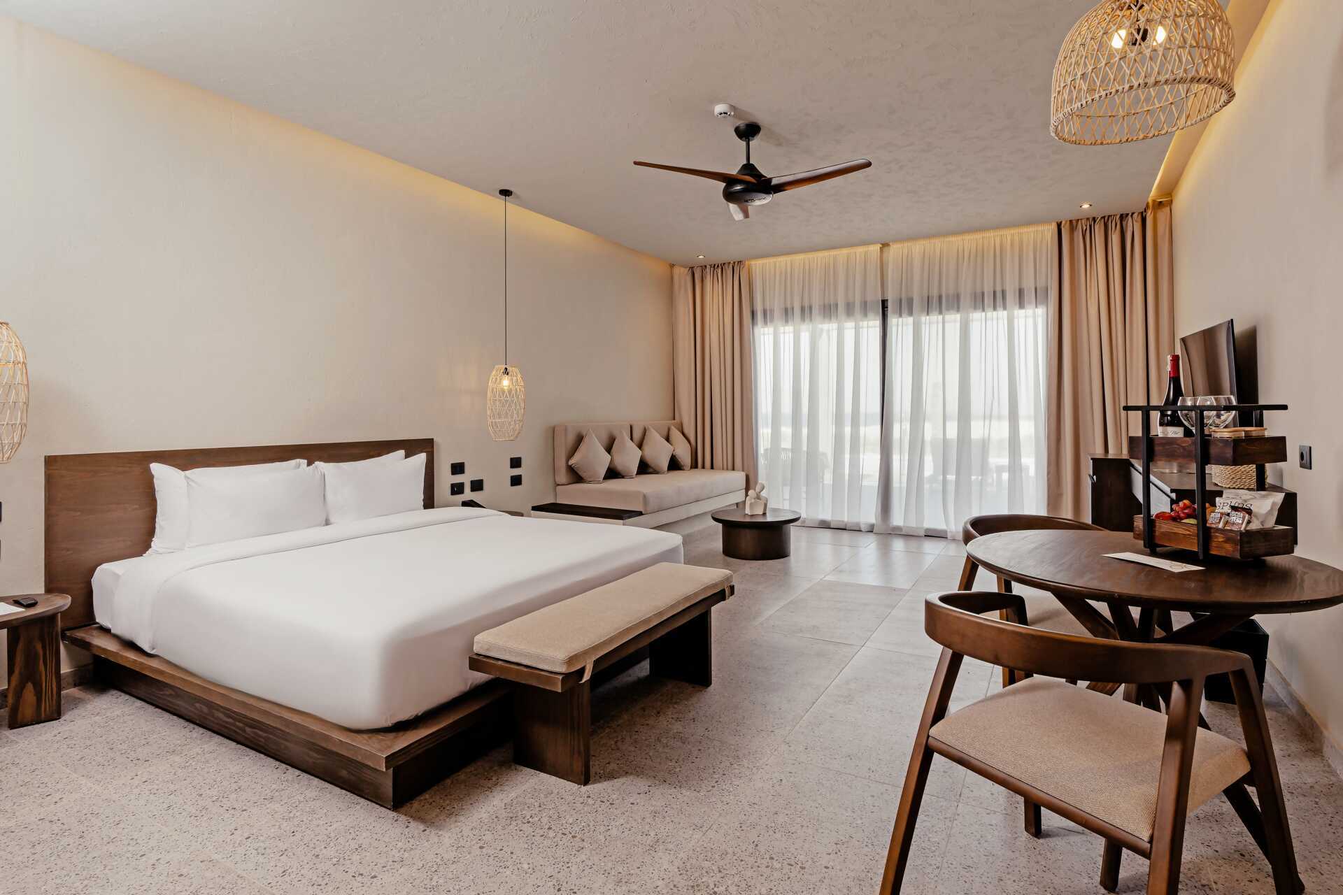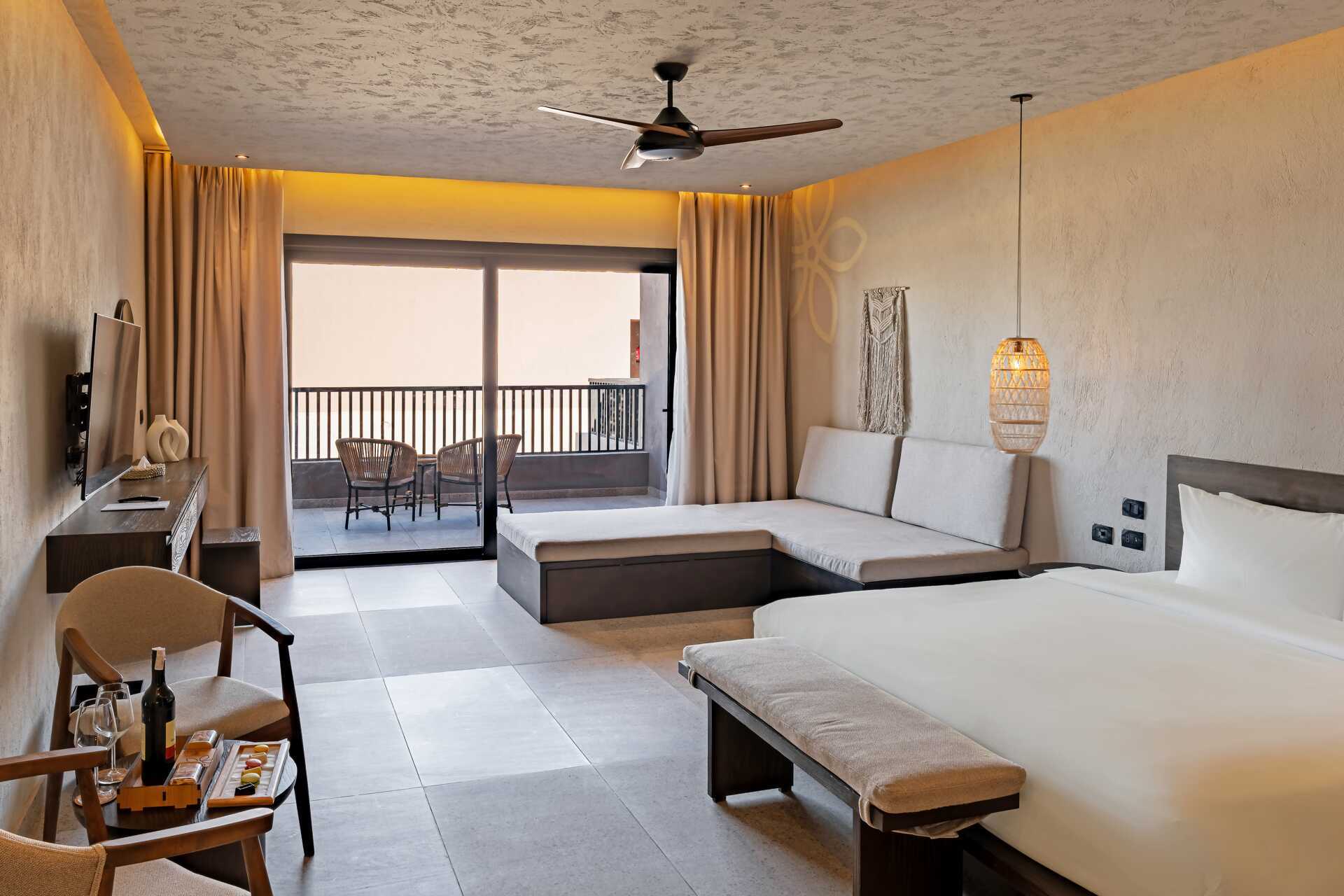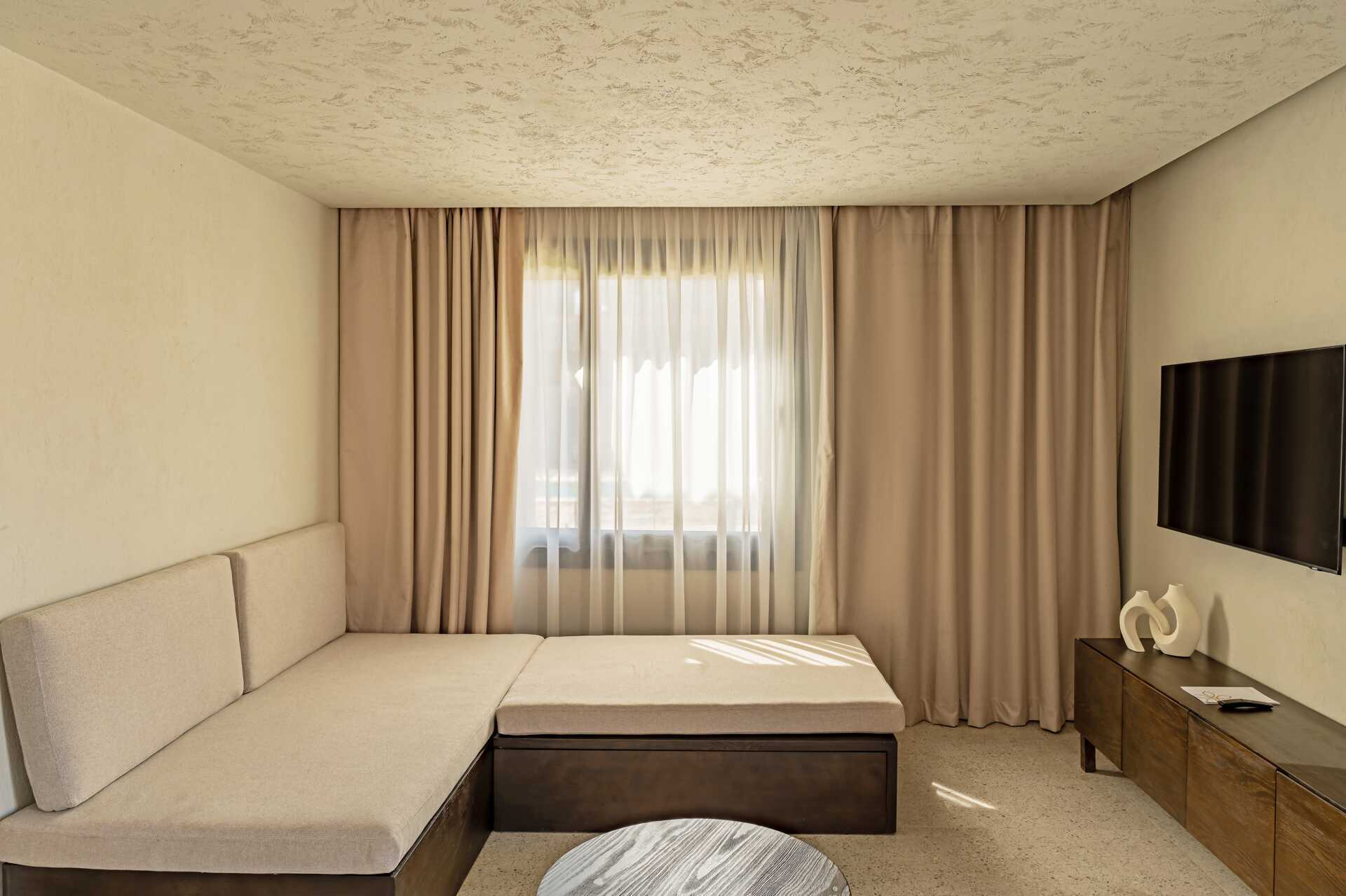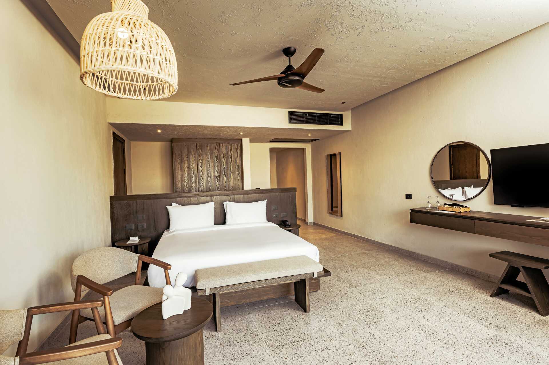 Suite med markterrasse og havutsikt. En dobbeltseng eller to enkeltsenger. Mulig med ekstrasenger i sovesofa. Wifi, luftkondisjonering og safe inkludert. Minibar. Vannkoker samt kaffe og te. TV. Hårføner. Dusj og wc. Rengjøring 7 ggr/uke.