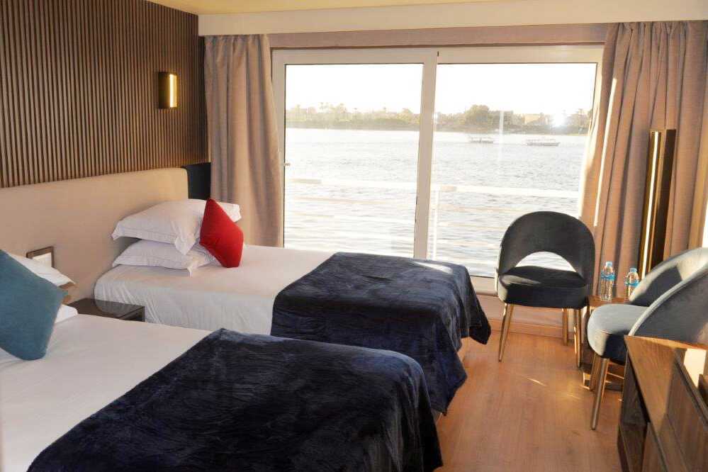Lugar med store vinduer. En dobbeltseng eller to enkeltsenger. Lugarene, som ble renovert i 2024, varierer i innredning og størrelse. Baderom med dusj og wc. Hårføner. Luftkondisjonering og safe inkludert. Minibar og TV. TV-en fungerer kun når skipet ligger ved kai. Barn under 2 år regnes inn i maksantallet i rommet.