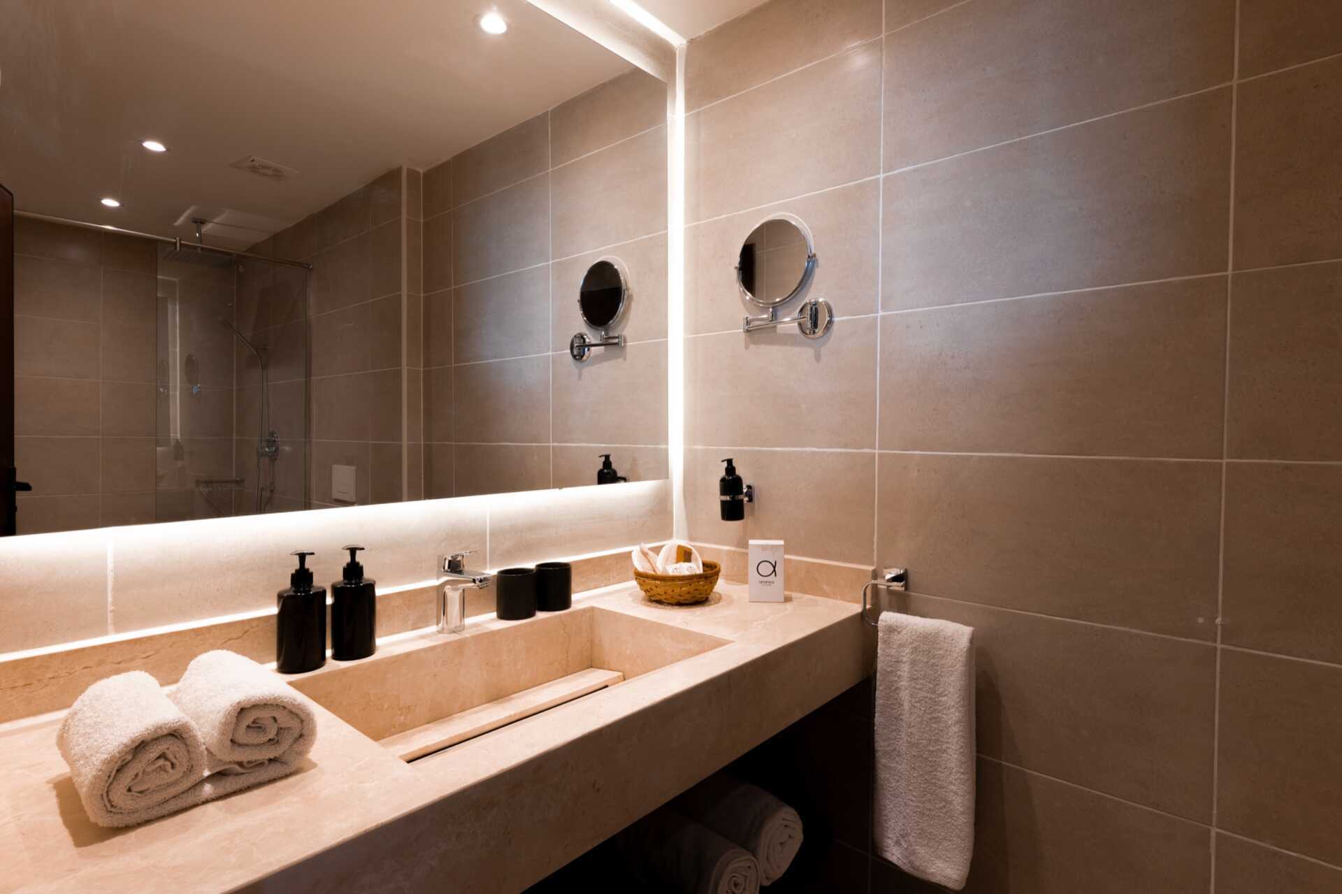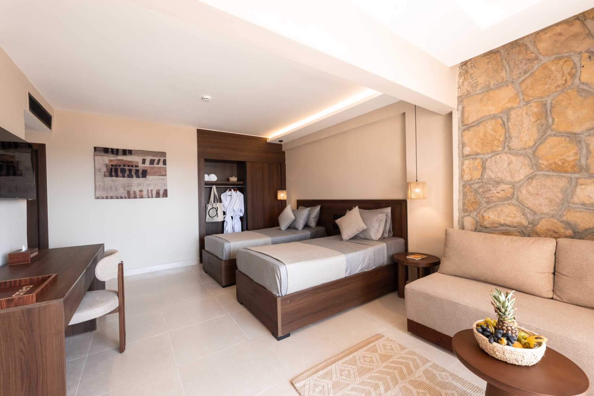 Juniorsuite med balkong eller terrasse og havutsikt. Rommene ligger i hotellets hovedbygning. En dobbeltseng eller to enkeltsenger. Wifi, luftkondisjonering og safe inkludert. Minibar. Vannkoker samt kaffe og te. TV. Noen av rommene har vegg-til-vegg-teppe. Hårføner. Bad med jacuzzi, dusj og wc. Rengjøring 7 ggr/uke.