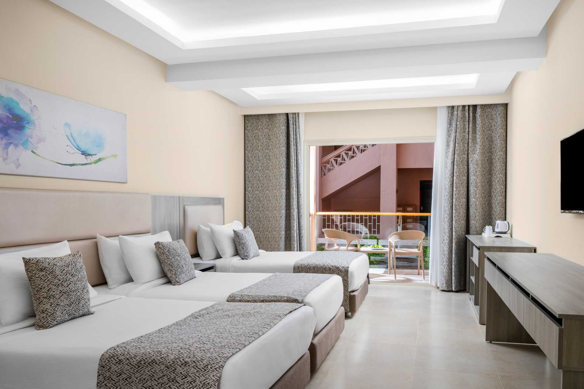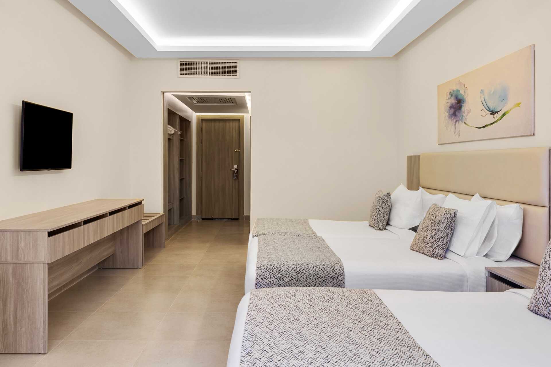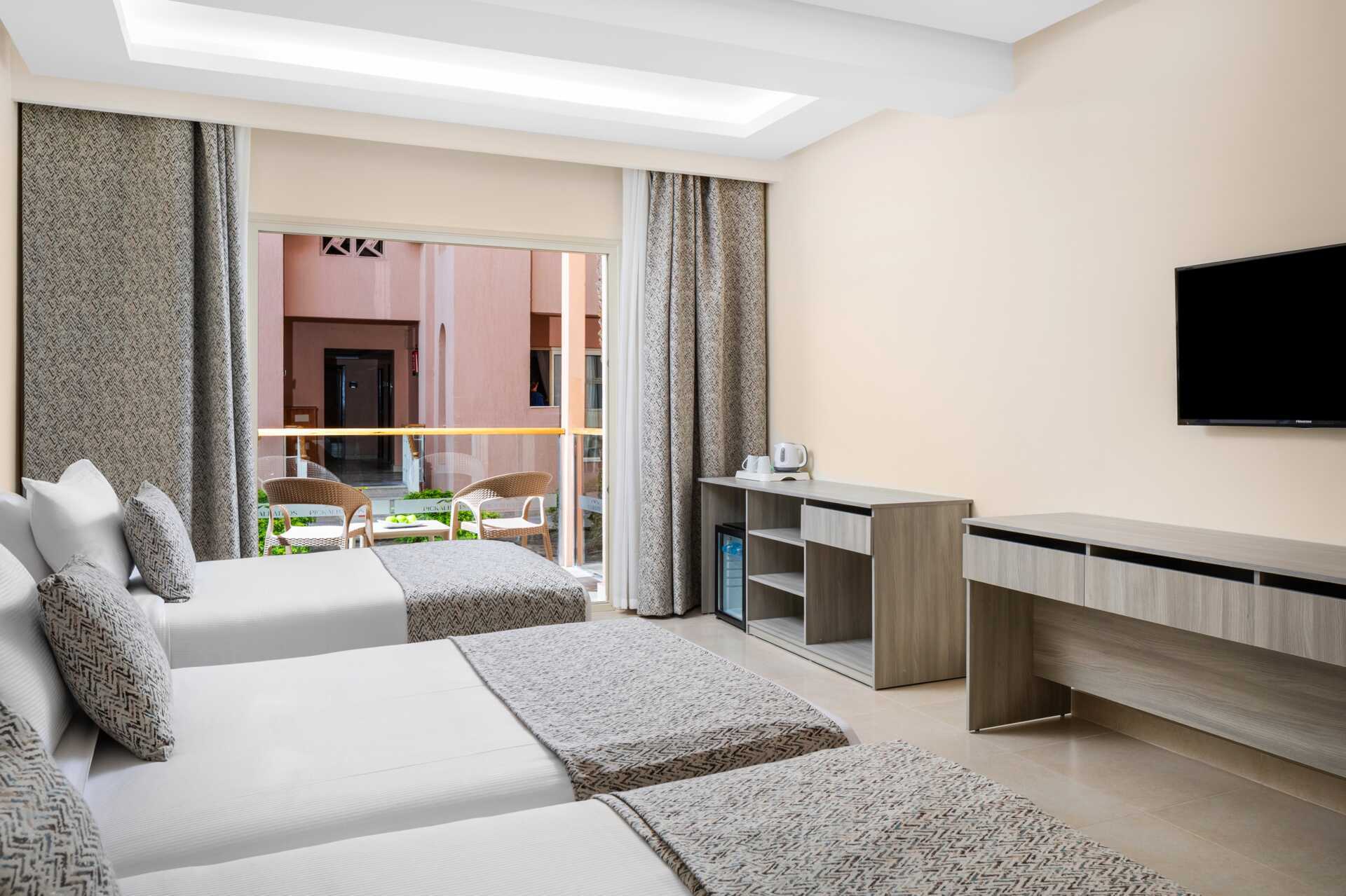 Familierom med balkong eller terrasse, noen med bassengutsikt. Familierommet består av to soverom. En dobbeltseng på det ene soverommet og to enkeltsenger på det andre soverommet. Wifi, luftkondisjonering og safe inkludert. Minibar fylt med gratis vann. TV. Hårføner. Bad med dusj og wc. Rengjøring 7 ggr/uke.