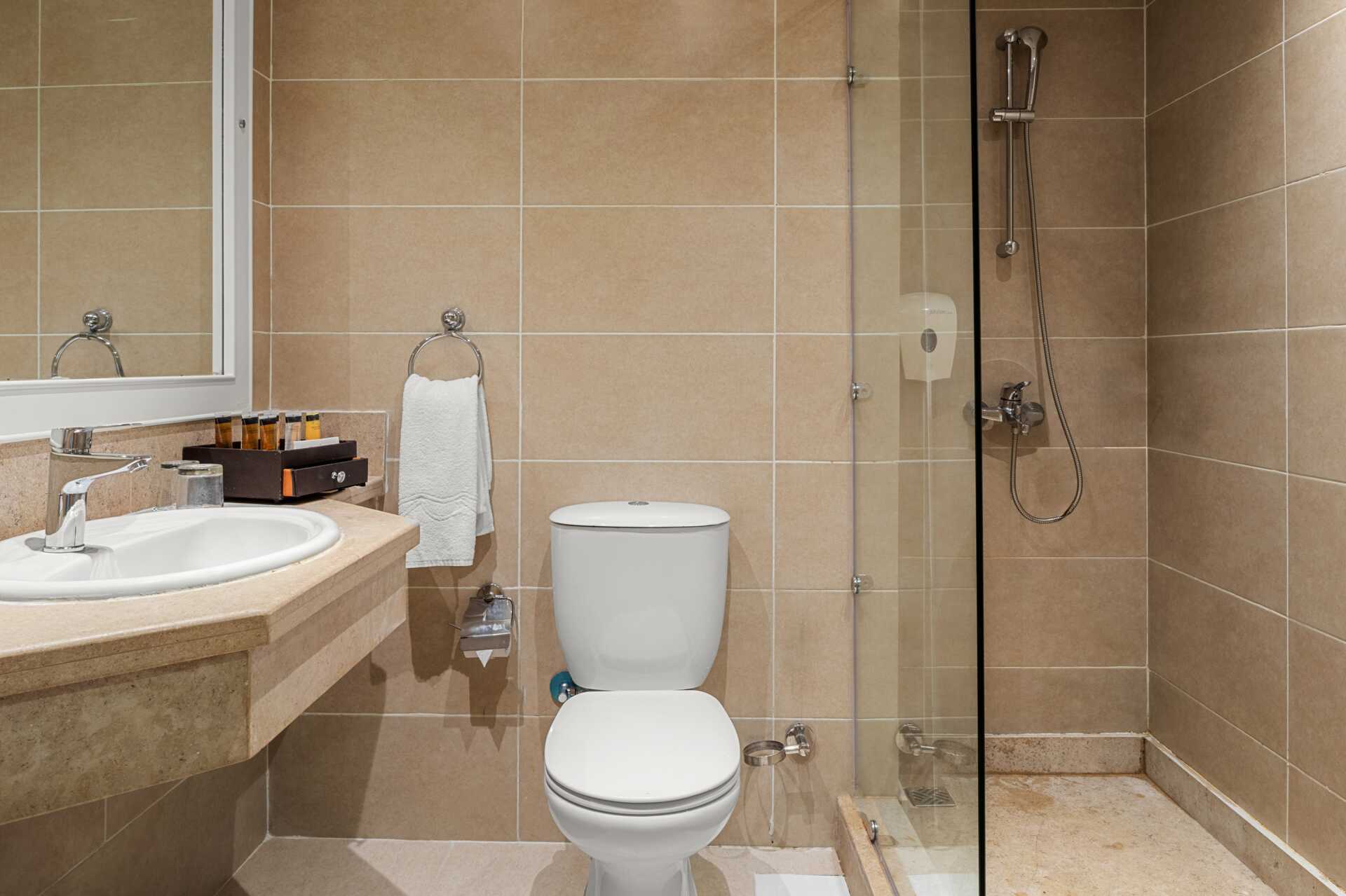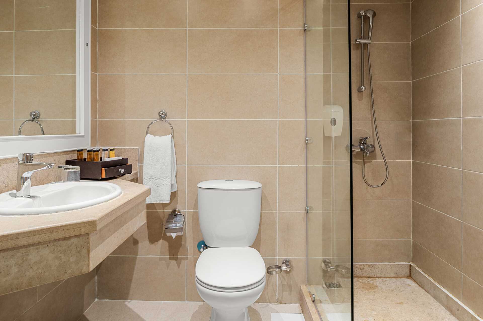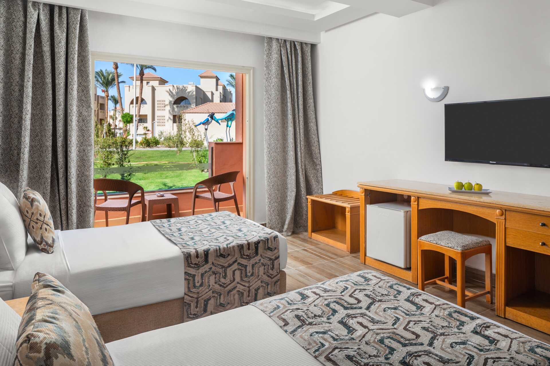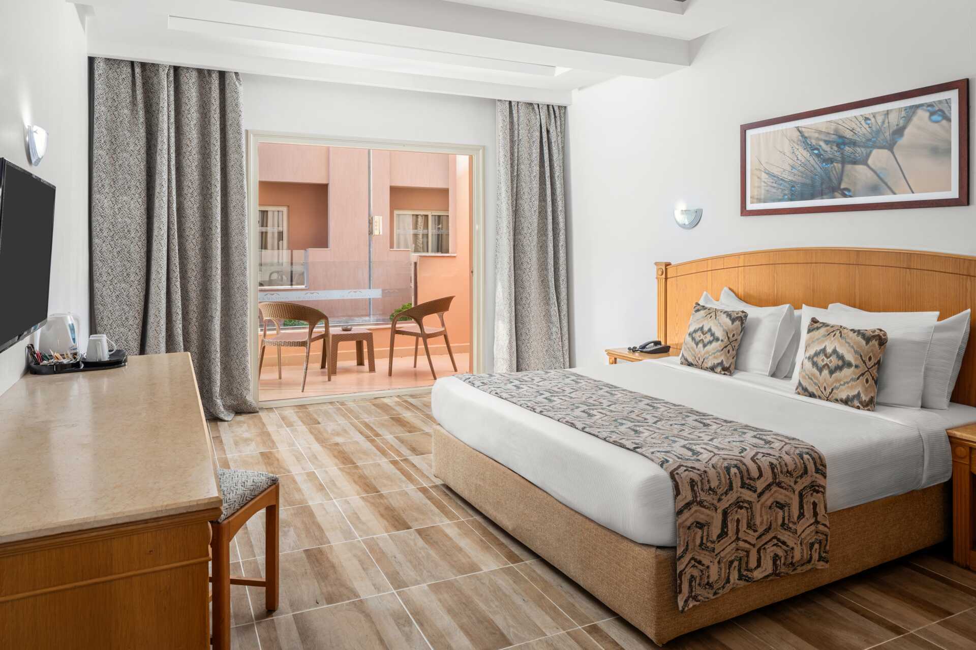 Dobbeltrom med balkong eller terrasse, noen med bassengutsikt. En dobbeltseng eller en dobbeltseng og en enkeltseng. Mulig med en ekstraseng i sovesofa eller enkeltseng. Wifi, luftkondisjonering og safe inkludert. Vannkoker samt kaffe og te. Minibar som fylles med vann uten kostnad. TV. Hårføner. Bad med dusj og wc. Rengjøring 7 ggr/uke.