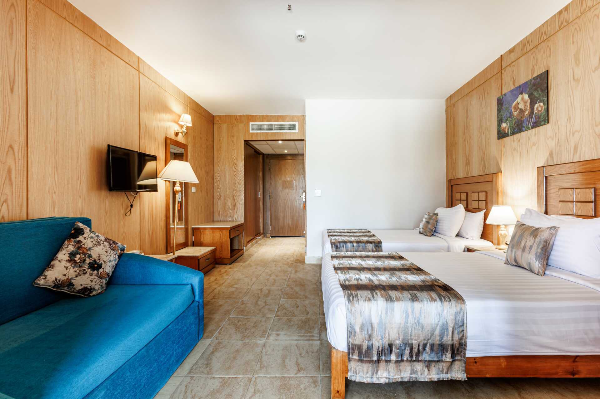 Familierom superior med balkong eller terrasse. To soverom, et med en dobbeltseng og et med to enkeltsenger. Wifi, luftkondisjonering og safe inkludert. Minibar fylt med brus og vann ved ankomst. Vannkoker samt kaffe og te. TV. Badekåper og tøfler Hårføner. Dusj og wc. Rengjøring 7 ggr/uke.