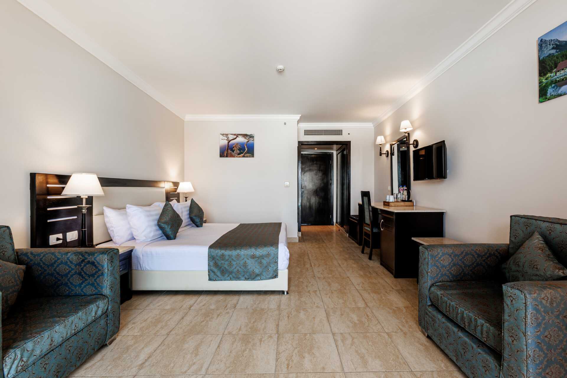 Superiorrom med balkong eller terrasse, noen med utsikt mot bassenget eller havet. En dobbeltseng eller to enkeltsenger. Mulig med ekstraseng for en tredje person. Wifi, luftkondisjonering og safe inkludert. Minibar fylt med brus og vann ved ankomst. Vannkoker samt kaffe og te. TV. Badekåper og tøfler Hårføner. Dusj og wc. Rengjøring 7 ggr/uke.