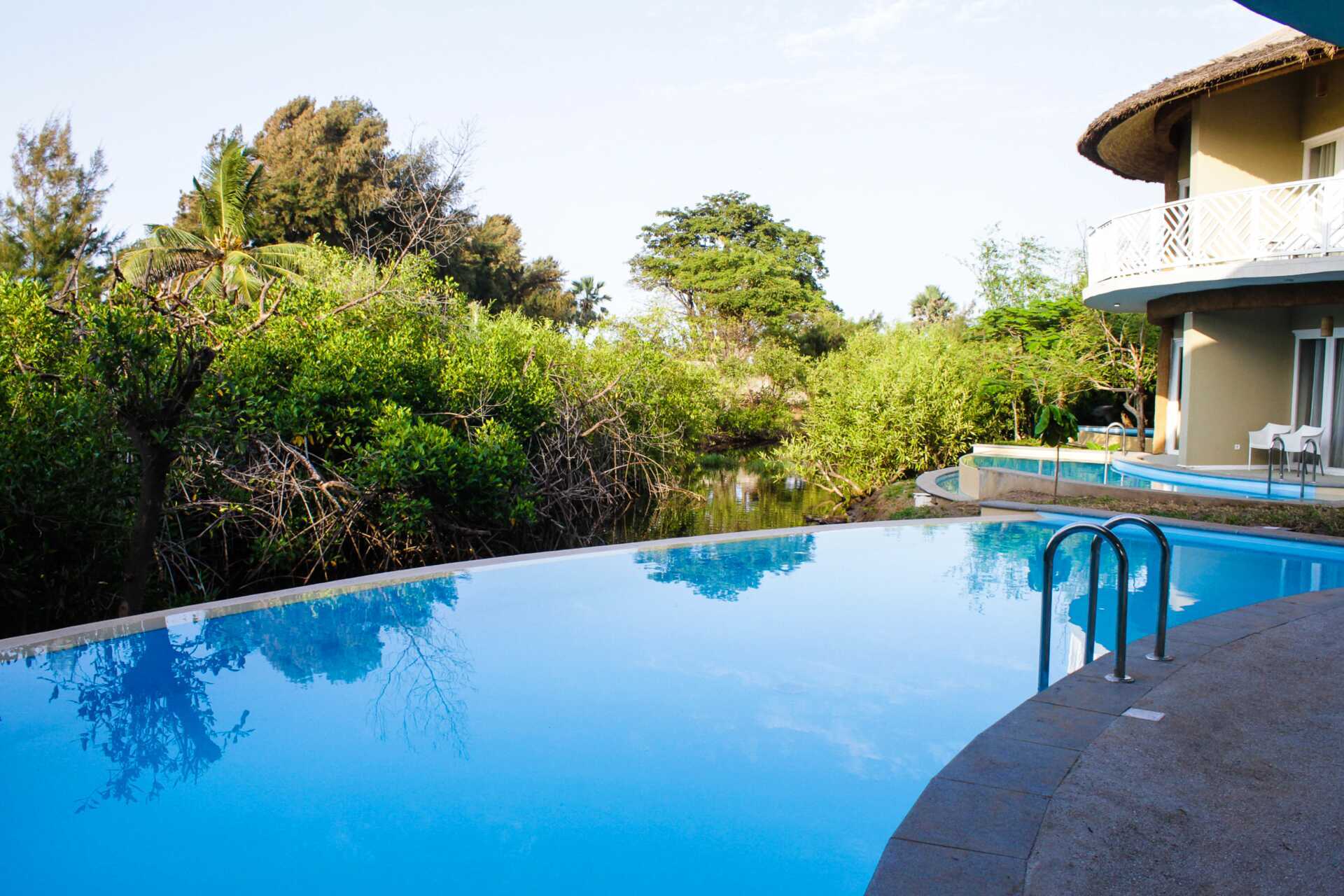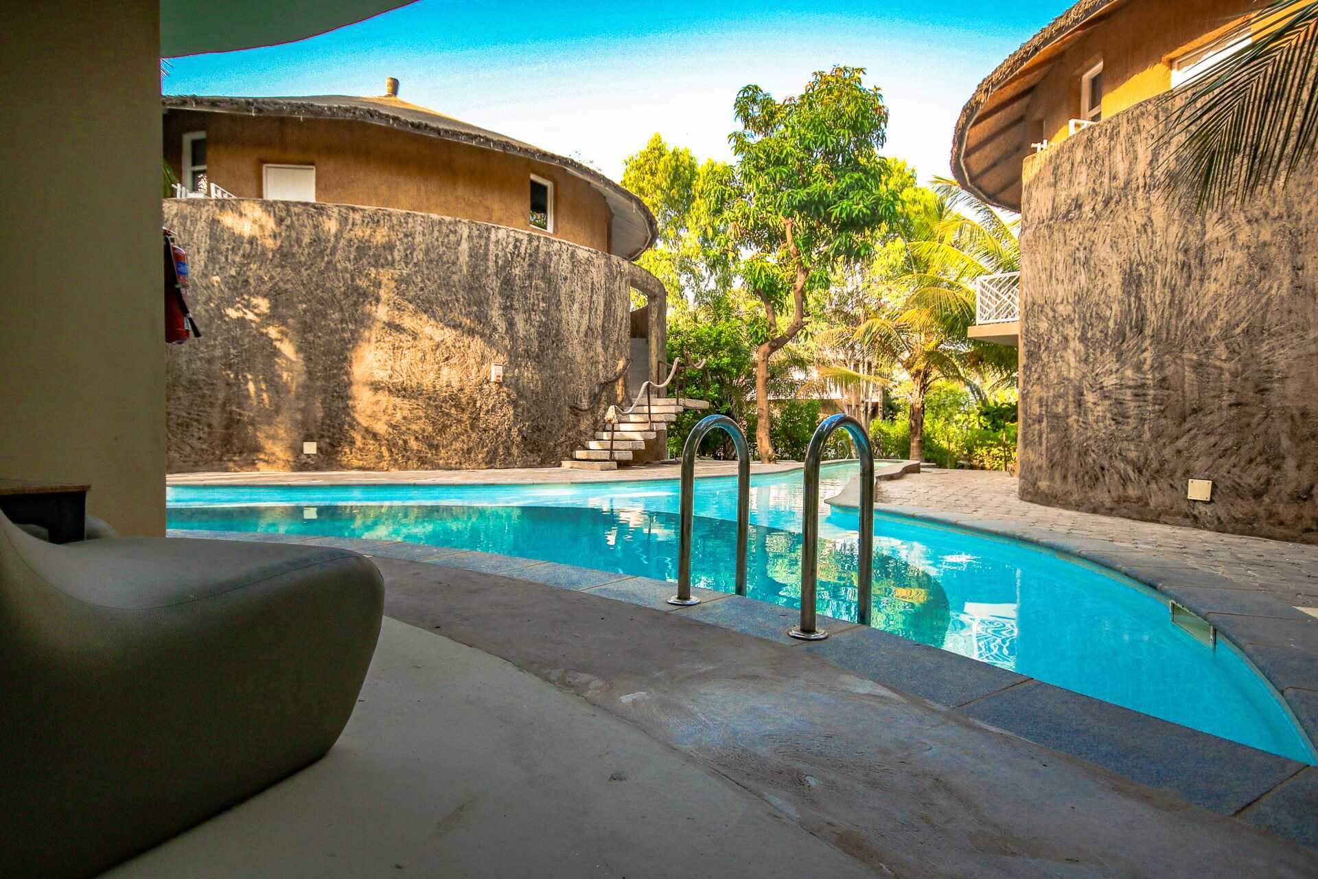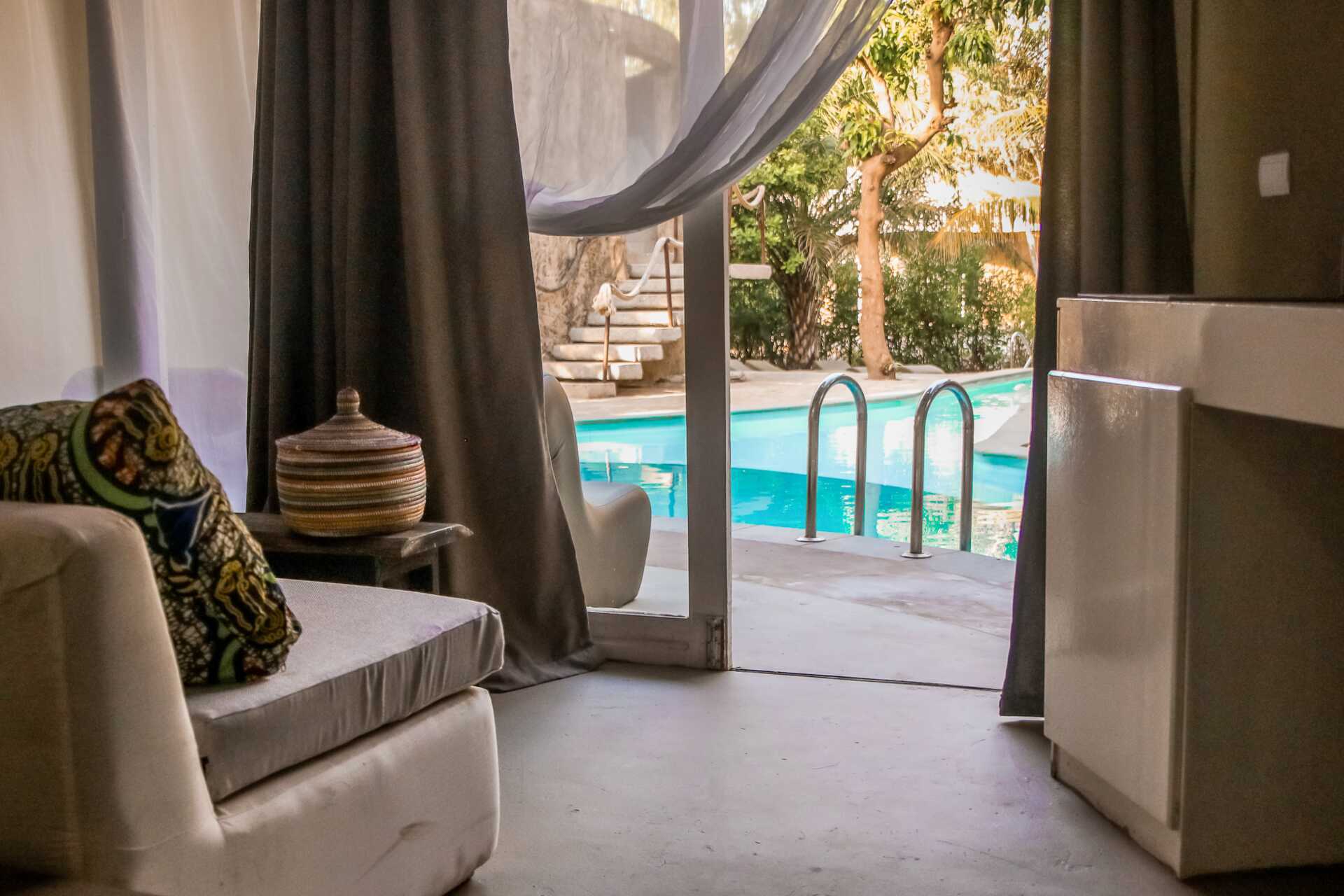 Dobbeltrom med uteplass og utgang til delt basseng. To dobbeltrom deler basseng. Rommene ligger i toetasjes bygninger med fire rom i hver bygning i hotellets hage. På terrassen er det to solsenger og en stige ned i bassenget. En dobbeltseng. Myggnett over sengen. Wifi, luftkondisjonering og safe inkludert. Takvifte. Kjøleskap. TV. Hårføner. Dusj og wc. Rengjøring 7 ggr/uke.