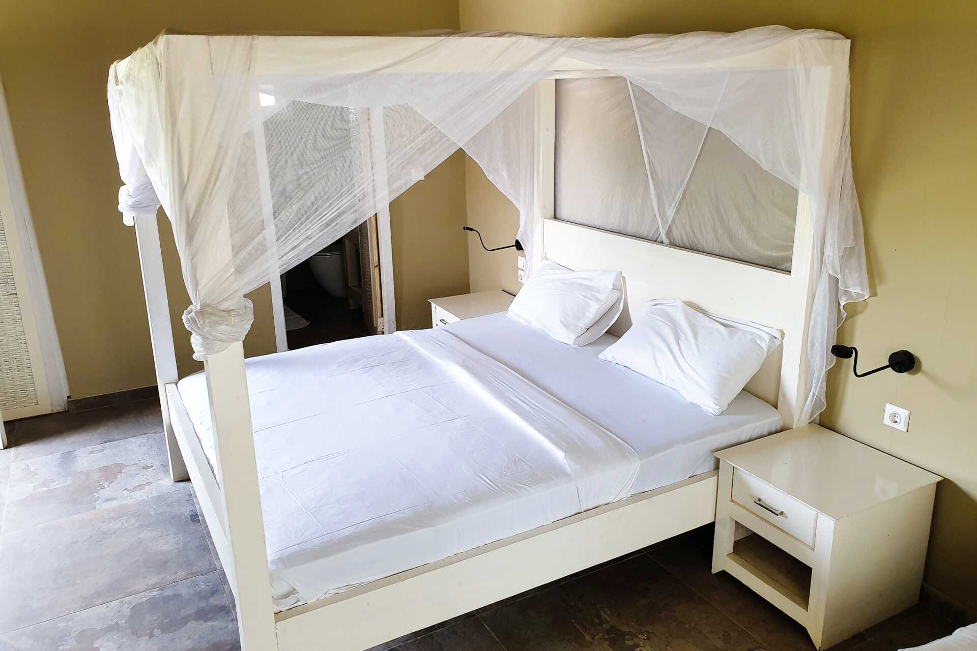 Dobbeltrom med balkong eller terrasse, noen med havutsikt. Rommene ligger i toetasjes bygninger med fire rom i hvert hus i hotellets hage. En dobbeltseng. Myggnett over sengen. Wifi, luftkondisjonering og safe inkludert. Takvifte. Kjøleskap. Vannkoker samt kaffe og te. TV. Hårføner, bad med dusj og wc. Rengjøring 7 ggr/uke.