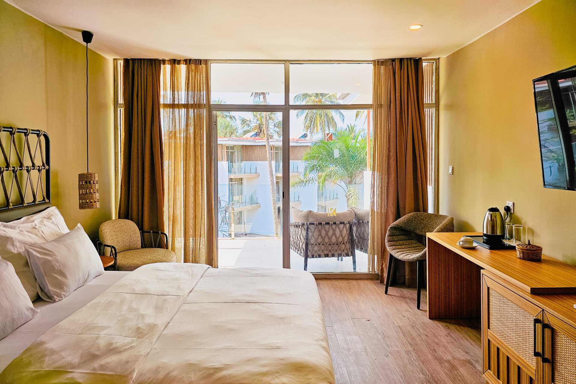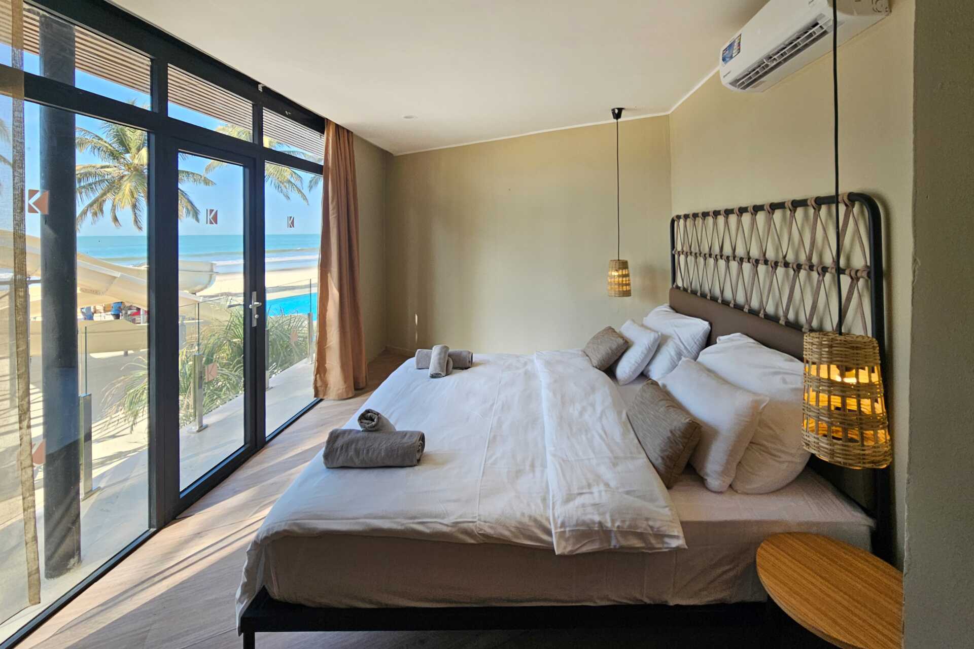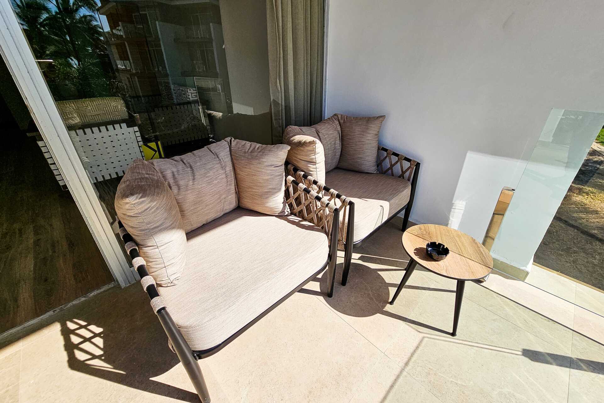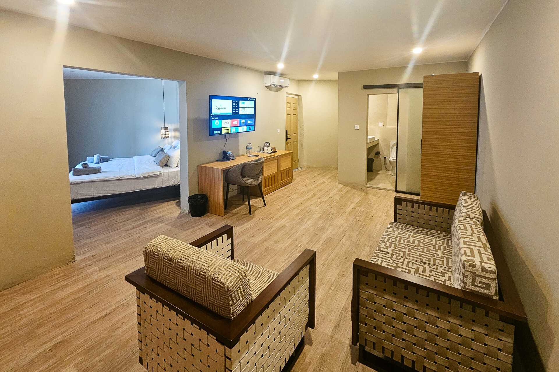 Suite med balkong og havutsikt. Suiten består av et soverom og en stue i åpen planløsning. En dobbeltseng. Mulig med ekstraseng i feltseng. Wifi, luftkondisjonering og safe inkludert. Kjøleskap. Vannkoker samt kaffe og te. TV. Hårføner. Dusj og wc. Rengjøring 7 ggr/uke.