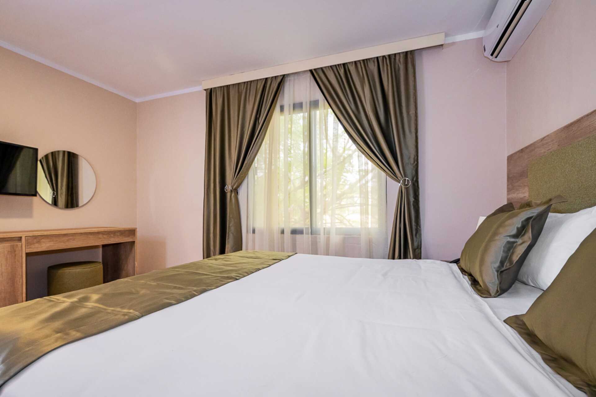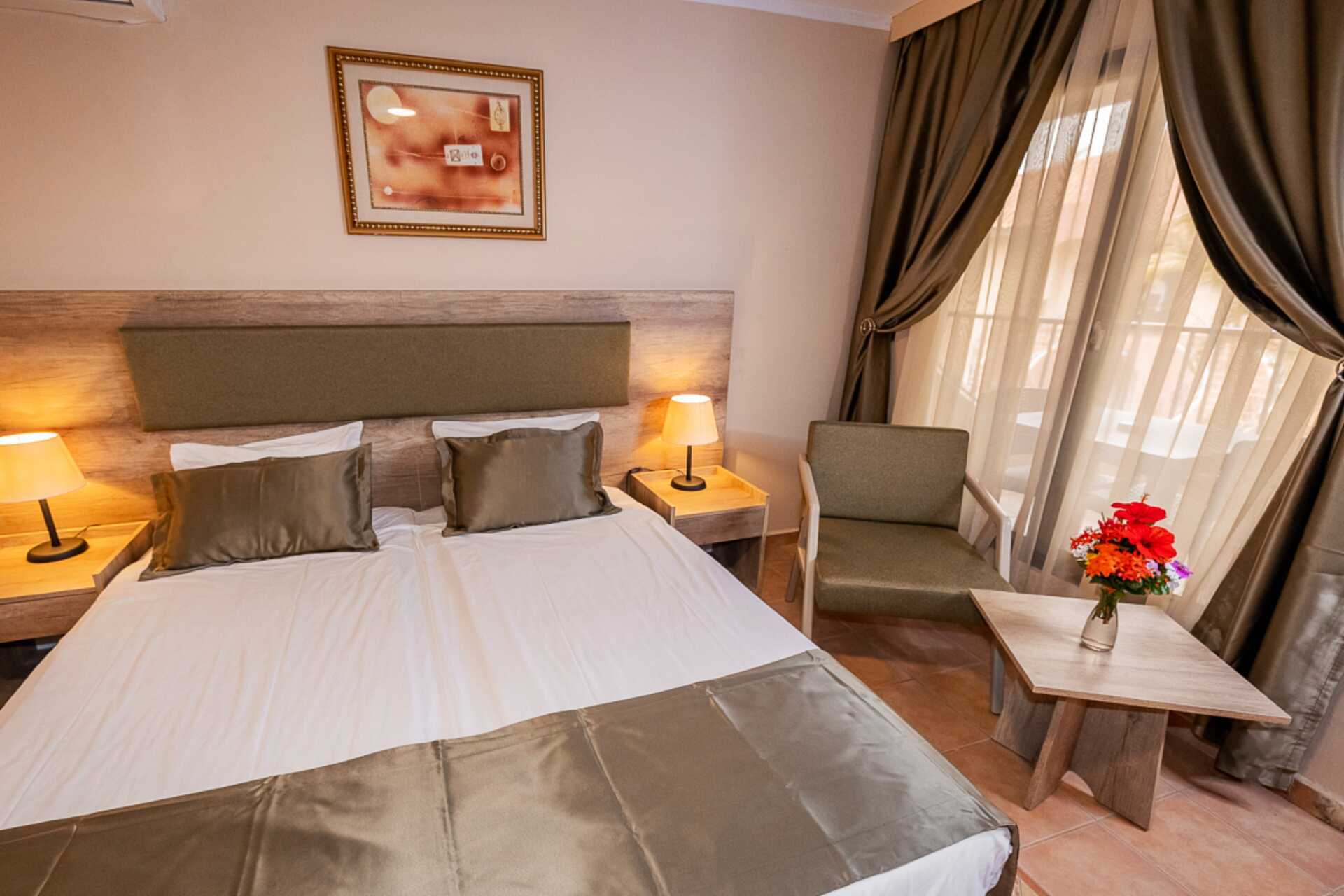 Deluxerom med balkong eller terrasse. En dobbeltseng eller to enkeltsenger. Mulig med en ekstraseng i enkeltseng. Wifi, luftkondisjonering og safe inkludert. Kjøleskap. Vannkoker samt kaffe og te. TV. Hårføner, bad med dusj og wc. Rengjøring 7 ggr/uke. Myggnetting på alle vinduer.