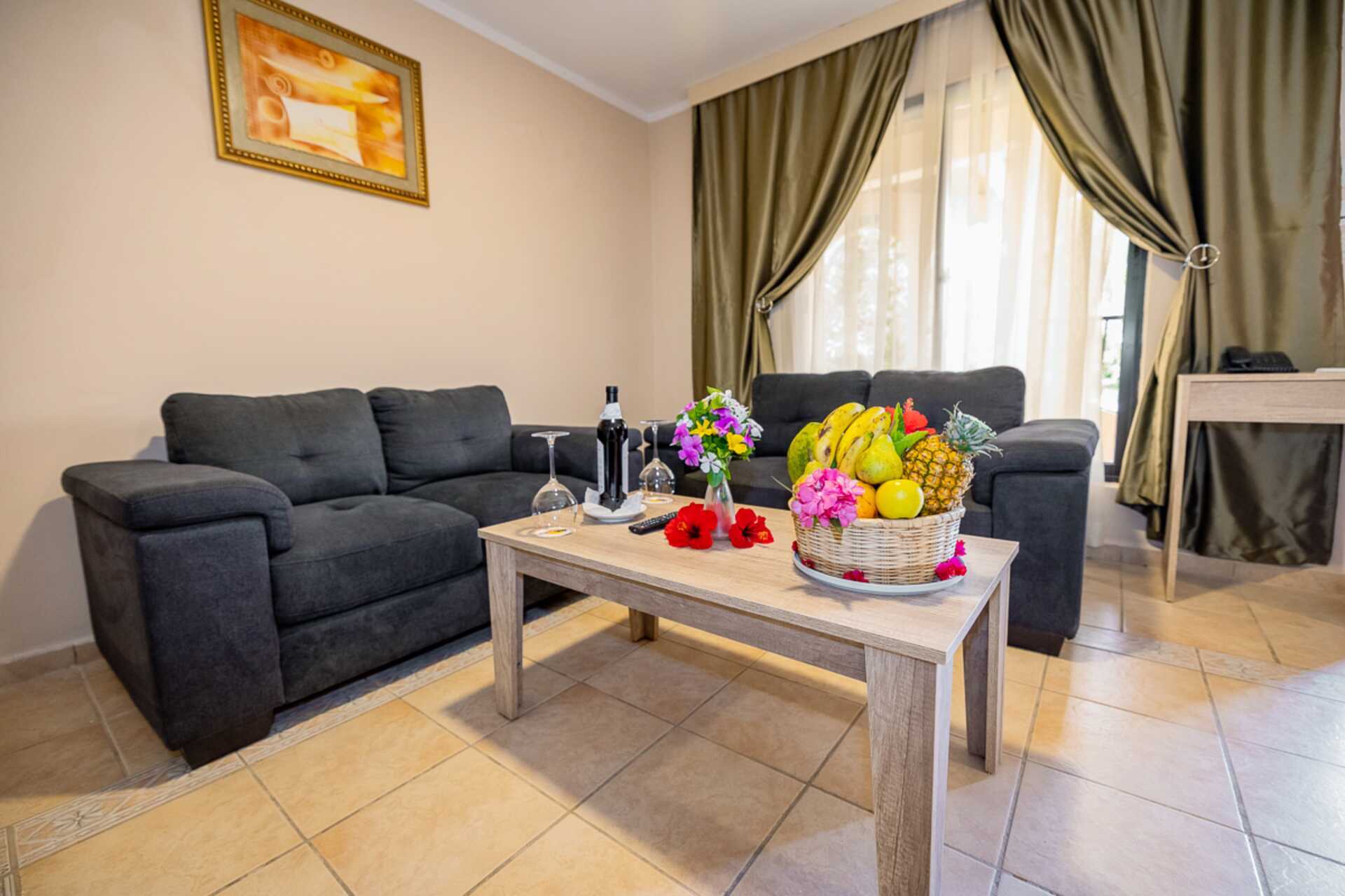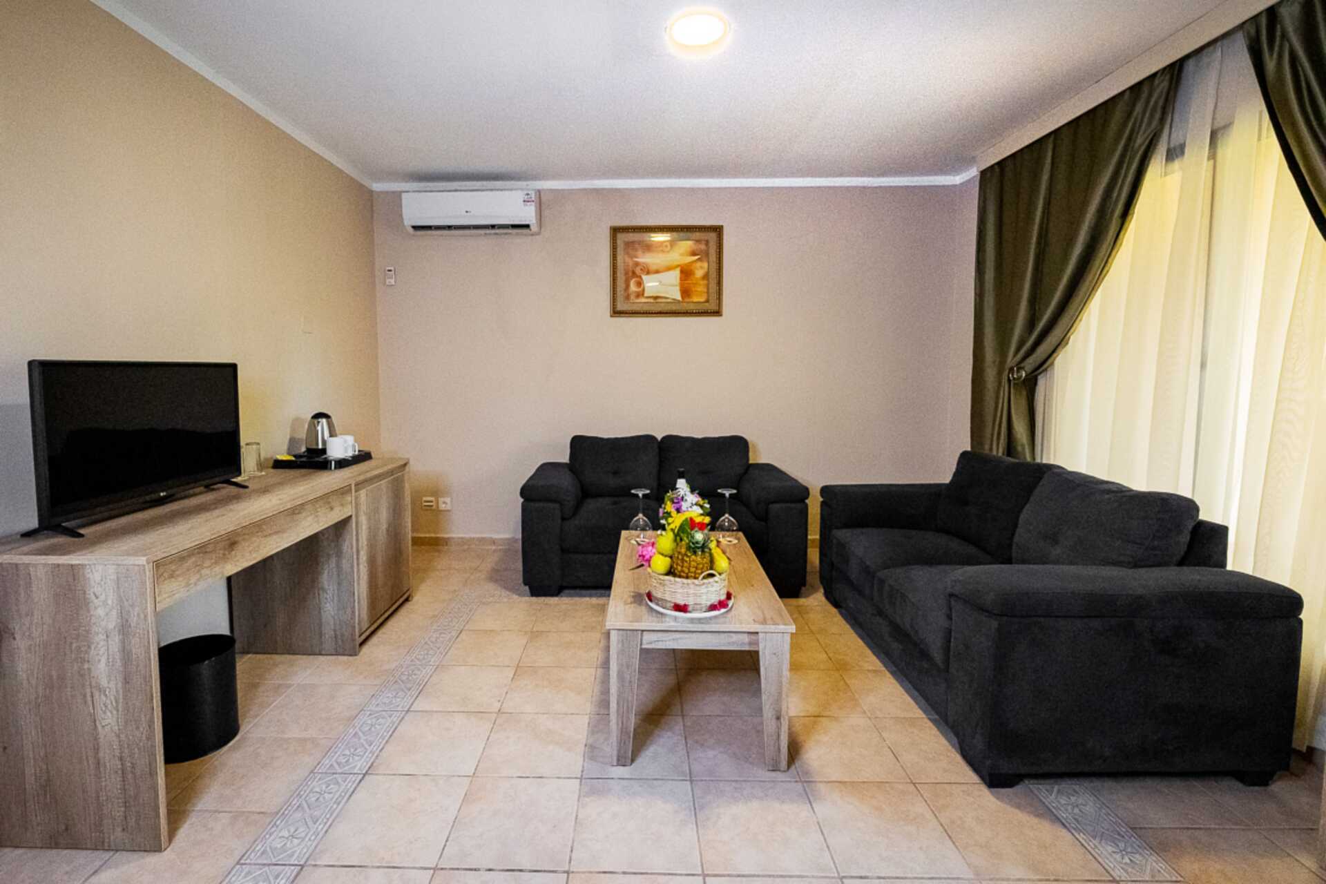 Suite med balkong eller terrasse. Suiten består av et soverom og en stue. En dobbeltseng. Mulig med en ekstraseng i sovesofa. Wifi, luftkondisjonering og safe inkludert. Kjøleskap. Vannkoker samt kaffe og te. TV. Badekåper og tøfler Hårføner. Badekar, dusj og wc. Rengjøring 7 ggr/uke. Myggnett er tilgjengelig på alle vinduer.