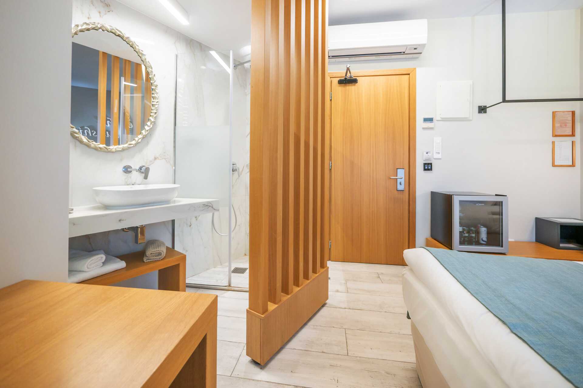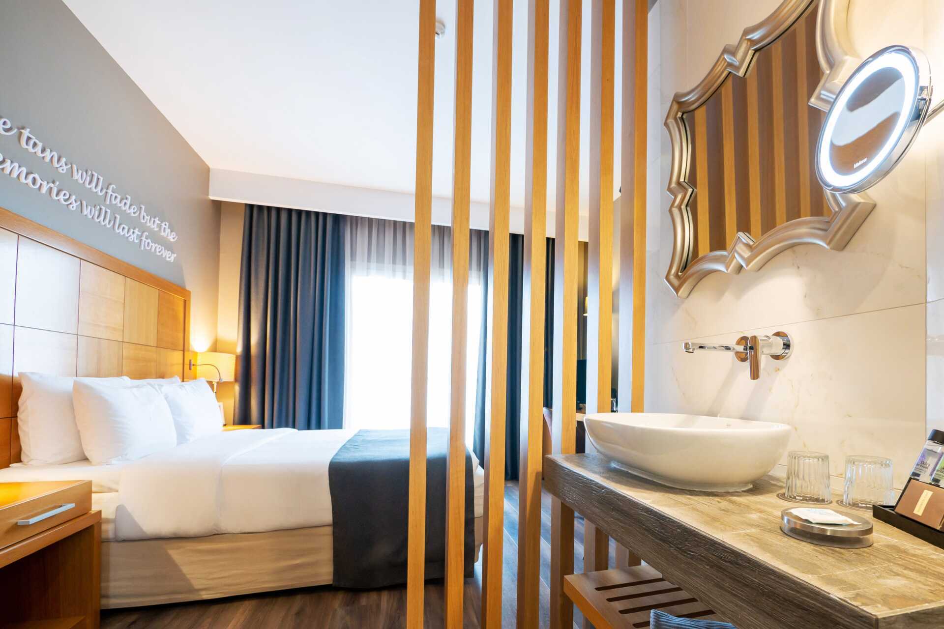 Dobbeltrom med balkong, noen med havutsikt. En dobbeltseng eller to enkeltsenger. Wifi, luftkondisjonering og safe inkludert. Minibar. Vannkoker samt kaffe og te. TV. Rengjøring 6 ggr/uke. Hårføner. Dusj og wc. Barn under 2 år regnes inn i maksantallet i rommet.