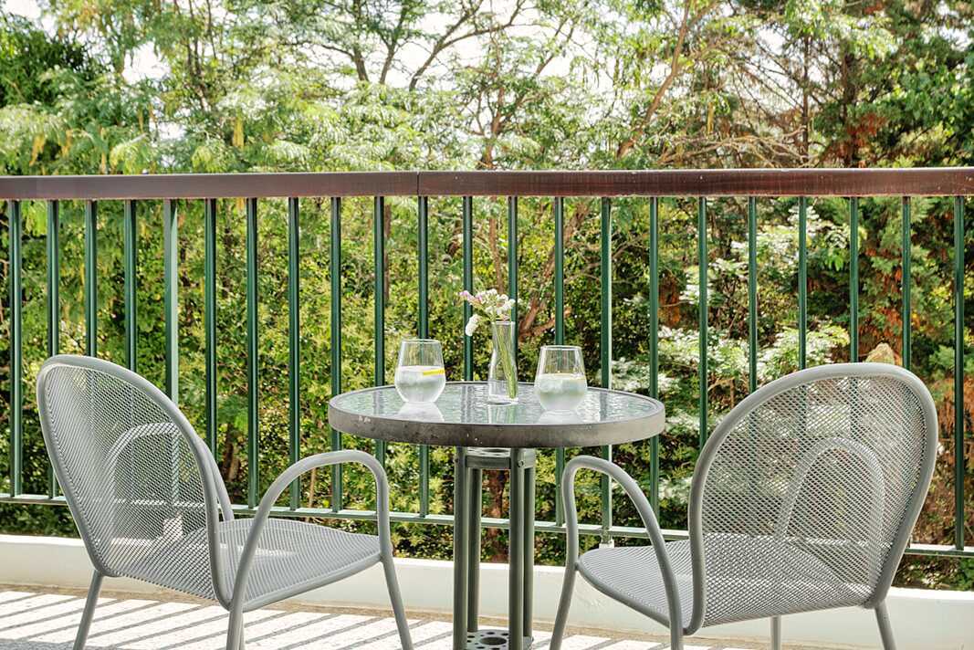 Dobbeltrom med balkong og utsikt til hagen. To enkeltsenger. Mulig med ekstraseng i enkeltseng. Wifi, luftkondisjonering og safe inkludert. Kjøleskap. TV. Vegg-til-vegg-teppe. Badekåper. Hårføner. Badekar eller dusj samt wc. Rengjøring 7 ggr/uke.