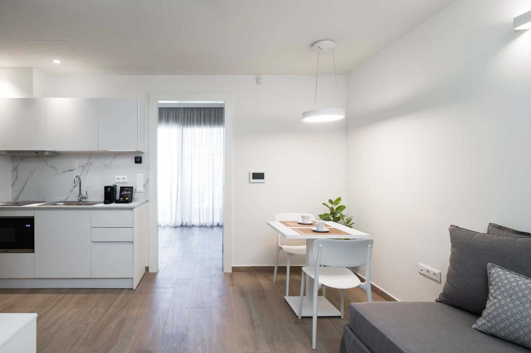 Toromsleilighet med balkong. Et soverom og stue med minikjøkken. En dobbeltseng. Mulig med ekstrasenger i sovesofa. Minikjøkken med kokeplater, mikrobølgeovn, kjøleskap, vannkoker, brødrister, Nespresso kaffemaskin, oppvaskmaskin og enkelt kjøkkenutstyr. Wifi, luftkondisjonering og safe inkludert. TV. Vaskemaskin. Strykejern og strykebrett. Badekåper og tøfler Hårføner. Dusj og wc. Rengjøring 6 ggr/uke. Barn under 2 år regnes inn i maksantallet i rommet.