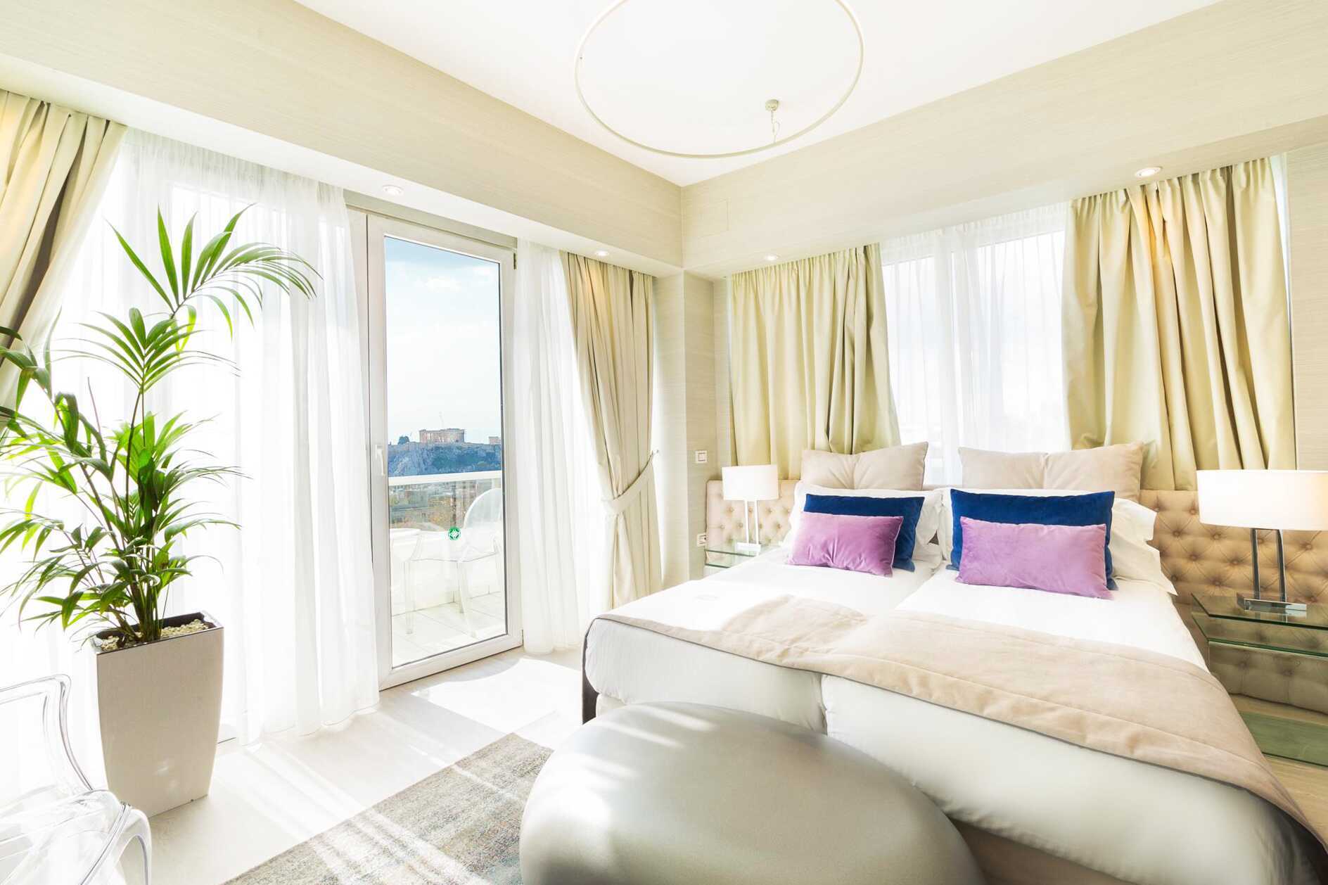 Superiorrom med balkong og utsikt over Akropolis. En dobbeltseng eller to enkeltsenger. Mulig med ekstraseng i sovesofa. Wifi, luftkondisjonering og safe inkludert. Minibar. Vannkoker samt kaffe og te. TV. Strykejern og strykebrett. Hårføner. Badekar eller dusj samt wc. Rengjøring 7 ggr/uke.