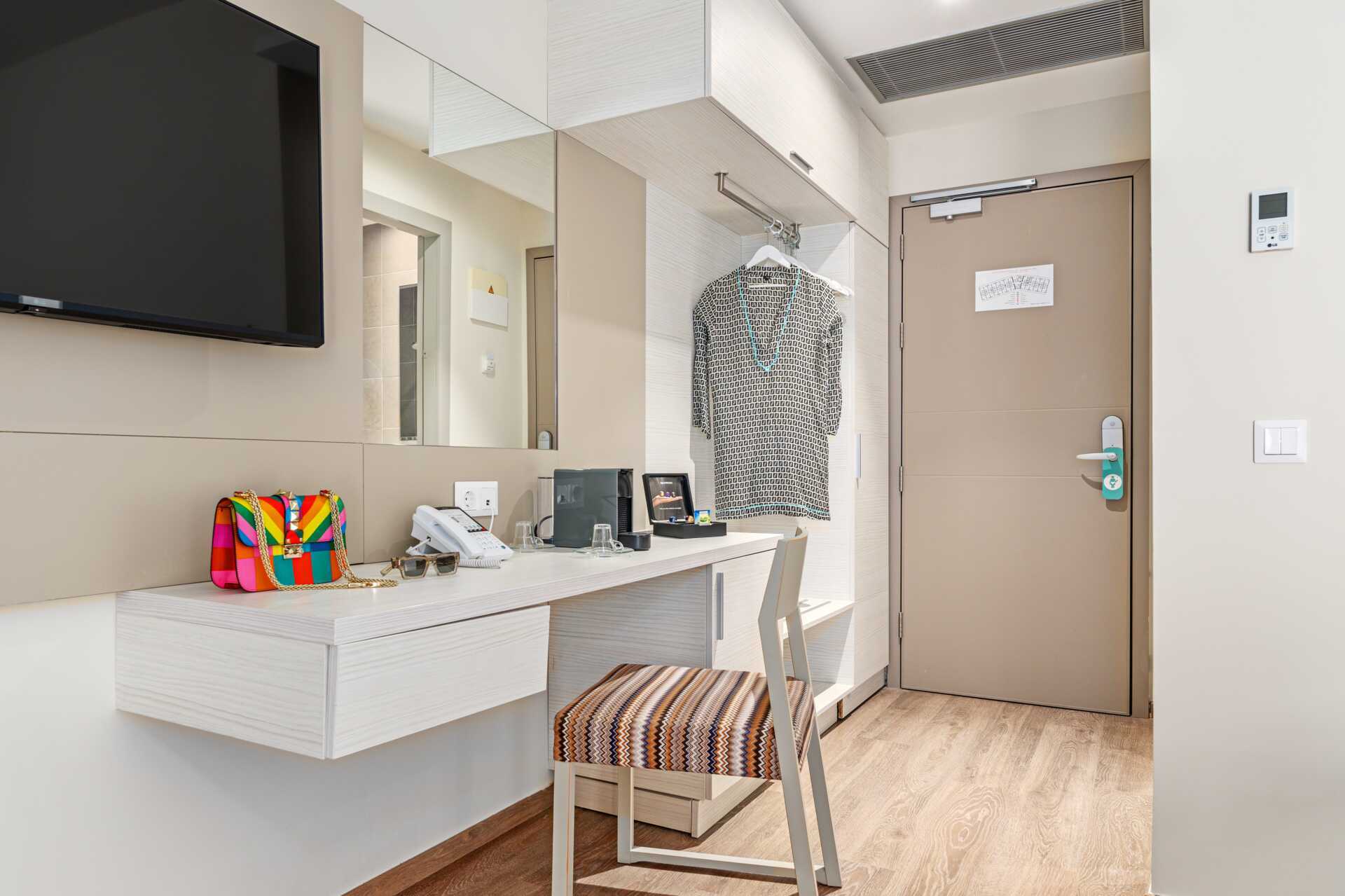 Deluxerom med balkong, noen med havutsikt. En dobbeltseng eller to enkeltsenger. Mulig med en ekstraseng i sovesofa. Putemeny. Wifi, luftkondisjonering og safe inkludert. Kjøleskap. Vannkoker samt kaffe og te. Nespresso kaffemaskin, kapsler inkludert ved ankomst, etterfylles mot avgift. TV. Tøfler. Hårføner. Dusj og wc. Rengjøring 7 ggr/uke.