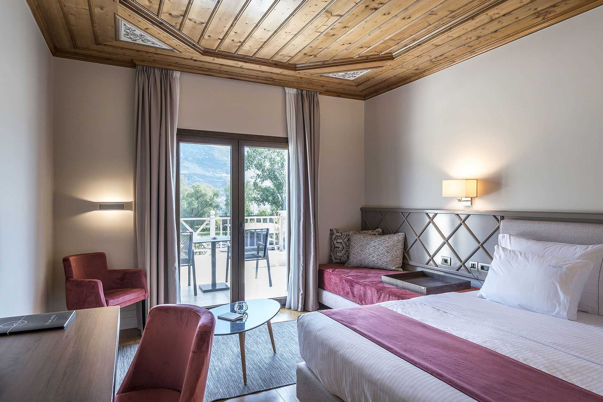 Deluxerom med balkong og utsikt mot innsjøen. En dobbeltseng. Mulig med ekstraseng i sovesofa. Wifi, luftkondisjonering og safe inkludert. Minibar. Vannkoker samt kaffe og te. TV. Badekåper og tøfler. Badekar og dusj samt wc, hårføner. Rengjøring 7 ggr/uke.