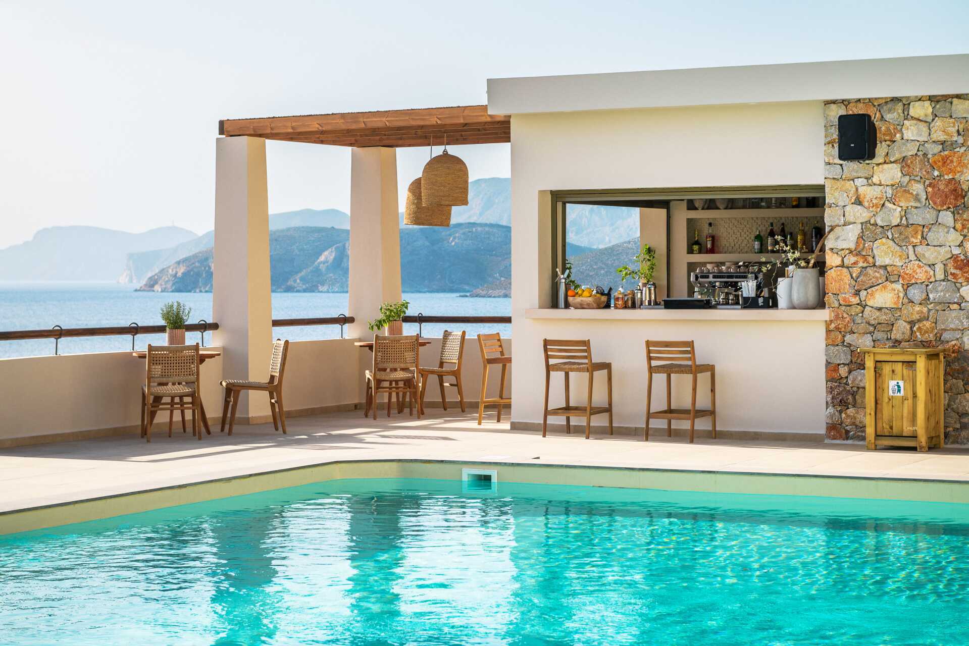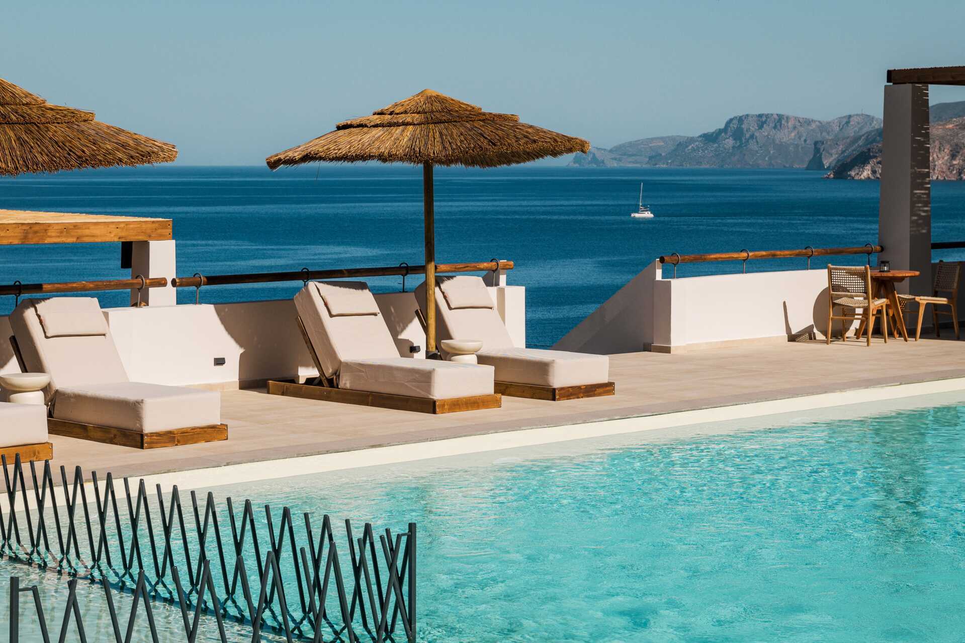 Fint bassengområde med solsenger, parasoller og en magisk utsikt over havet og vulkanøya Telendos.