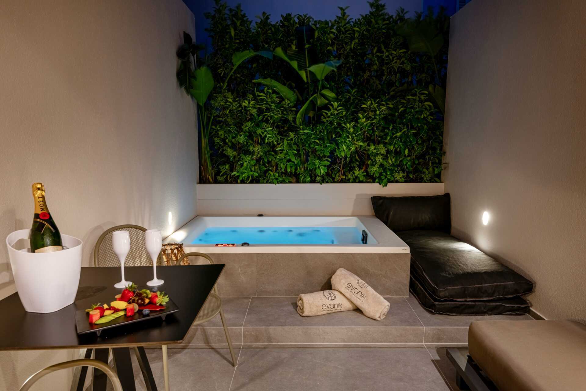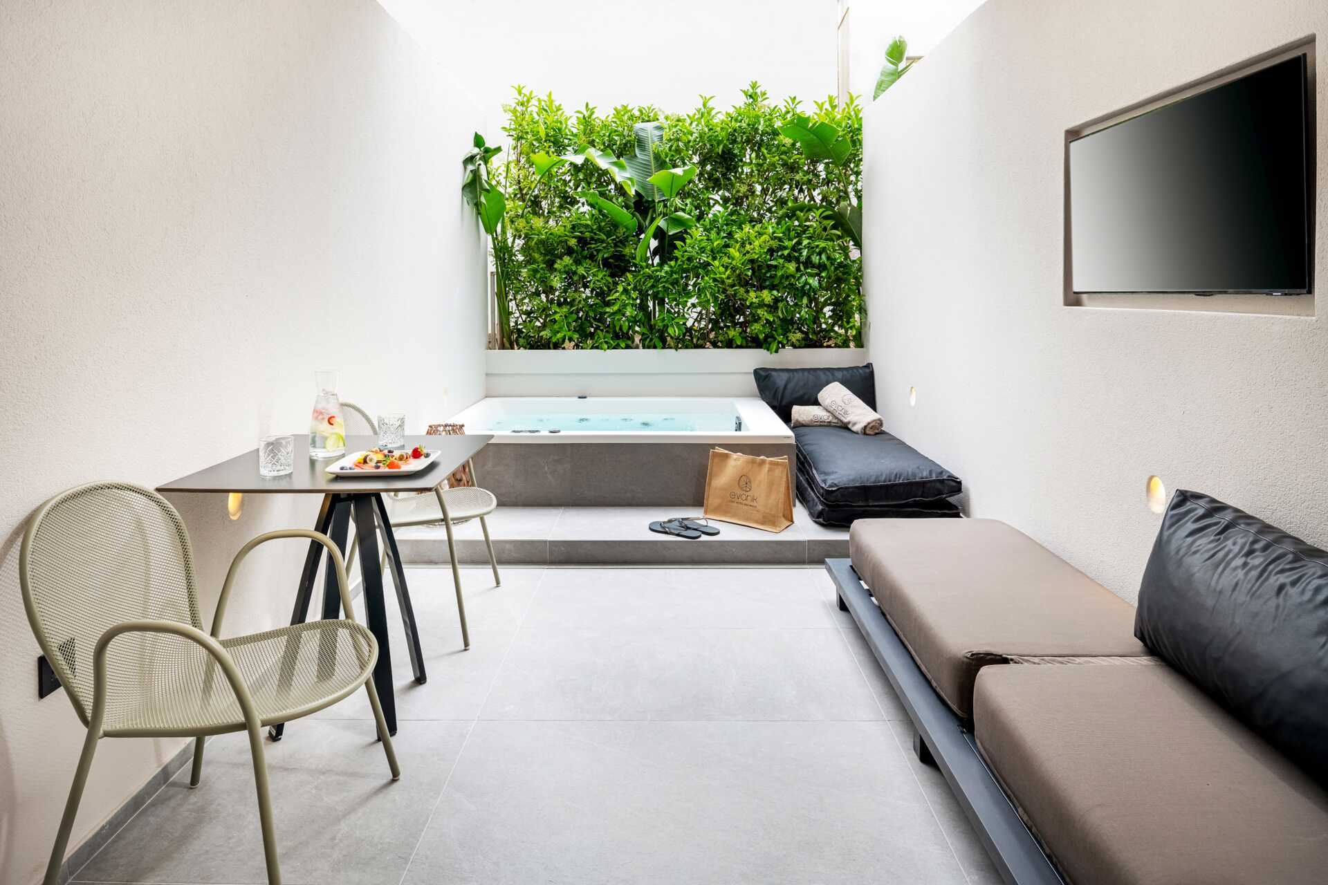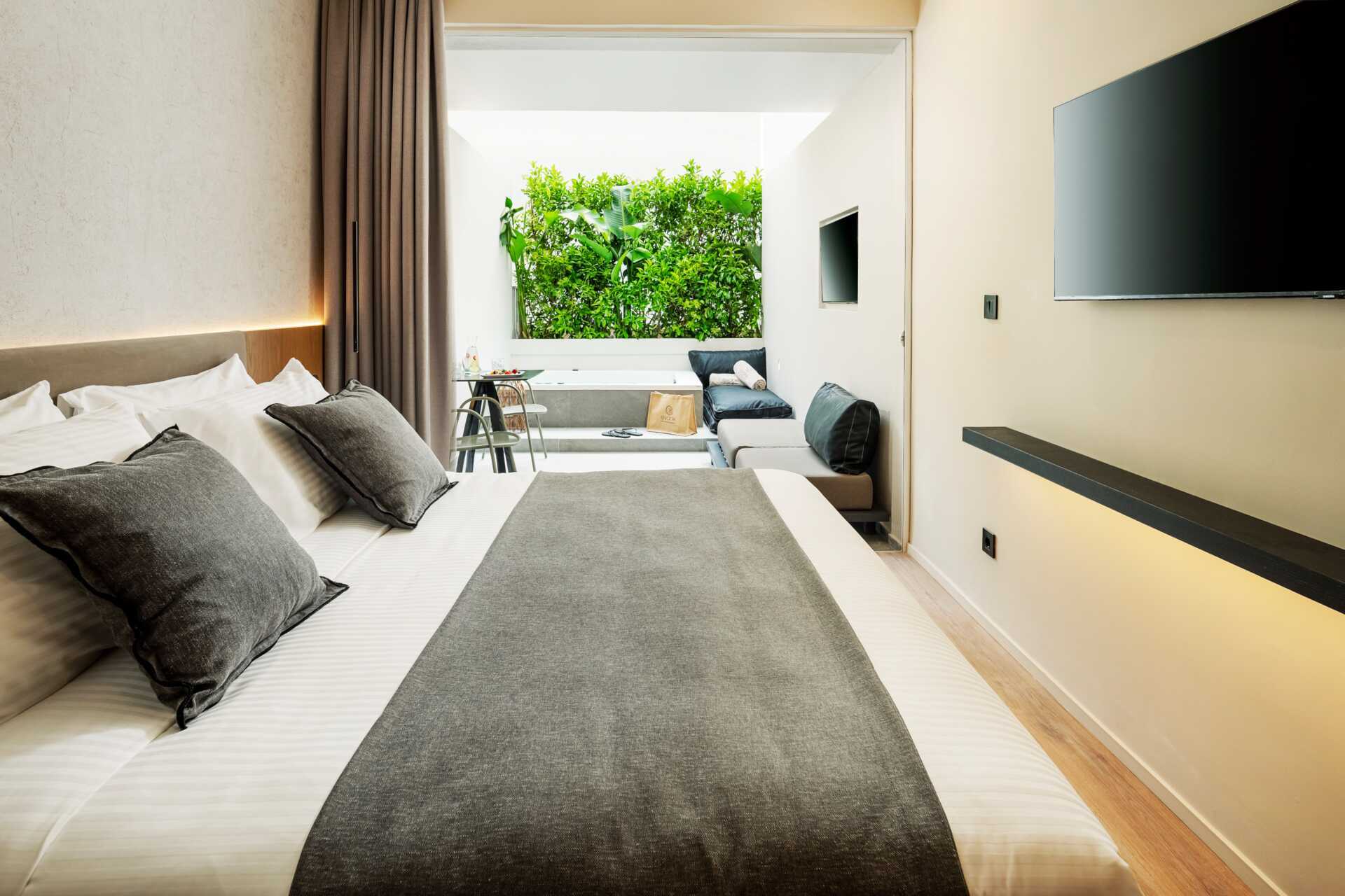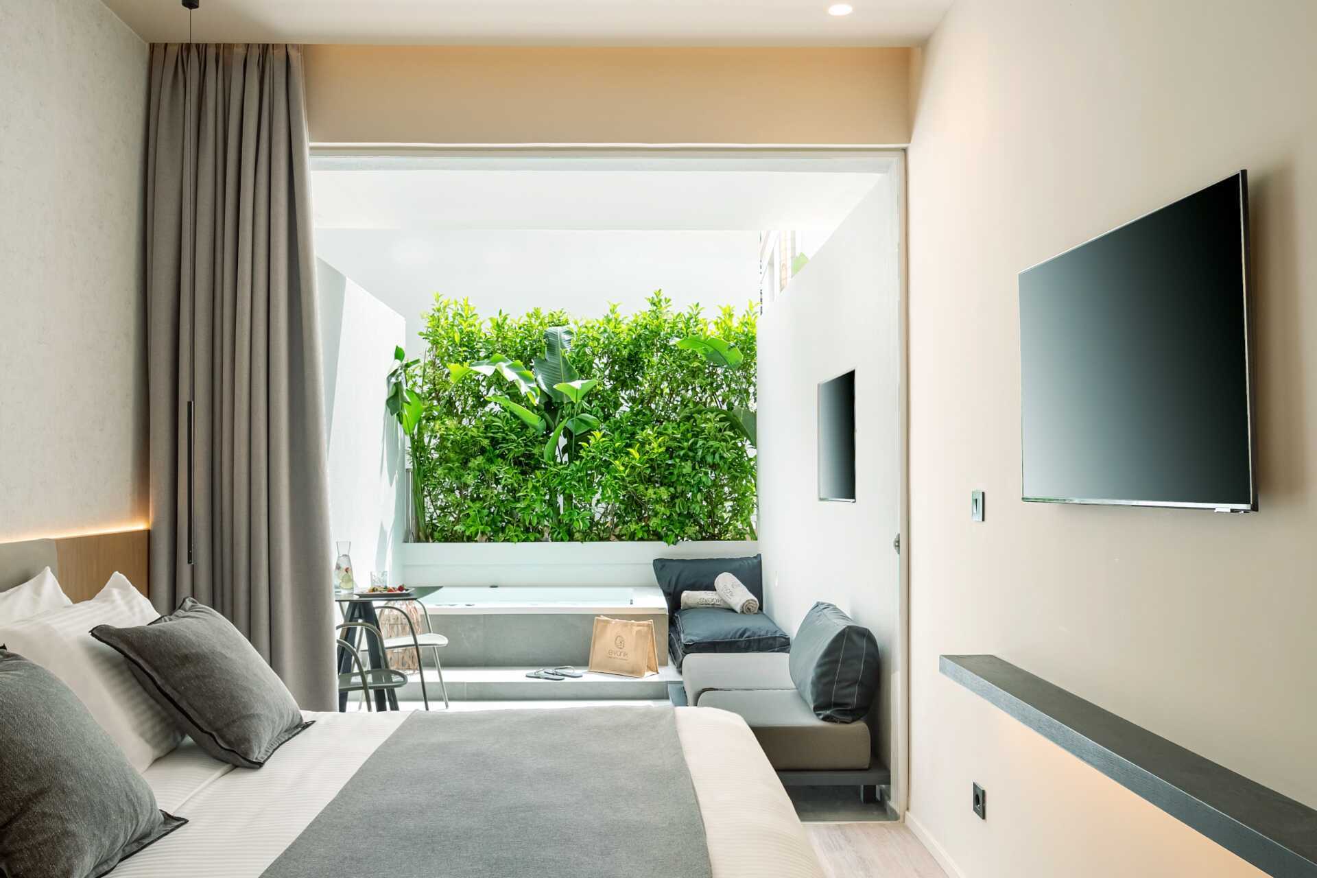 Dobbeltrom med markterrasse. På terrassen er det en jacuzzi, solsenger, stoler og bord. To trinn fra terrassen opp til jacuzzien. En dobbeltseng. Wifi, luftkondisjonering og safe inkludert. Kjøleskap. TV. Kjøleskap. Vannkoker samt kaffe og te. Illy kaffemaskin. Badekåper og tøfler Hårføner. Bad med separat dusj og separat wc. Rengjøring 7 ggr/uke. Barn under 2 år regnes inn i maksantallet i rommet.