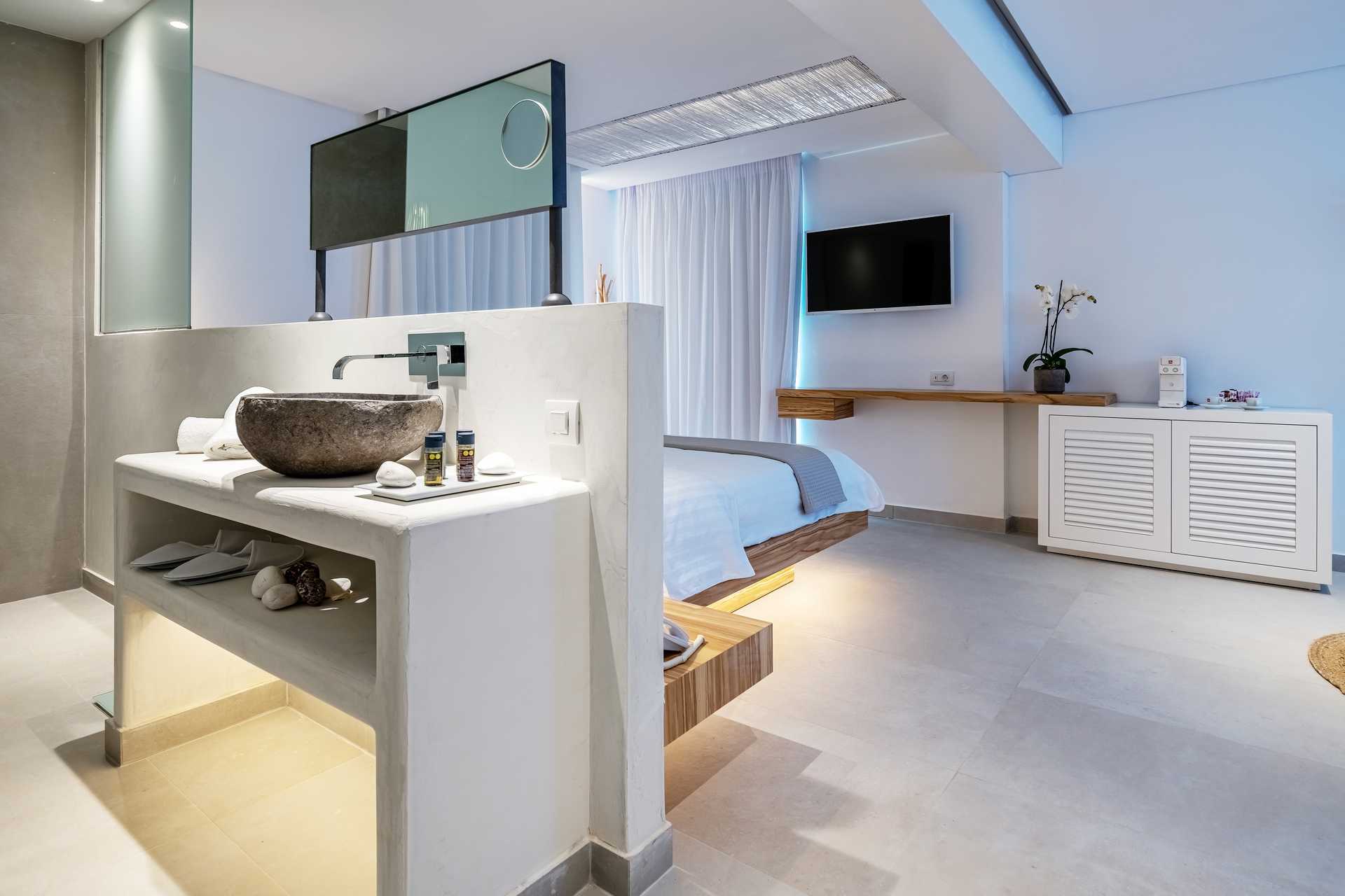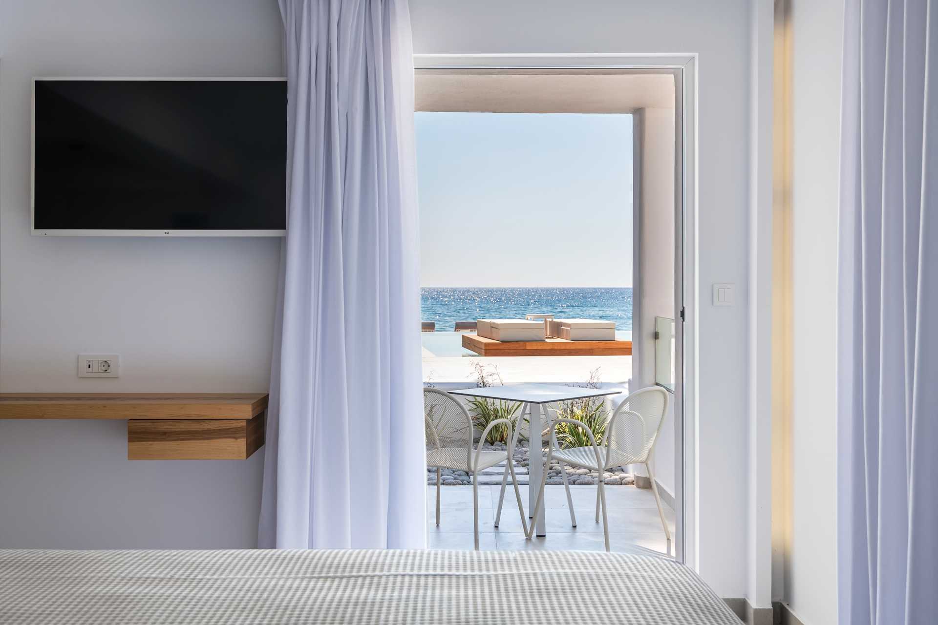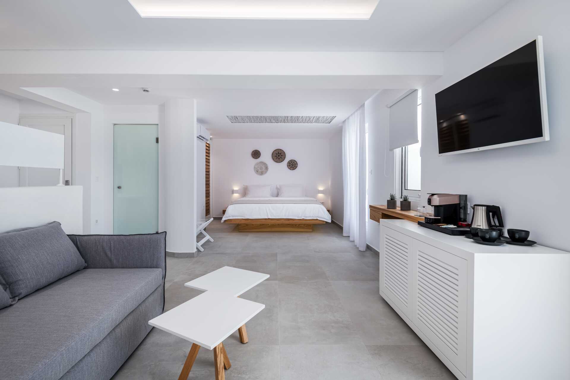 Juniorsuite med balkong eller terrasse, noen med havutsikt. En dobbeltseng. Mulig med ekstrasenger i sovesofa. Wifi, luftkondisjonering og safe inkludert. Kjøleskap. Espressomaskin. Vannkoker samt kaffe og te. TV. Badekåper og tøfler Strandveske med basseng- og badehåndklær samt strandsko. Hårføner. Baderom med dusj og wc. Rengjøring 7 ggr/uke. Barn under 2 år regnes inn i maksantallet i rommet.
