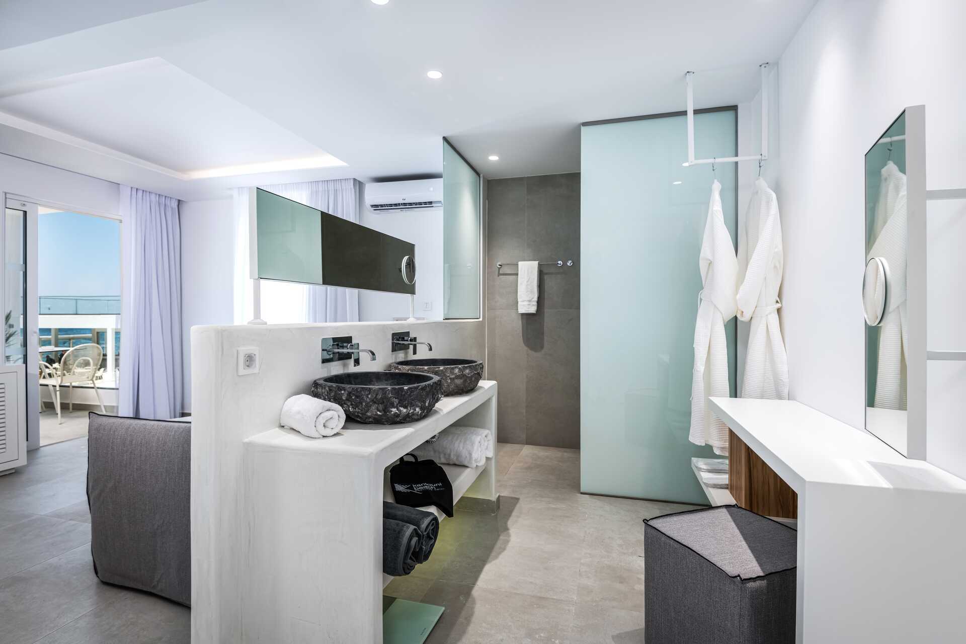 Suite med balkong eller terrasse og havutsikt. Det er en jacuzzi på terrassen. En dobbeltseng. Mulig med ekstrasenger i sovesofa. Wifi, luftkondisjonering og safe inkludert. Kjøleskap. Vannkoker samt kaffe og te. Espressomaskin. TV. Strandveske med basseng- og badehåndklær og strandsko. Badekåper og tøfler Hårføner. Baderom med dusj og wc. Rengjøring 7 ggr/uke. Minimumsalderen for å bo i denne romtypen er 12 år.