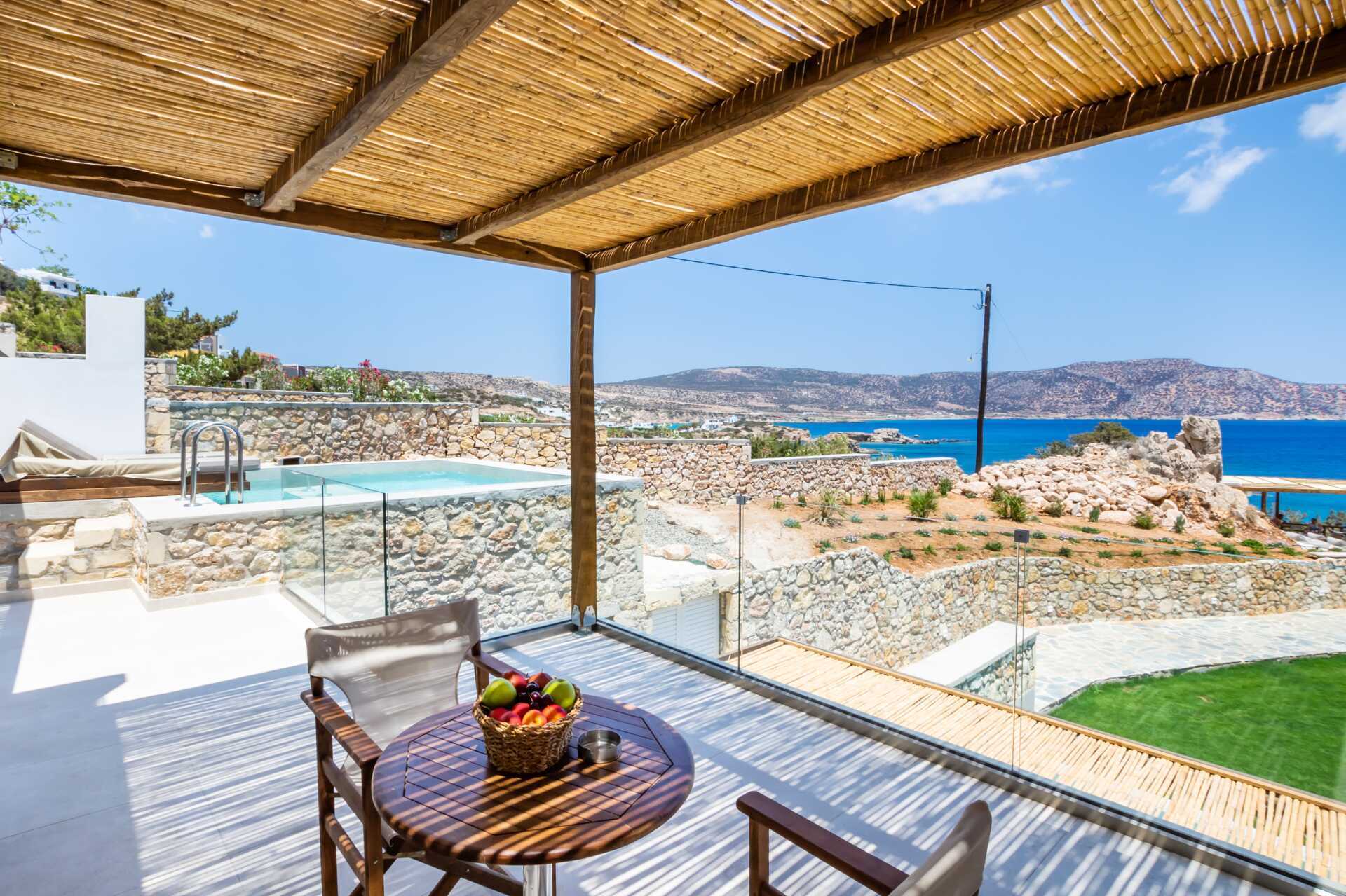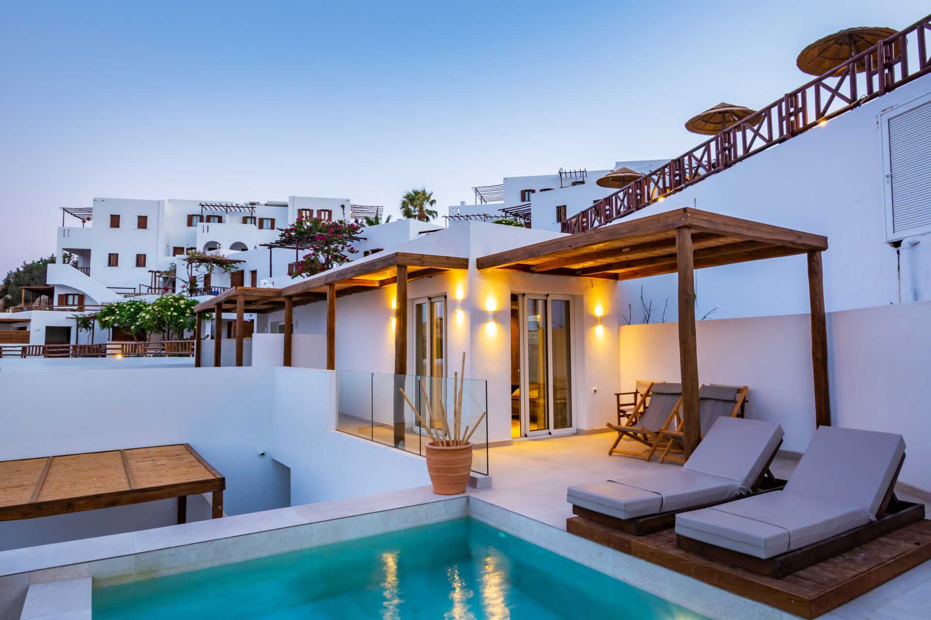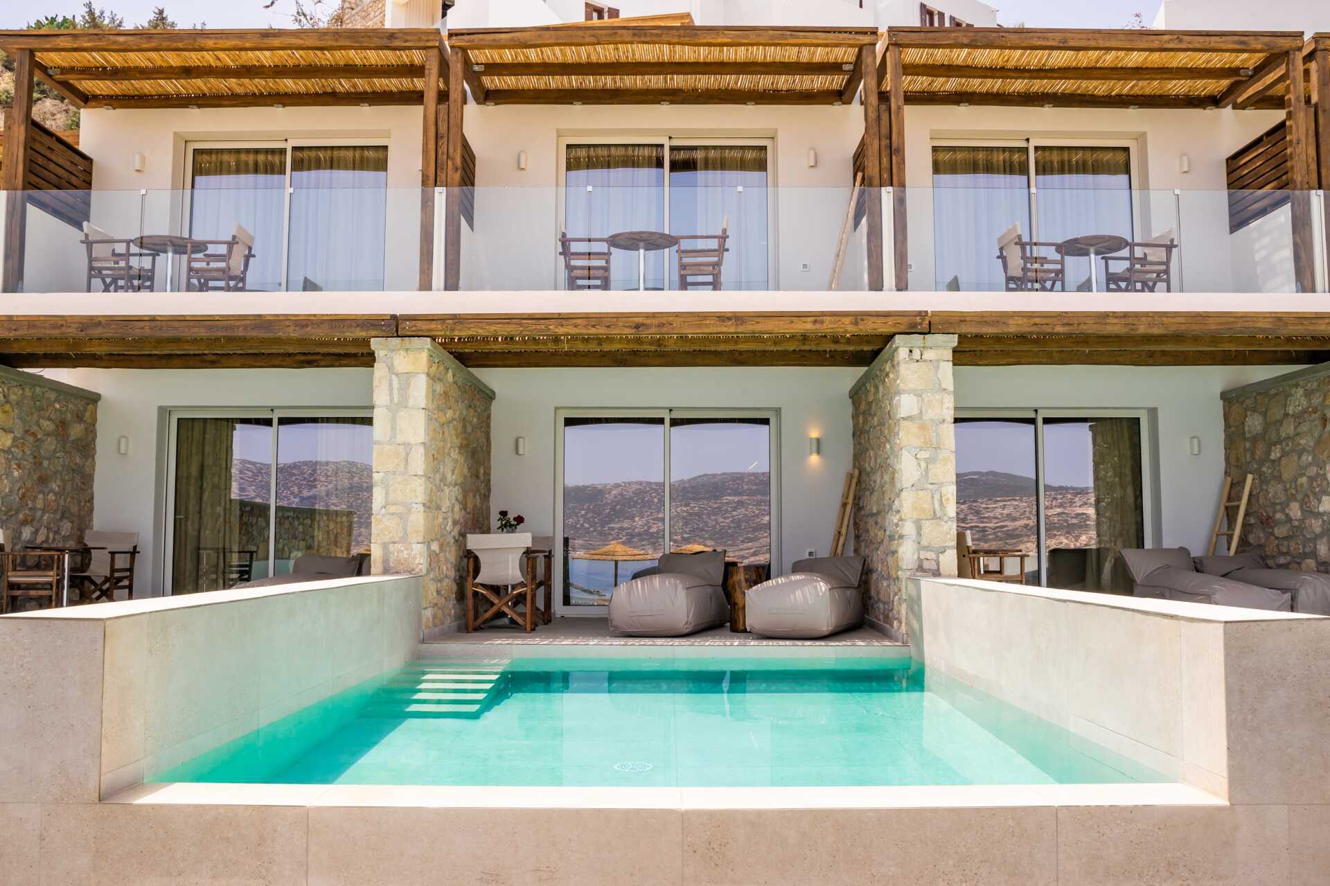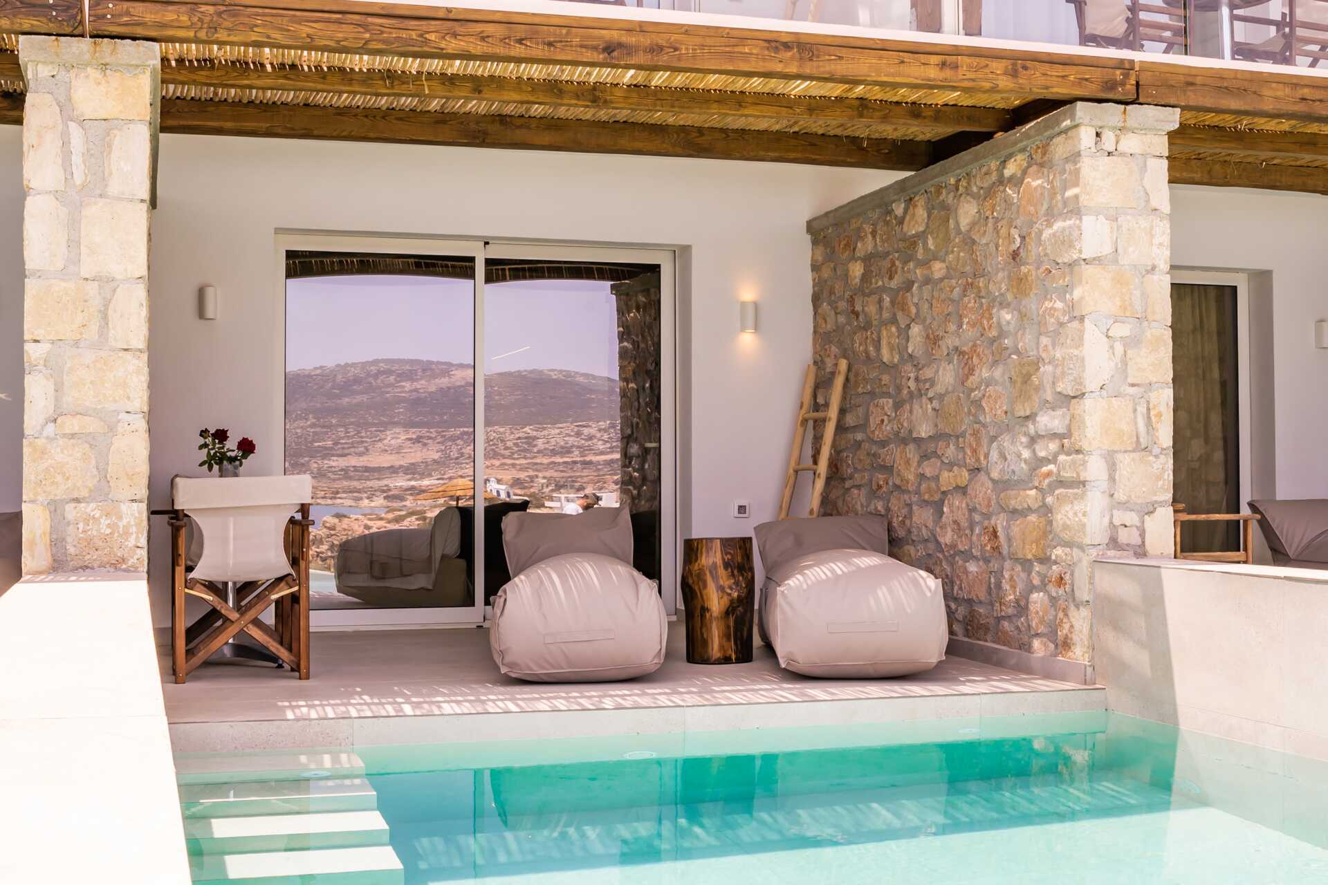 Deluxesuite med eget basseng og havutsikt fra markterrassen. En dobbeltseng. Wifi, safe og luftkondisjonering inkludert. Minibar. Vannkoker samt kaffe og te. Kaffemaskin, fire kaffekapsler inkludert, flere kan kjøpes i hotellbaren. TV. Hårføner. Badekar eller dusj samt wc. Rengjøring 6 ggr/uke.