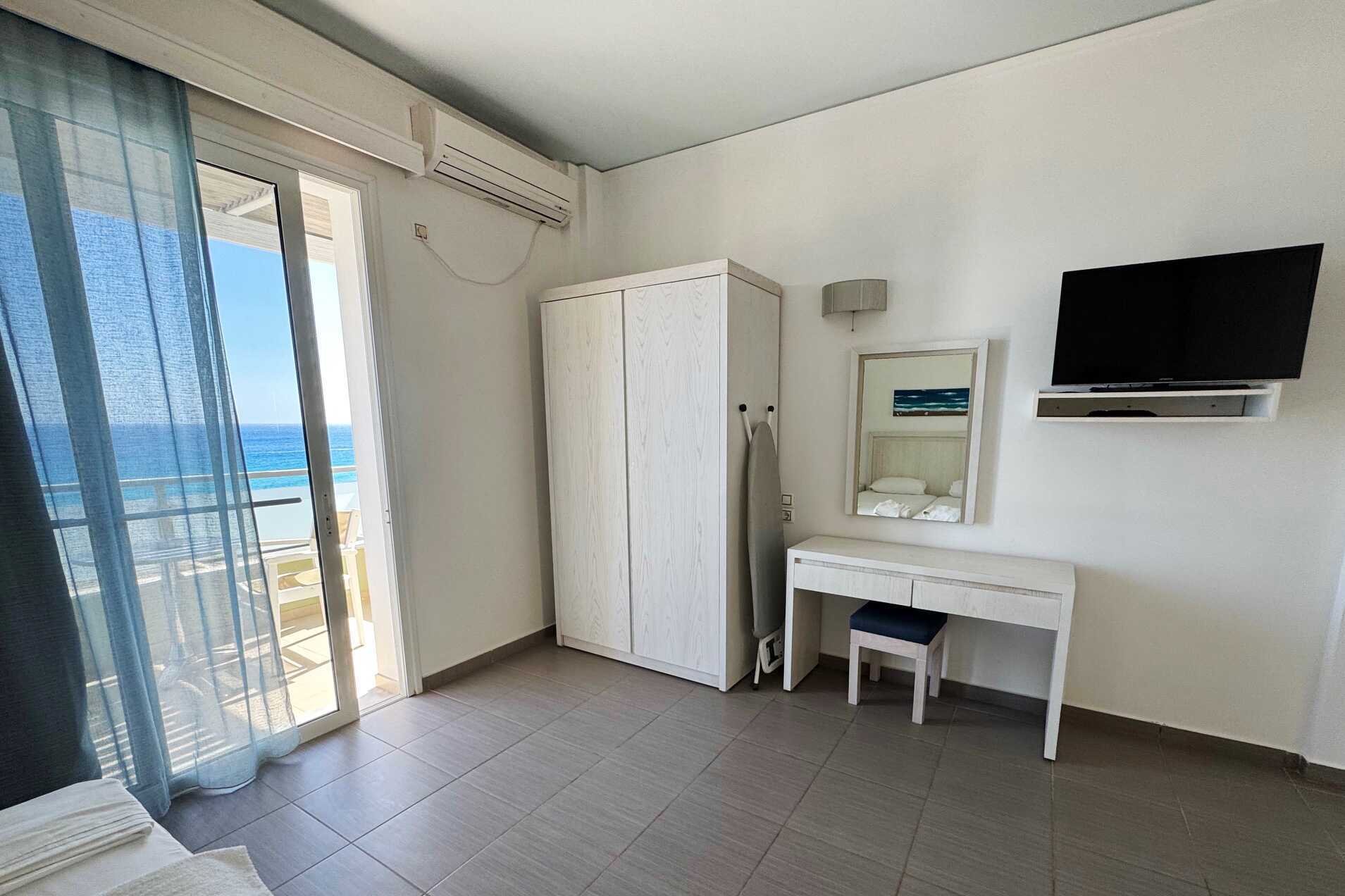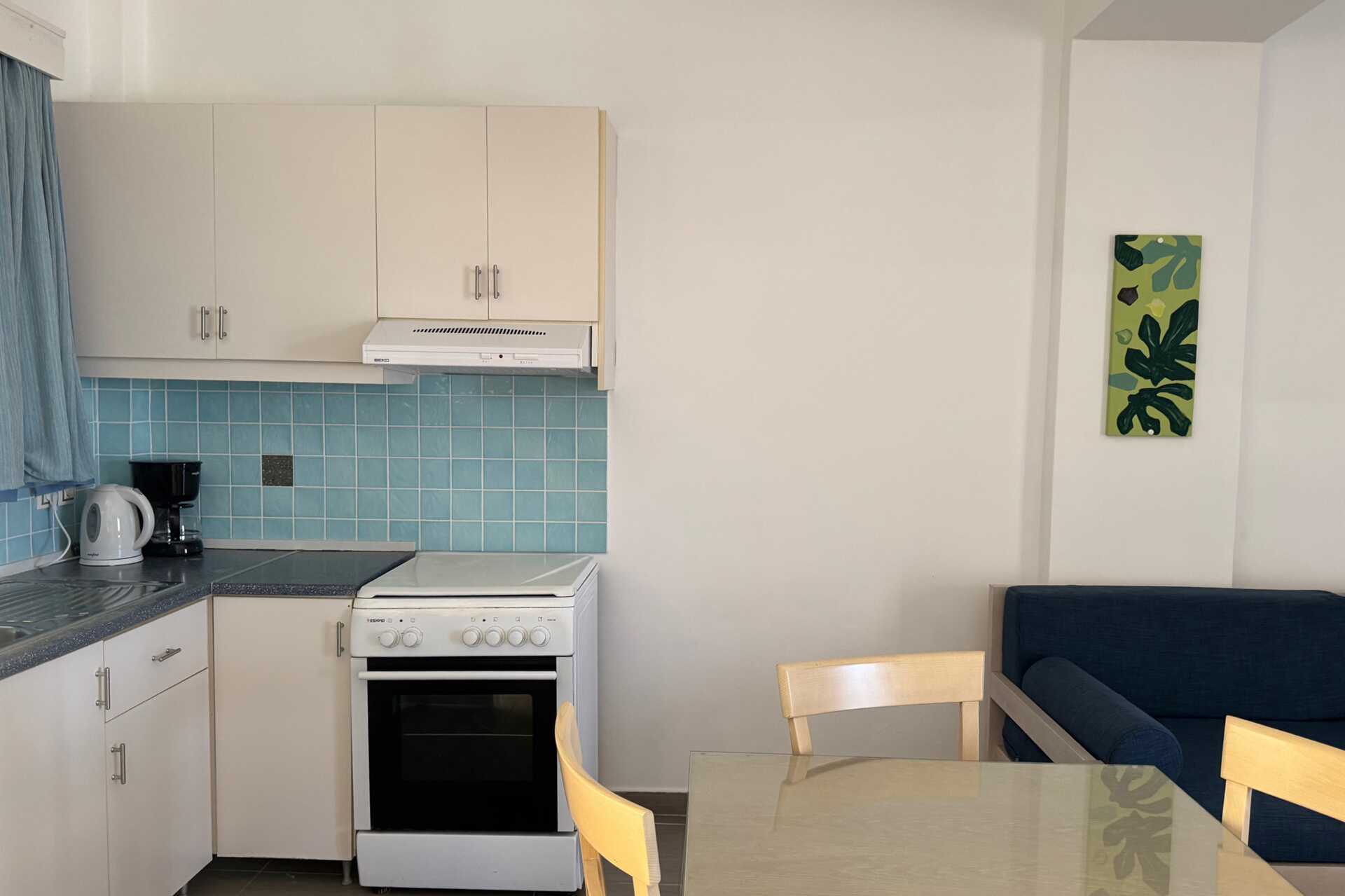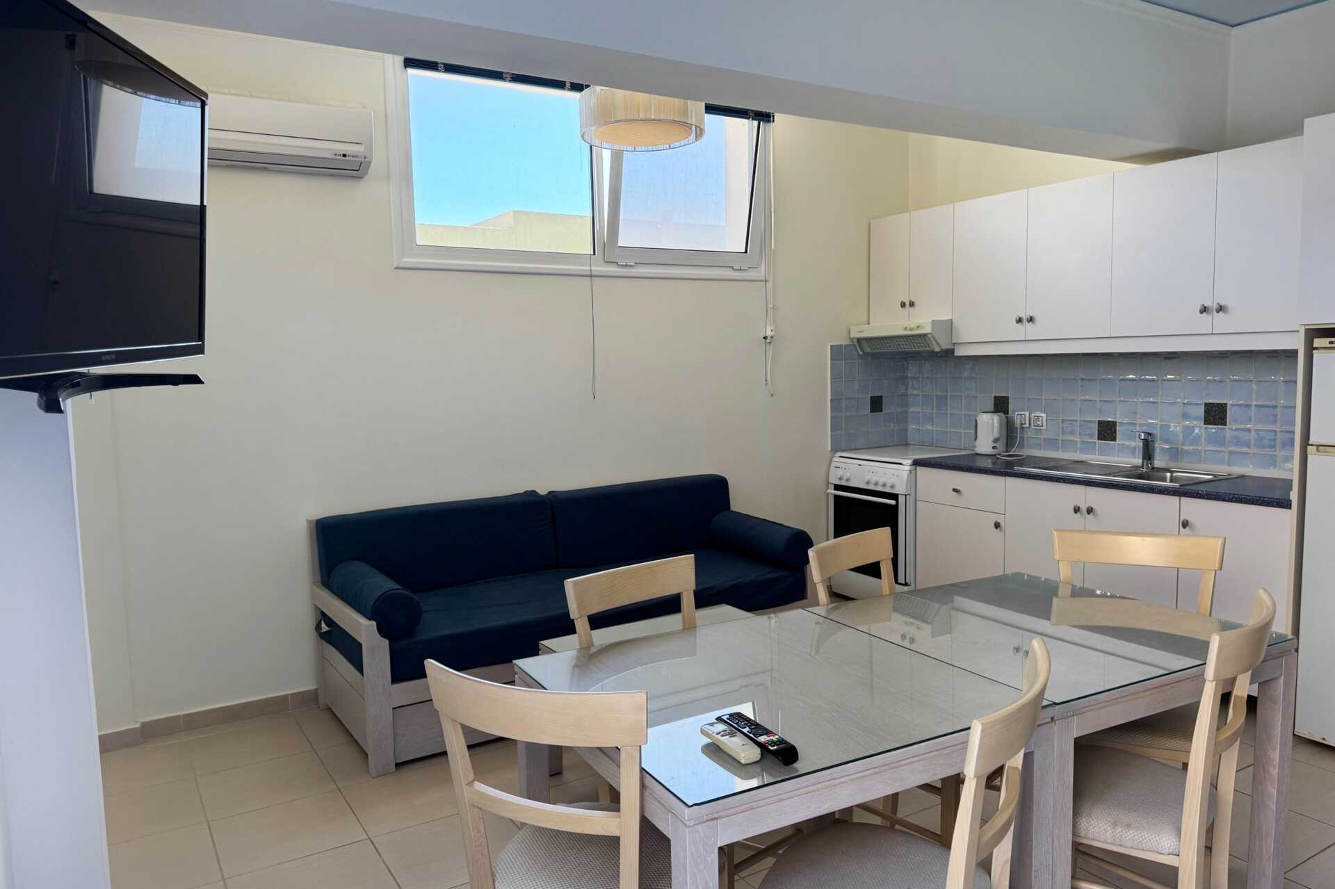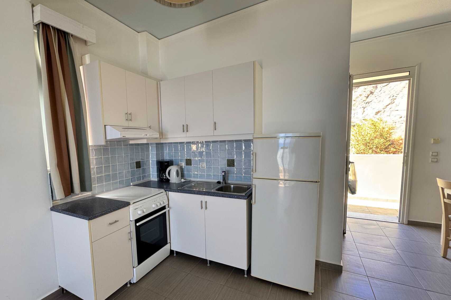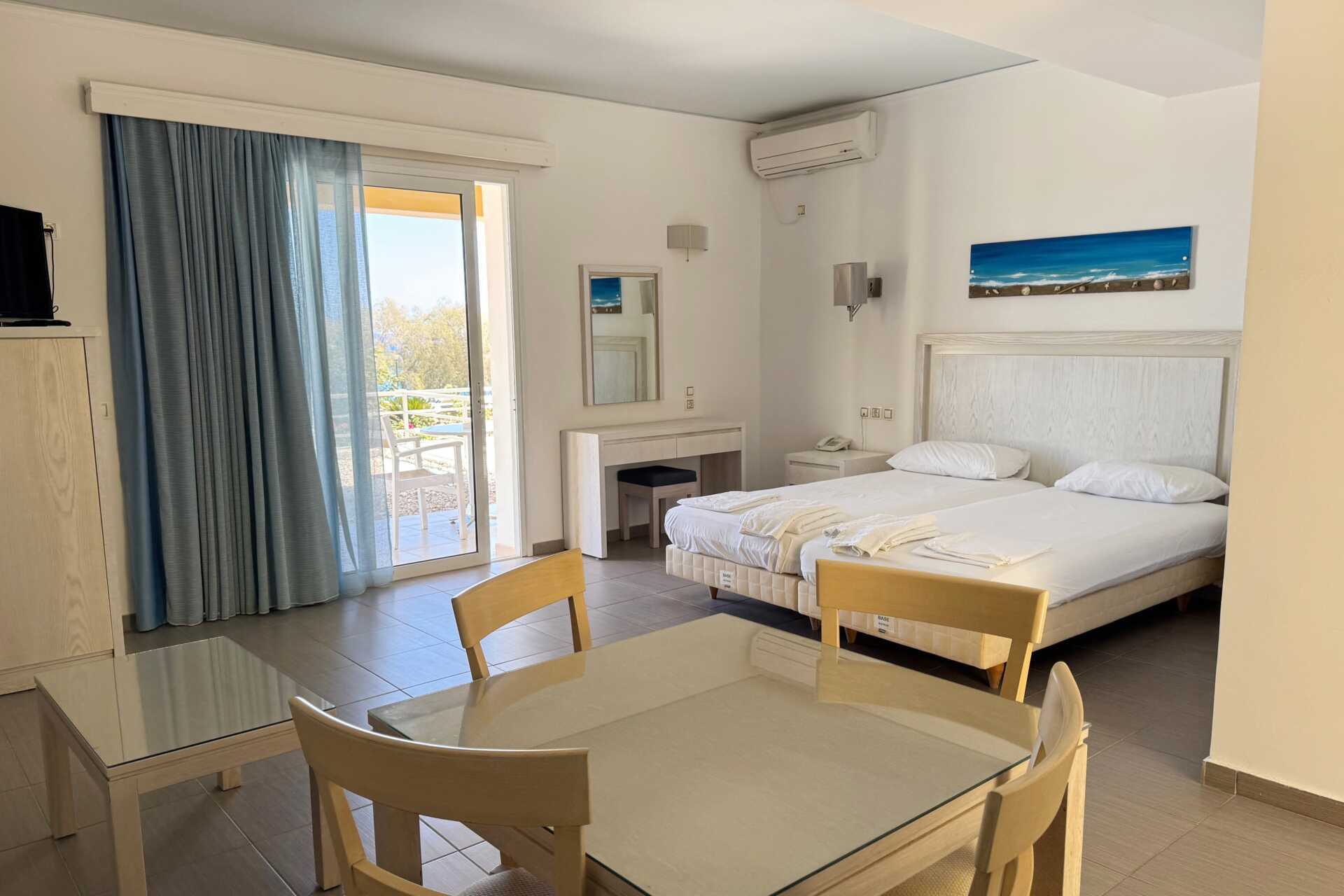 Ettromsleiligheter med balkong eller bakkebalkong og med havutsikt. Kombinert soverom og minikjøkken. En dobbeltseng. Mulig med en ekstraseng i sovesofa. Minikjøkken med stekeovn, komfyr, kjøleskap, kaffetrakter, vannkoker, brødrister, juicer, sandwichgrill, elvisp og enkelt kjøkkenutstyr. Wifi, luftkondisjonering og safe inkludert. TV. Strykejern og strykebrett. Hårføner. Bad med dusj og wc. Rengjøring 6 ggr/uke.