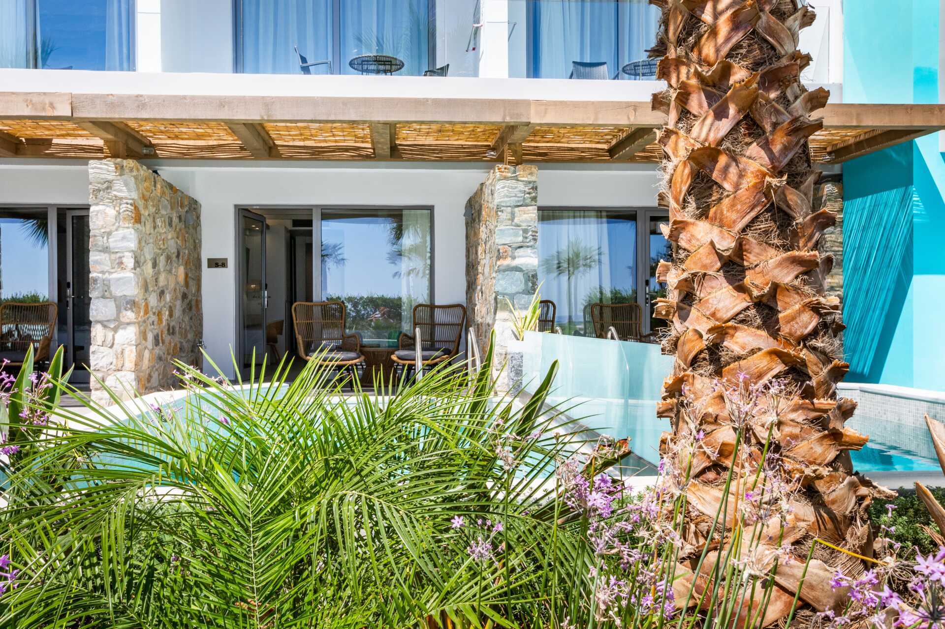 Dobbeltrom på etasje med privat basseng. Markterrasse med utsikt over bassenget. Rommene ble bygget i 2021. I hver etasje er det et soverom. Et soverom med en dobbeltseng og et soverom med to enkeltsenger. I hver etasje er det også bad med dusj og wc. På bakkeplan er det en terrasse og i andre etasje en balkong. Wifi, luftkondisjonering og safe inkludert. Kjøleskap. TV. Hårføner. Badekåper og tøfler Rengjøring 7 ggr/uke. Barn under 2 år regnes inn i maksantallet i rommet.